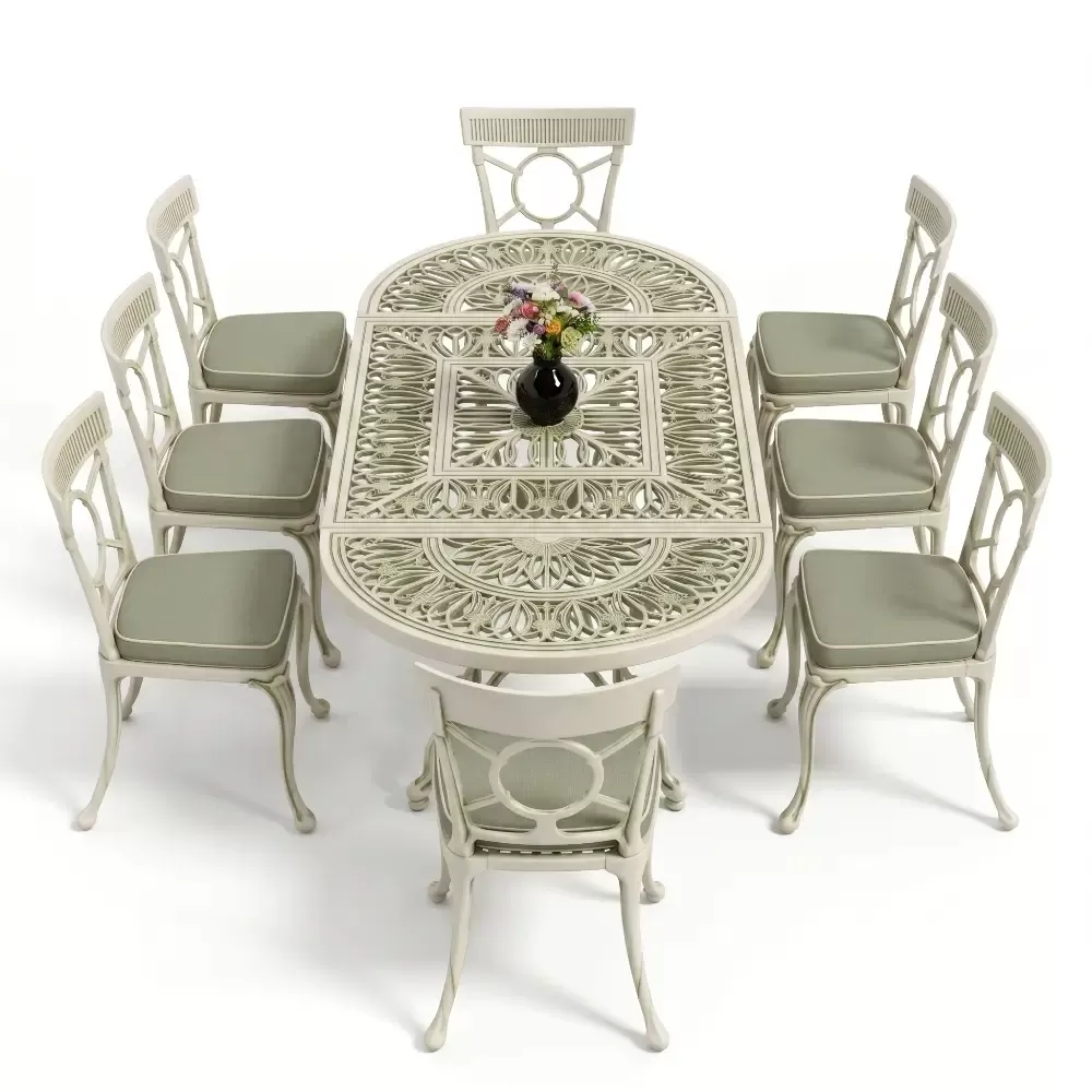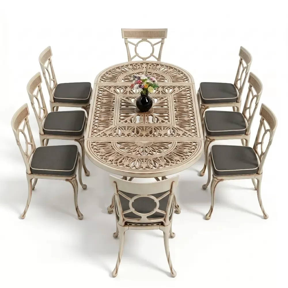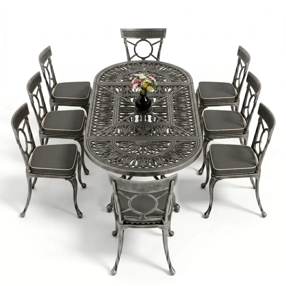 Klasik ferforje ruhunu modern aluminyum dokum teknolojisiyle birlestiren bu ozel takim ile bahce ve teraslarinizda ayricalikli bir oturma alani olusturun.