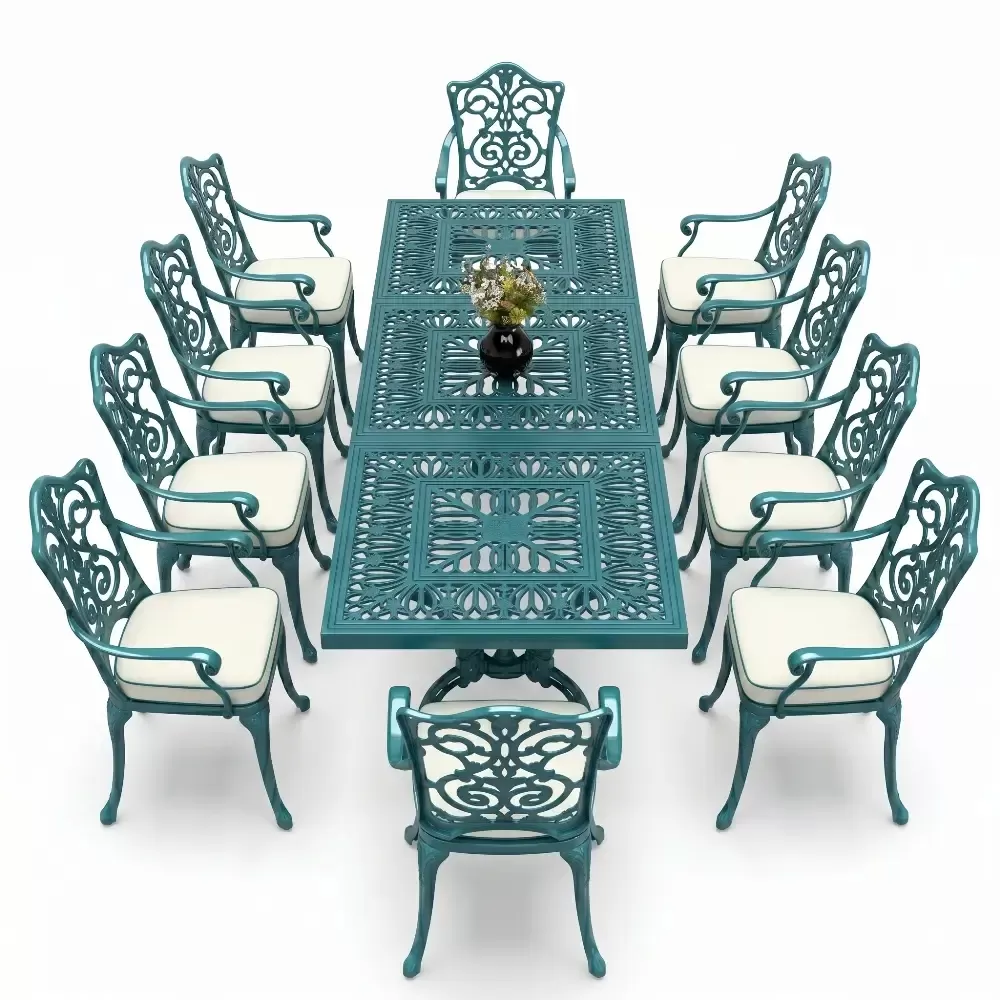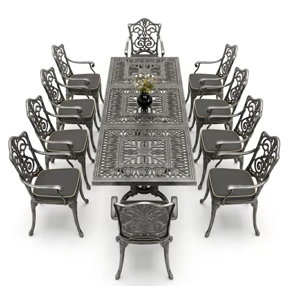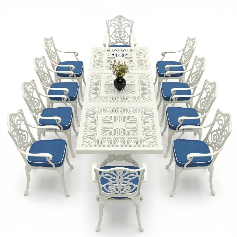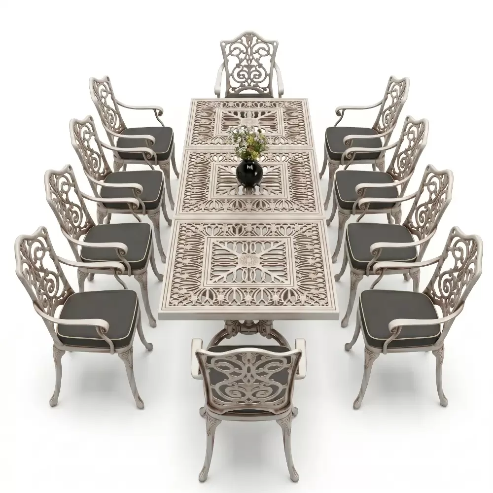 Geniş bahçeler, otel terasları, büyük balkonlar veya havuz başı sosyal alanlar için tasarlanan bu takım, 10 kişilik kapasitesiyle büyük ailelerin ve misafir ağırlamayı seven işletmelerin bir numaralı tercihidir. Alüminyumun doğal paslanmaz özelliği sayesinde nemli bölgelerde ve sahil kesimlerinde dahi formunu bozmadan kullanılabilir.