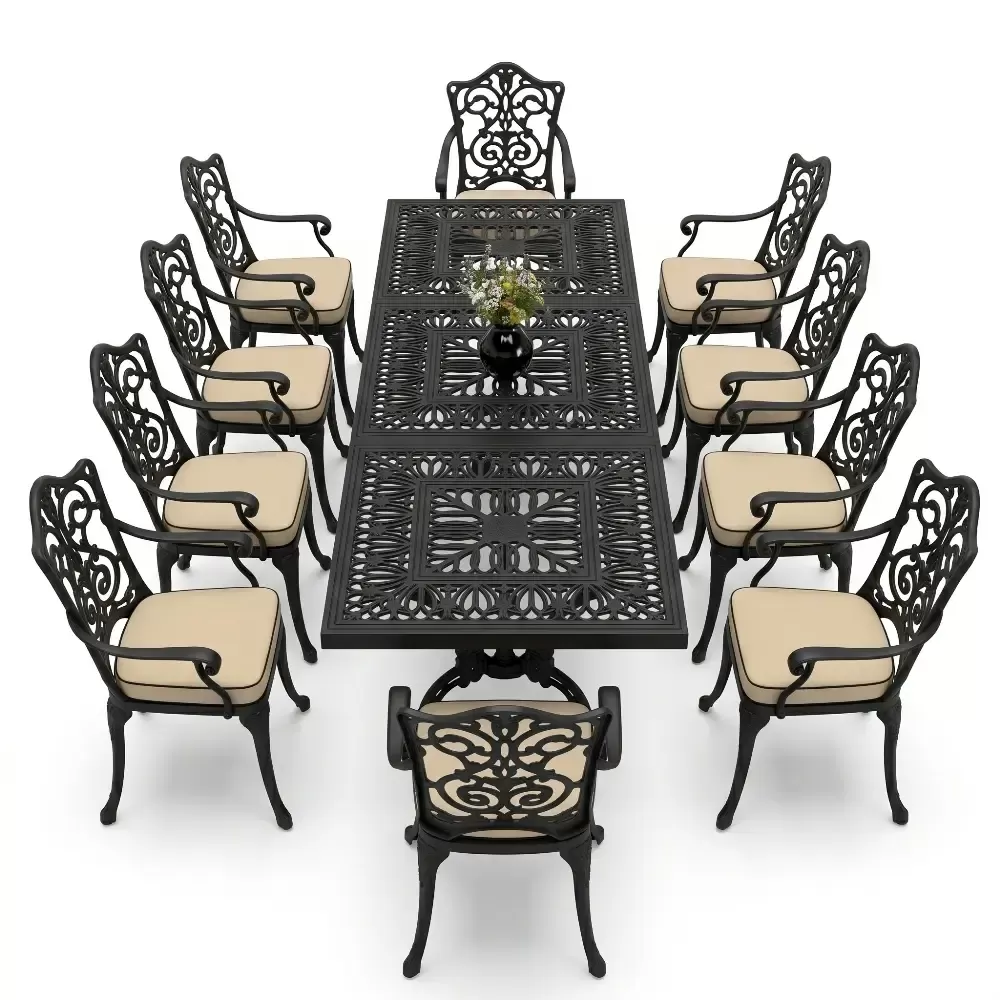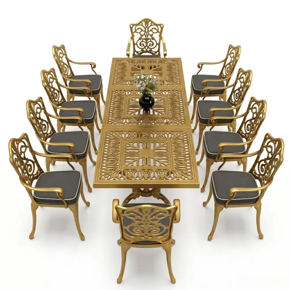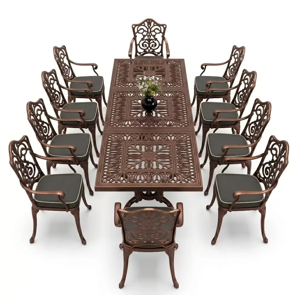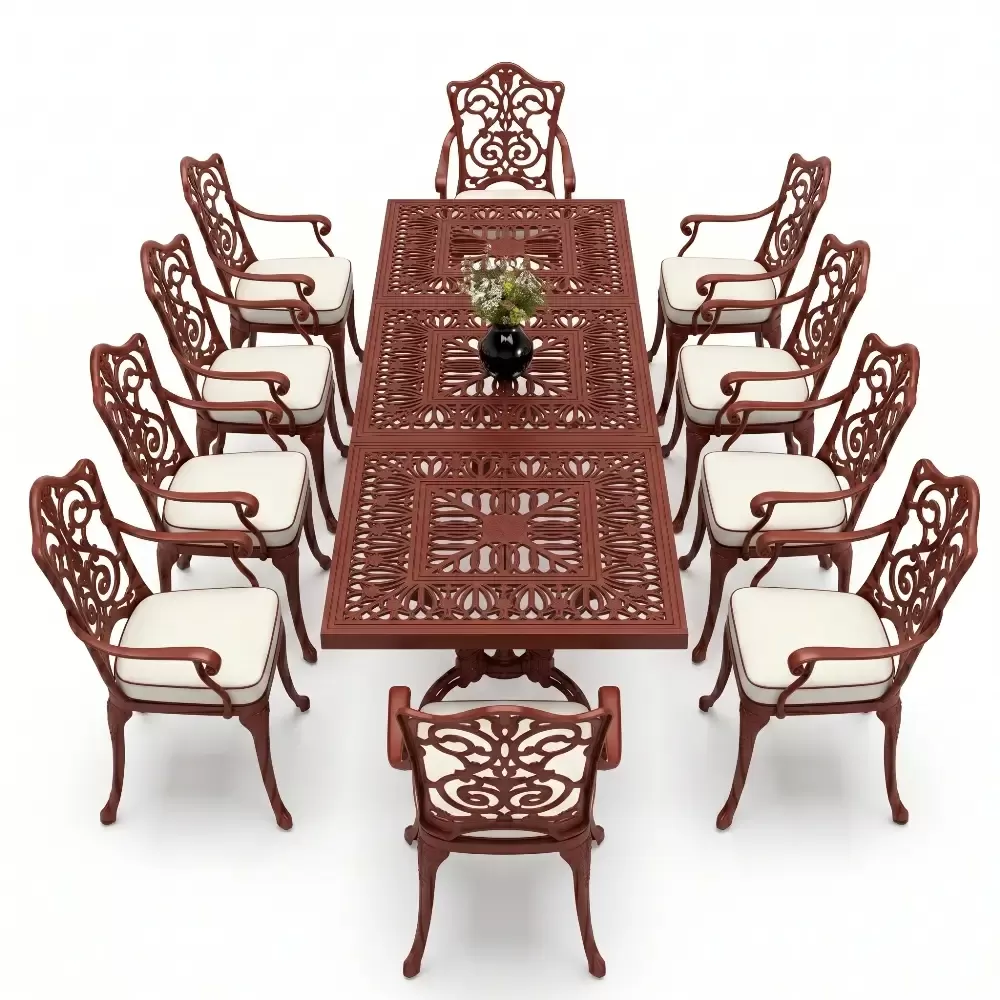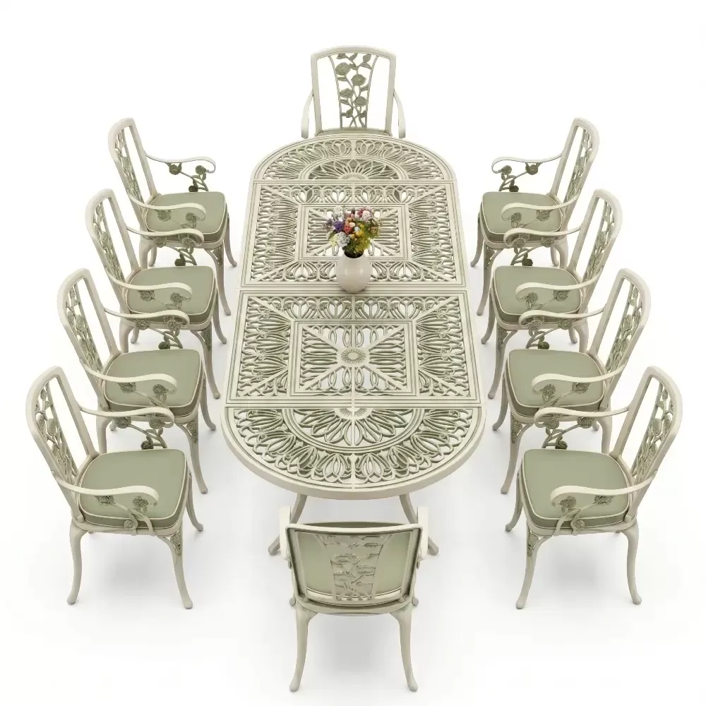 Geniş bahçeler, otel terasları, büyük balkonlar veya havuz başı sosyal alanlar için tasarlanan bu takım, 10 kişilik kapasitesiyle büyük ailelerin ve misafir ağırlamayı seven işletmelerin bir numaralı tercihidir. Alüminyumun doğal paslanmaz özelliği sayesinde nemli bölgelerde ve sahil kesimlerinde dahi formunu bozmadan kullanılabilir.