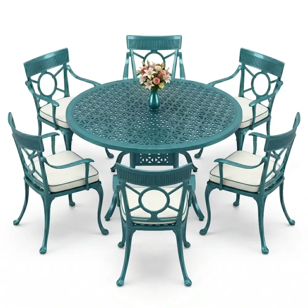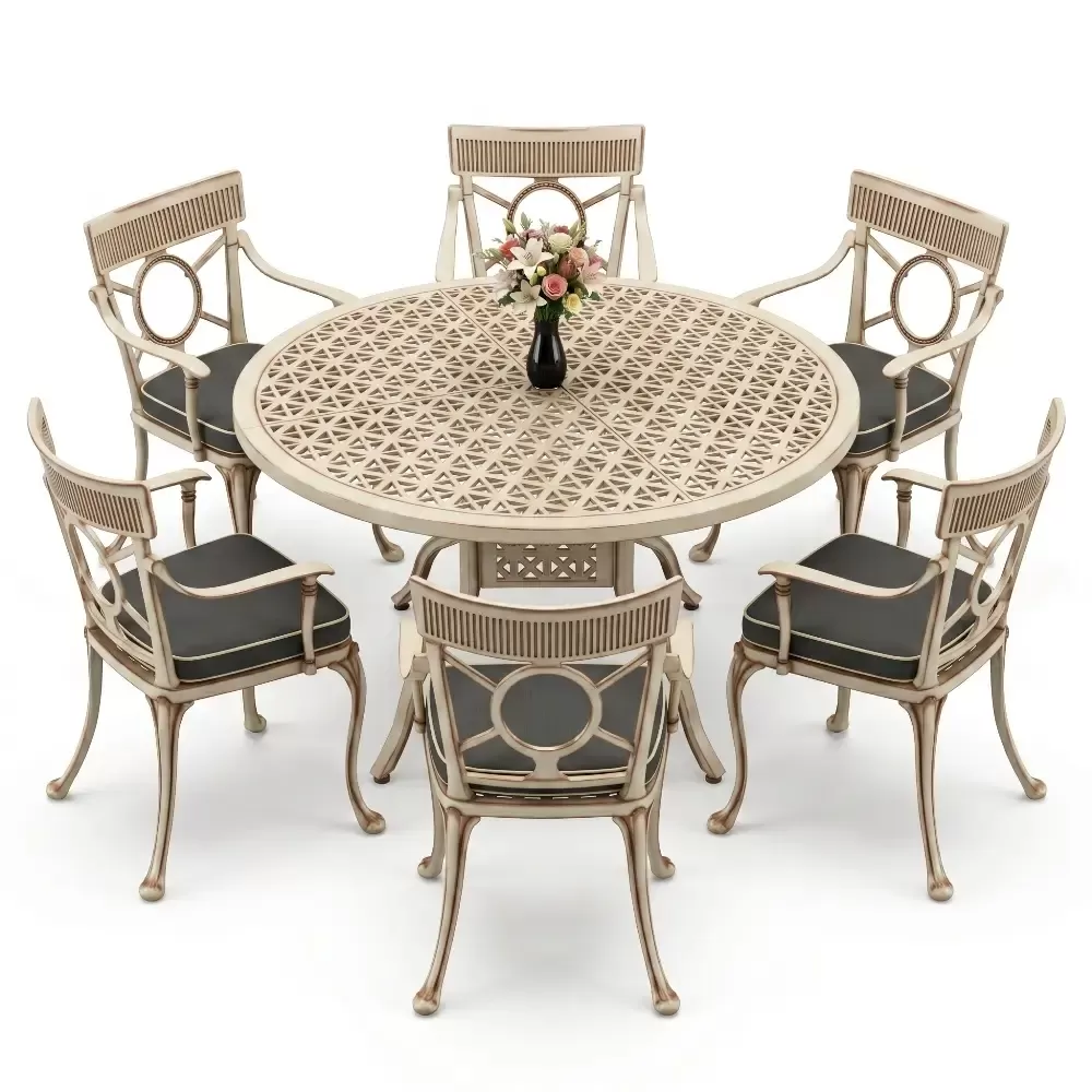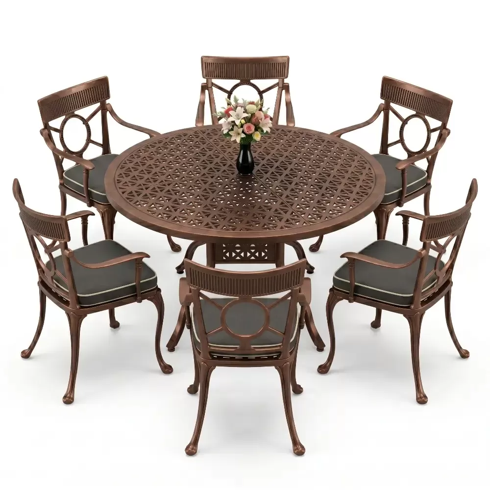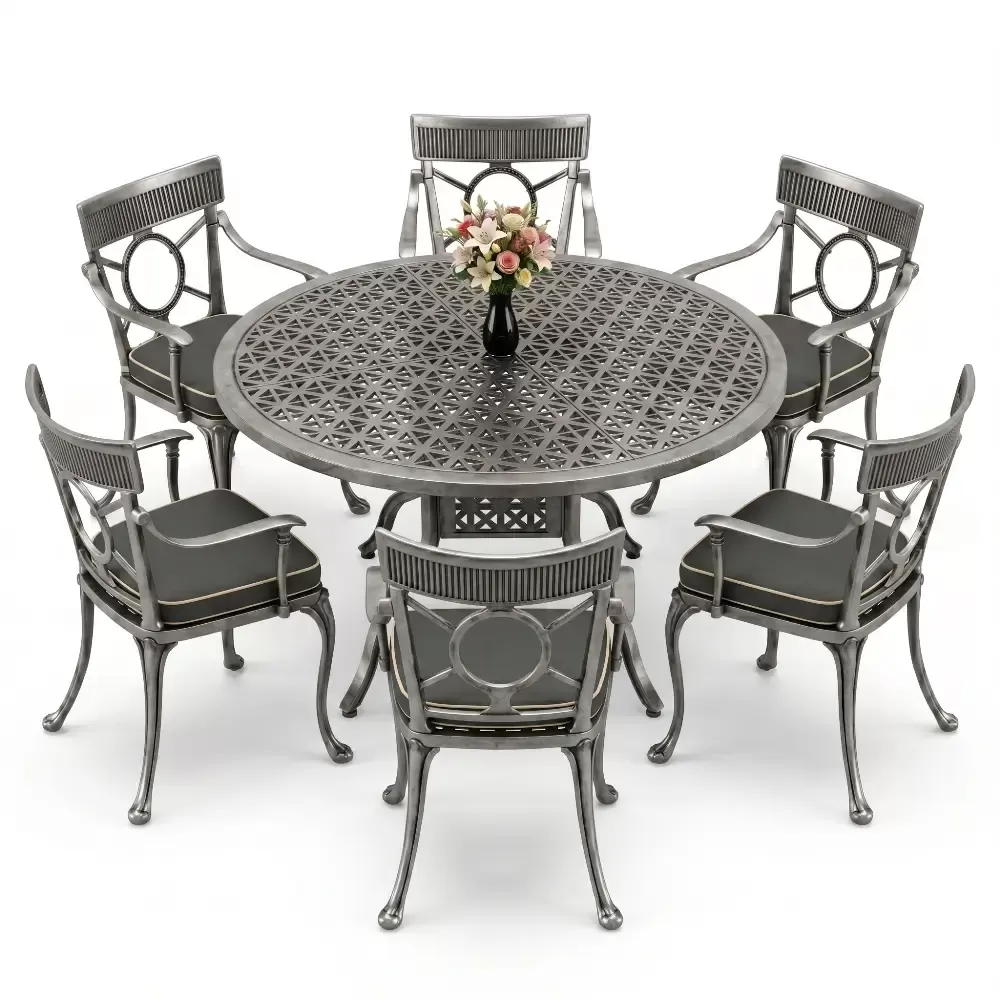Bu şık takım sadece ev bahçelerinde değil, aynı zamanda kafe, restoran ve otel gibi yoğun sirkülasyonun olduğu işletmelerde de güvenle kullanılabilir. Alüminyum dökümün hafifliği sayesinde yer değiştirme işlemleri kolayca yapılırken, ağır yapısı rüzgarlı havalarda stabilite sağlar.