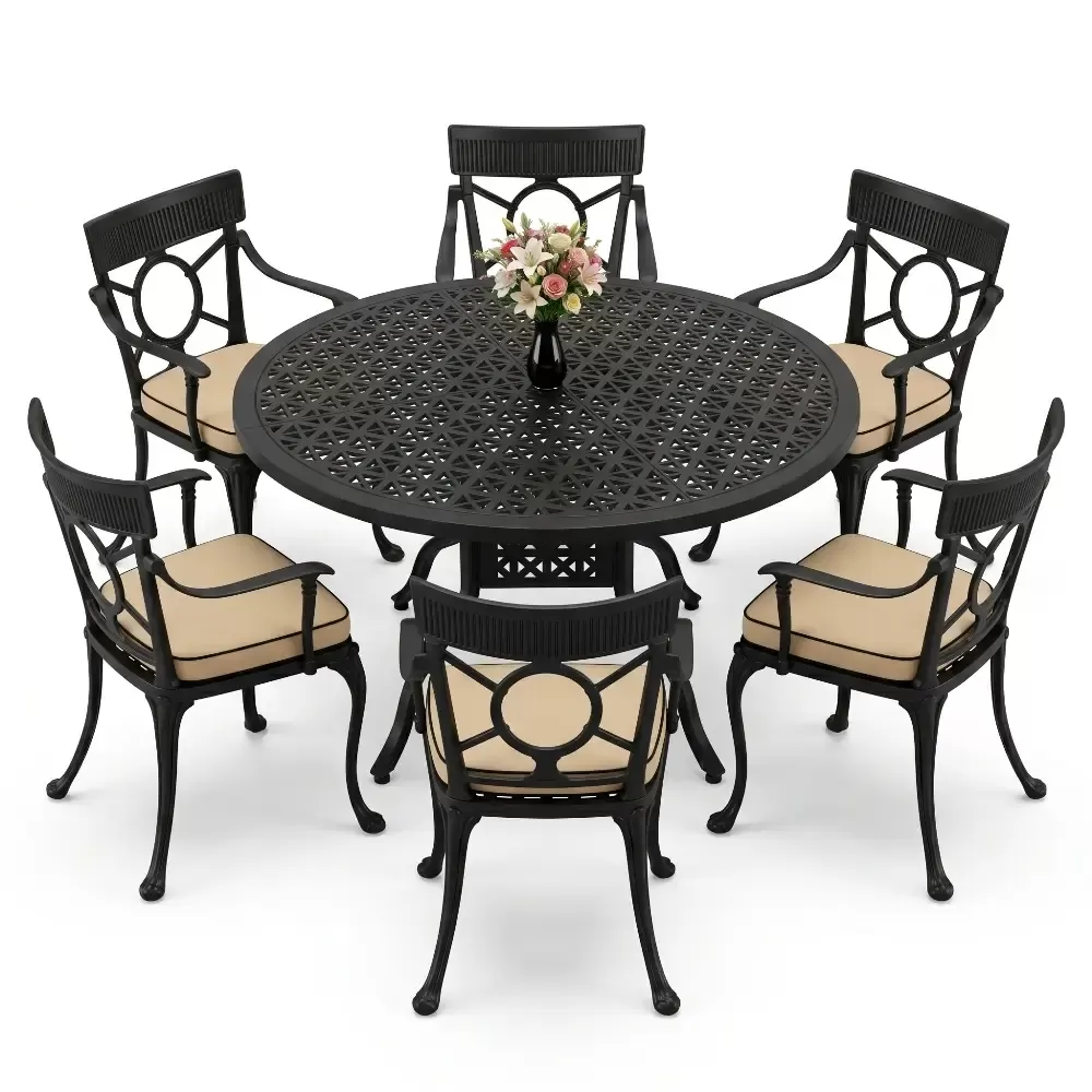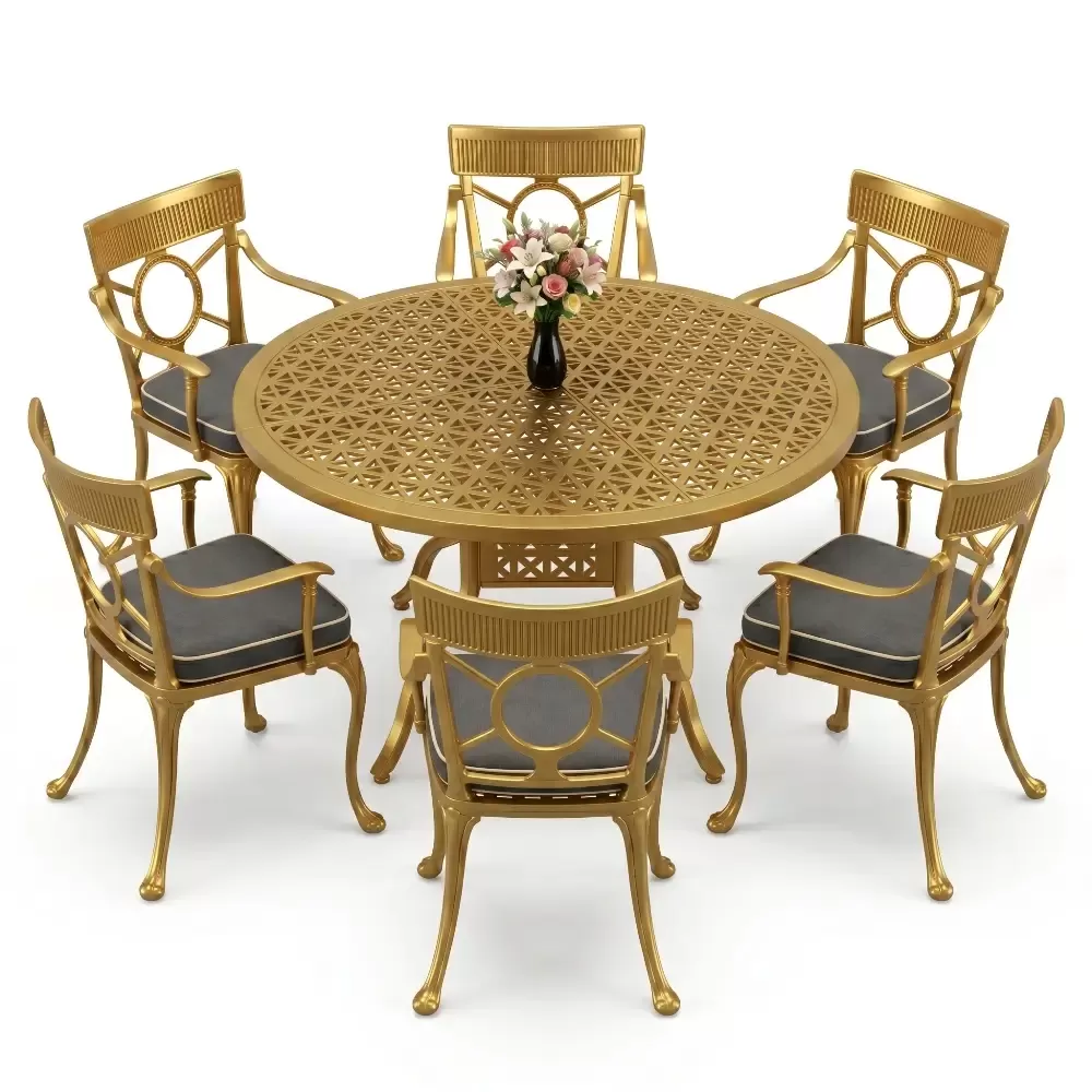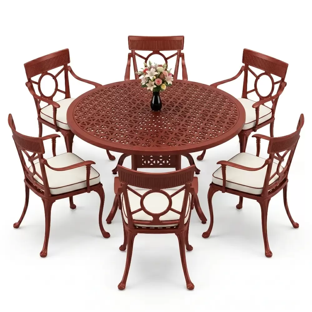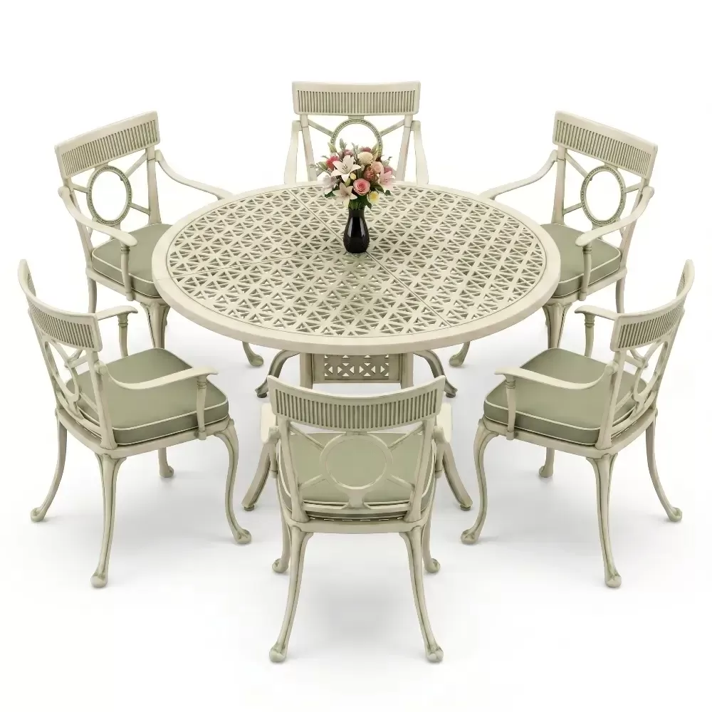 Bu şık takım sadece ev bahçelerinde değil, aynı zamanda kafe, restoran ve otel gibi yoğun sirkülasyonun olduğu işletmelerde de güvenle kullanılabilir. Alüminyum dökümün hafifliği sayesinde yer değiştirme işlemleri kolayca yapılırken, ağır yapısı rüzgarlı havalarda stabilite sağlar.