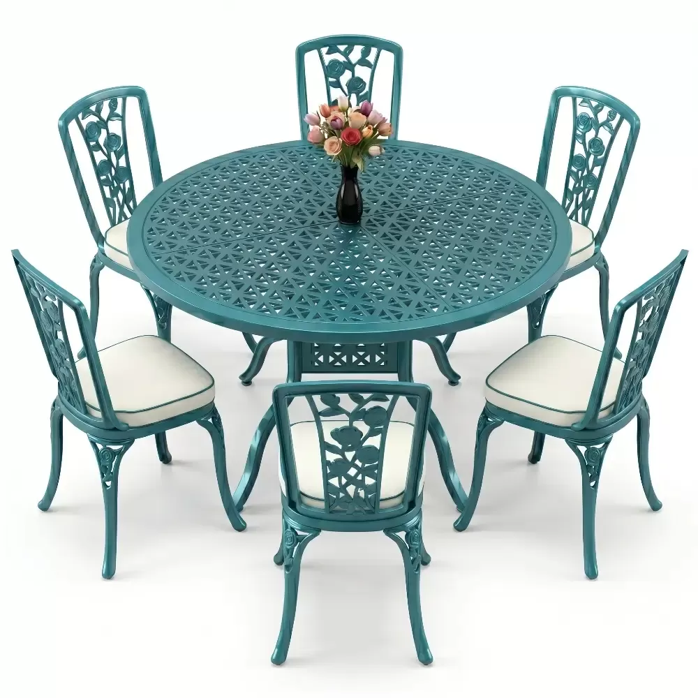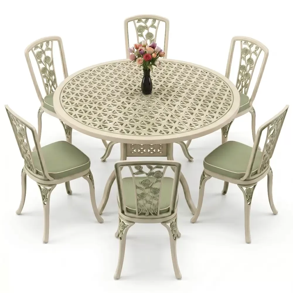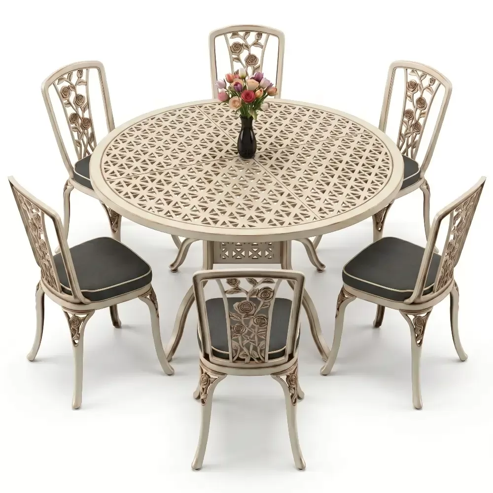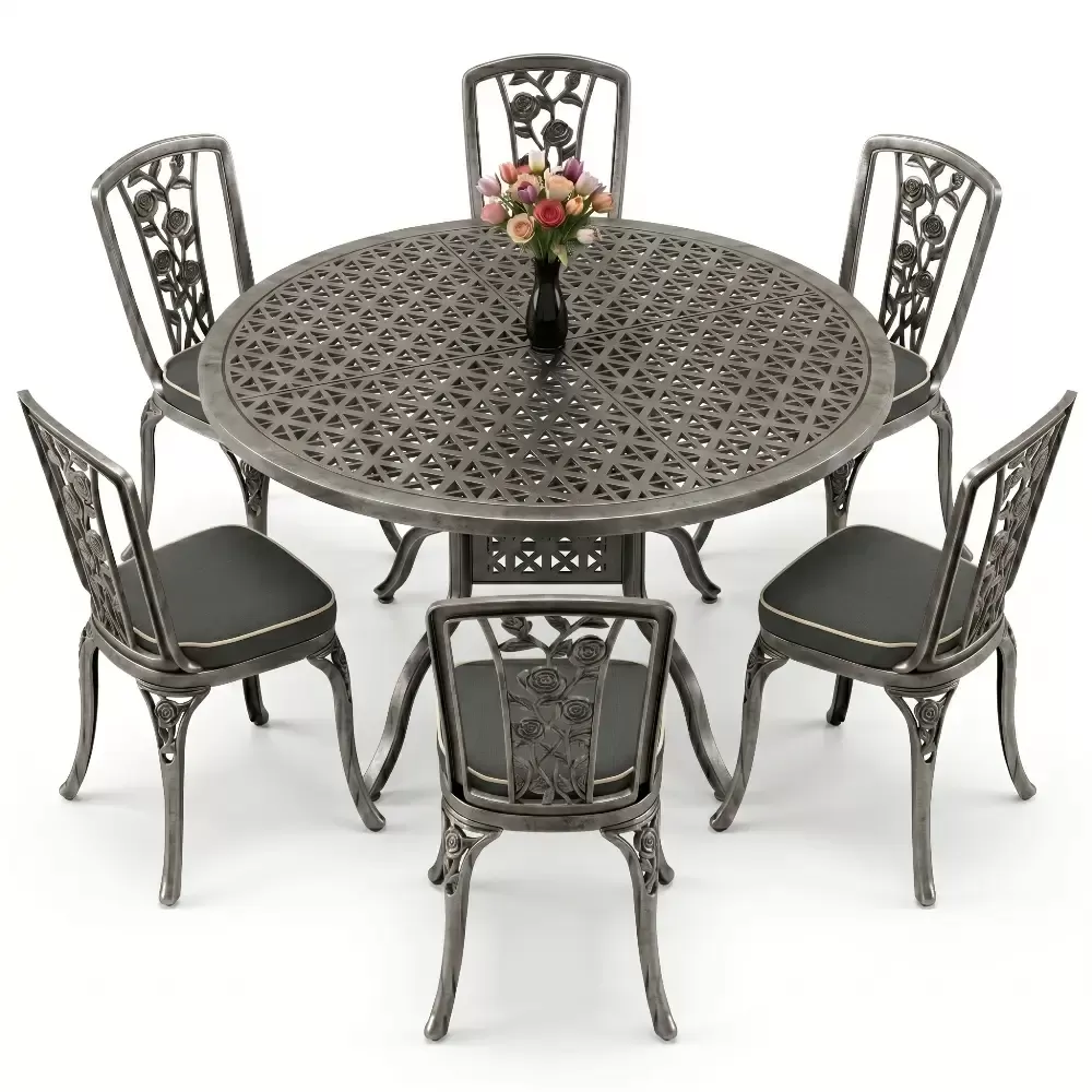 Bahce, balkon veya terasinizda aristokrat bir hava estirmek uzere titizlikle uretilen bu 6 kisilik yemek takimi, klasik ferforje estetik anlayisini modern malzeme teknolojisiyle birlestiriyor. Aluminyum dokumun sagladigi hafiflik ve paslanmazlik ozelligi, urunu hem ic hem de dis mekanlarda omurluk bir yatirima donusturuyor. Akbrella kalitesiyle uretilen her parca, konforu ve dayanikliligi on planda tutan bir sanat eseri niteligindedir.