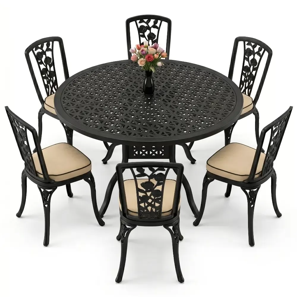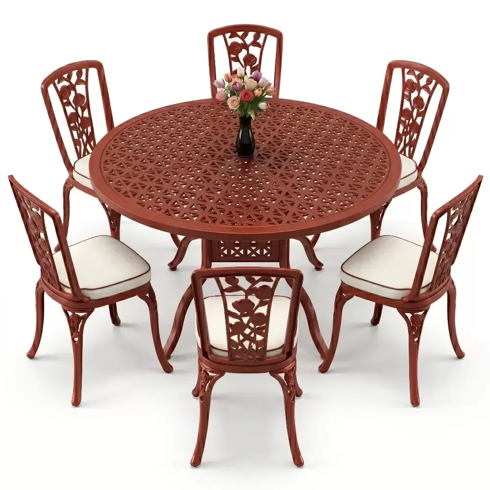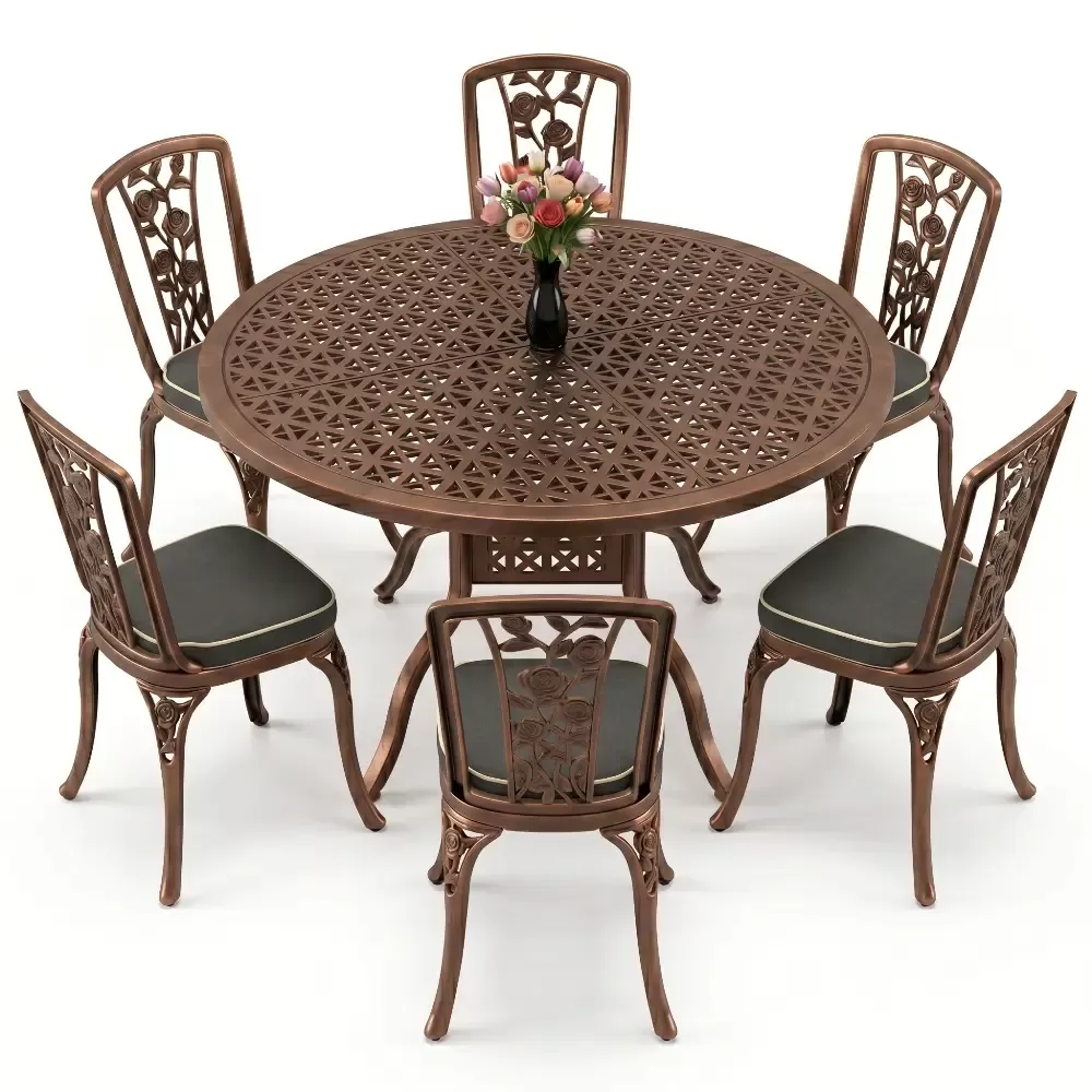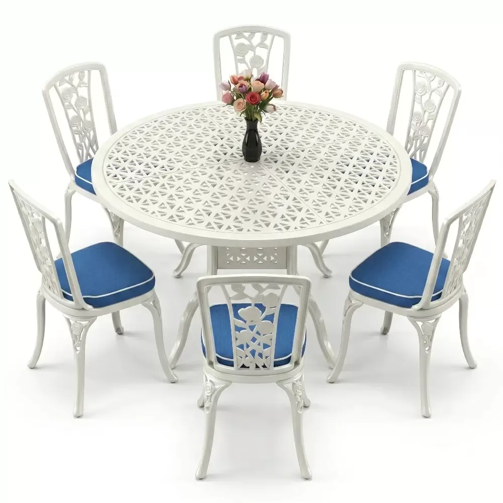 Bahce, balkon veya terasinizda aristokrat bir hava estirmek uzere titizlikle uretilen bu 6 kisilik yemek takimi, klasik ferforje estetik anlayisini modern malzeme teknolojisiyle birlestiriyor. Aluminyum dokumun sagladigi hafiflik ve paslanmazlik ozelligi, urunu hem ic hem de dis mekanlarda omurluk bir yatirima donusturuyor. Akbrella kalitesiyle uretilen her parca, konforu ve dayanikliligi on planda tutan bir sanat eseri niteligindedir.
