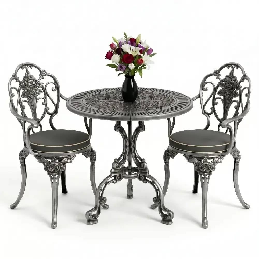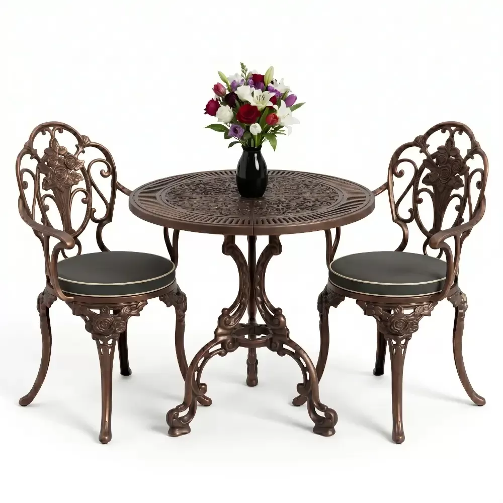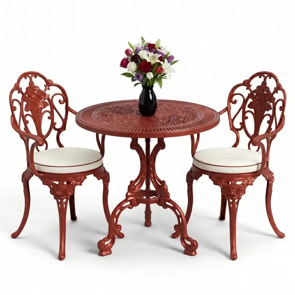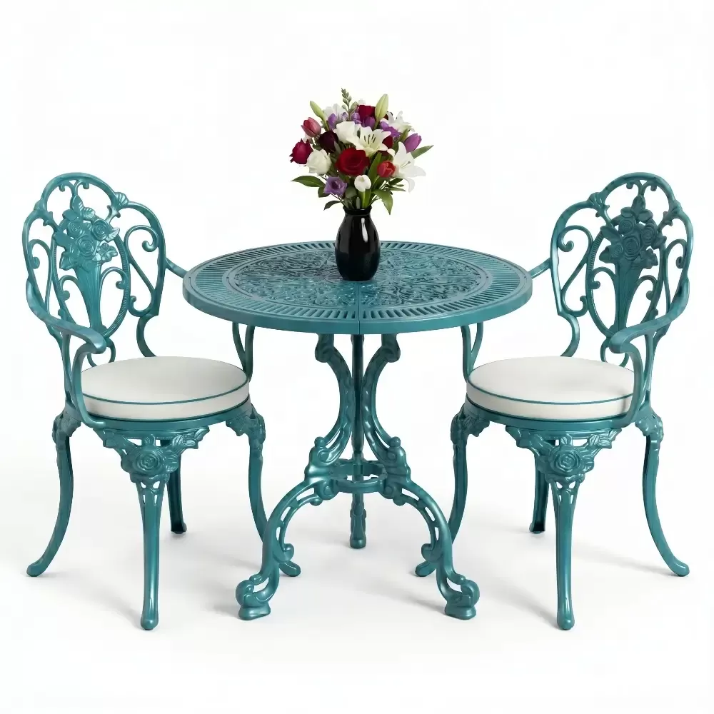 Yüksek mukavemetli alüminyum döküm malzemeden üretilen bu takım, doğa şartlarına karşı tam direnç gösterecek şekilde tasarlanmıştır. Geleneksel döküm demir mobilyaların aksine korozyona uğramaz ve paslanma yapmaz. Elektrostatik fırın boya teknolojisi ile desteklenen yüzey yapısı; UV ışınlarına, aşırı sıcaklara ve nemli ortamlara karşı üstün koruma sağlayarak ürünün ilk günkü zarafetini uzun yıllar korumasına yardımcı olur.