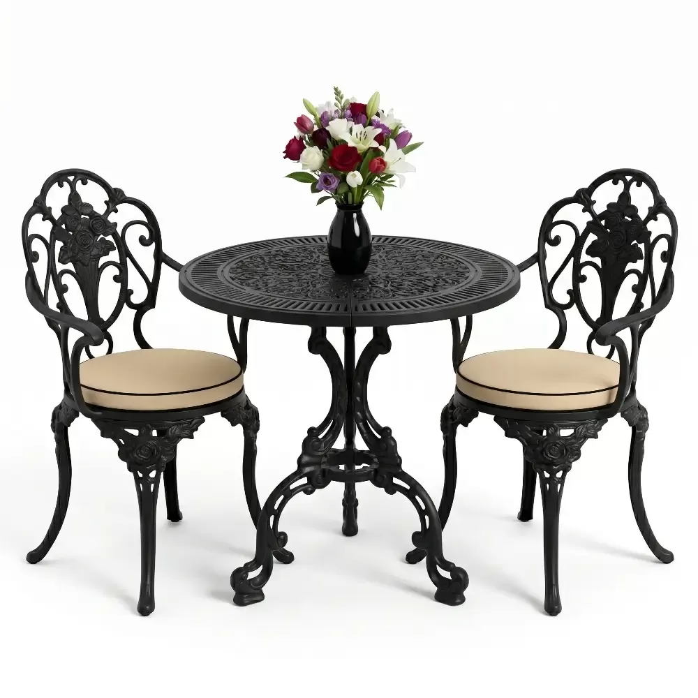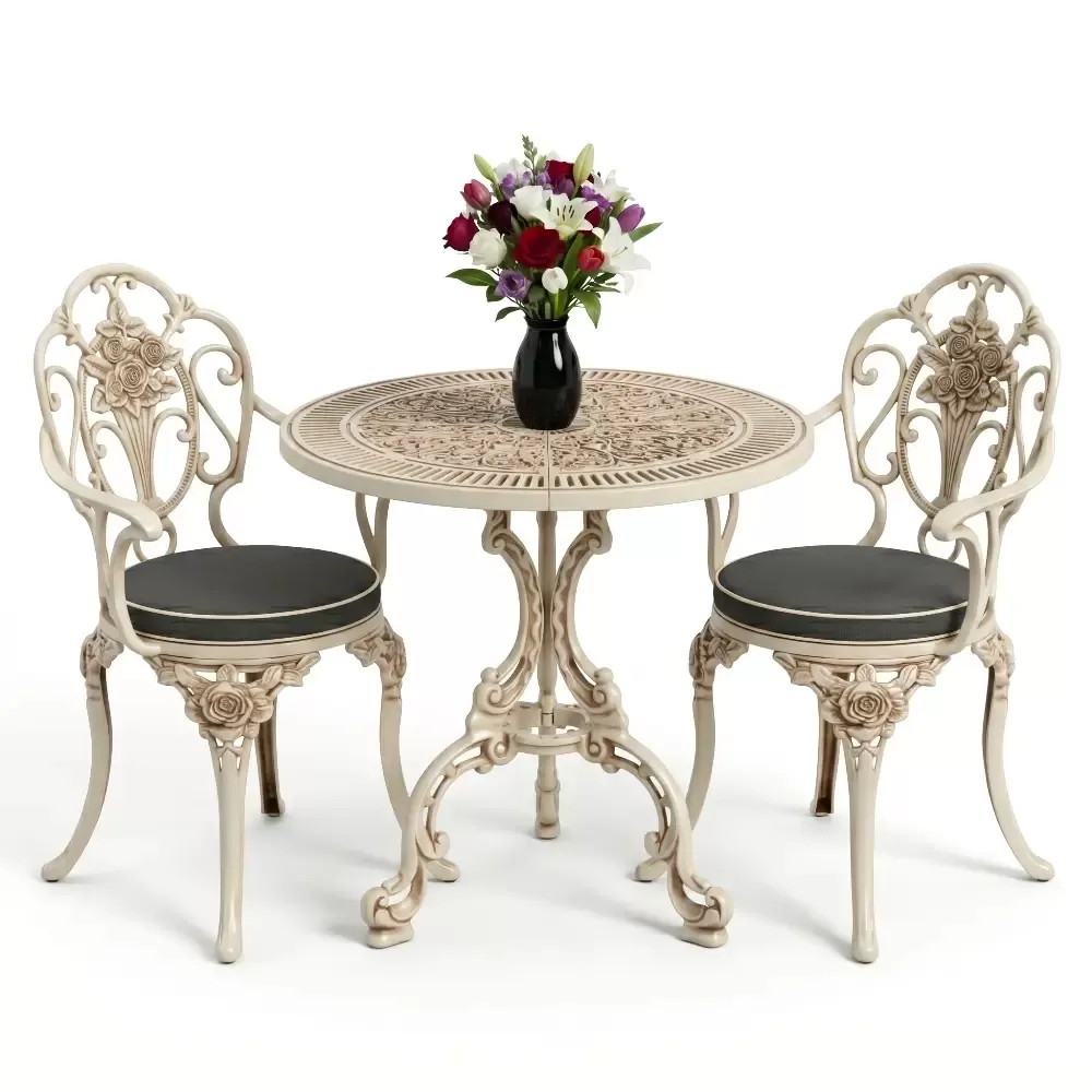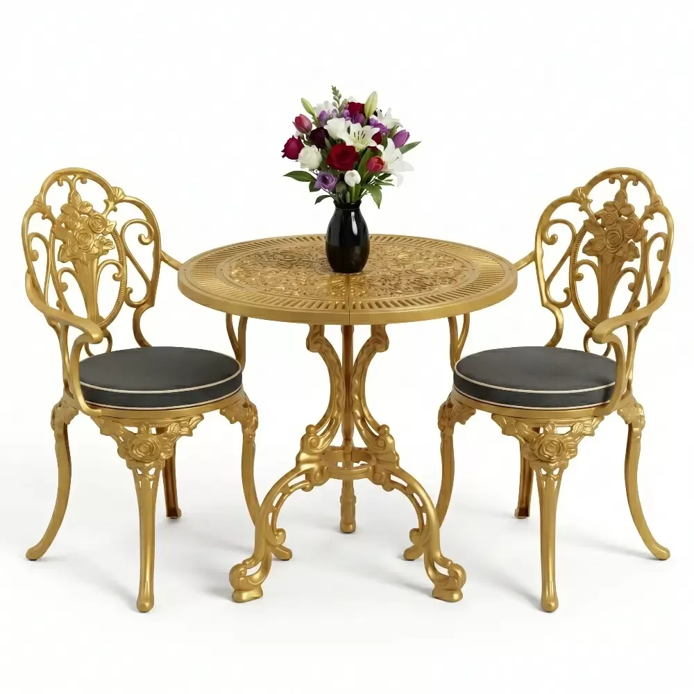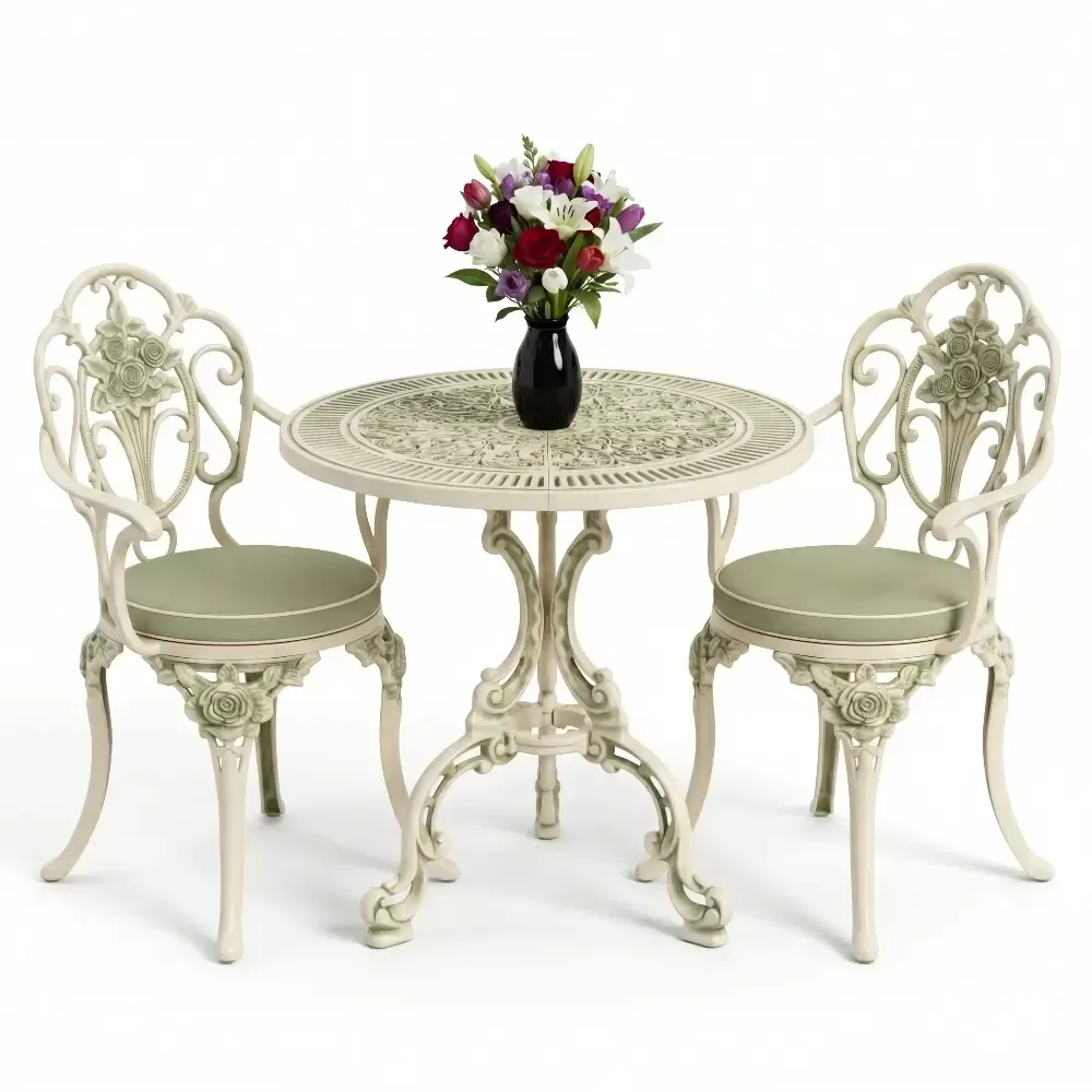 Yüksek mukavemetli alüminyum döküm malzemeden üretilen bu takım, doğa şartlarına karşı tam direnç gösterecek şekilde tasarlanmıştır. Geleneksel döküm demir mobilyaların aksine korozyona uğramaz ve paslanma yapmaz. Elektrostatik fırın boya teknolojisi ile desteklenen yüzey yapısı; UV ışınlarına, aşırı sıcaklara ve nemli ortamlara karşı üstün koruma sağlayarak ürünün ilk günkü zarafetini uzun yıllar korumasına yardımcı olur.