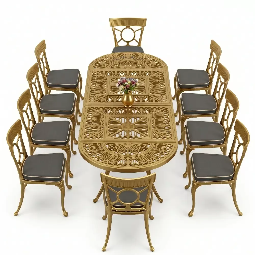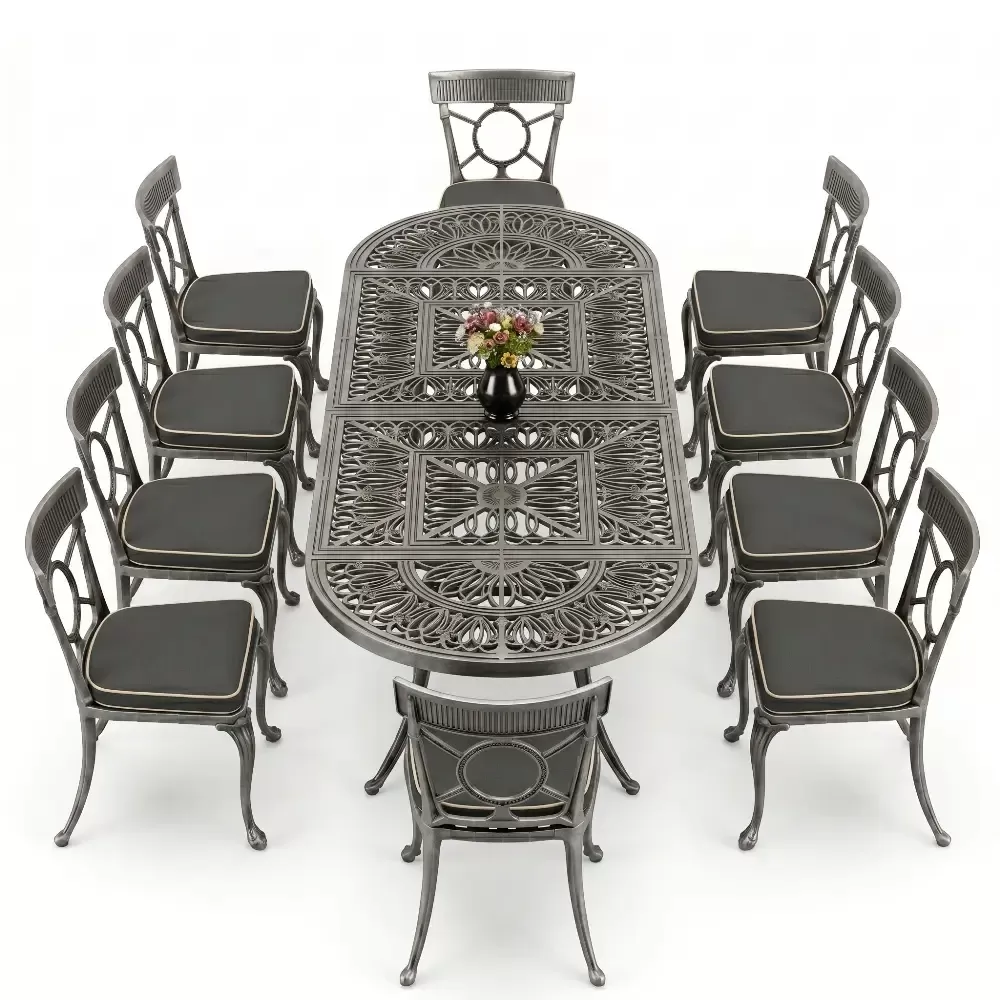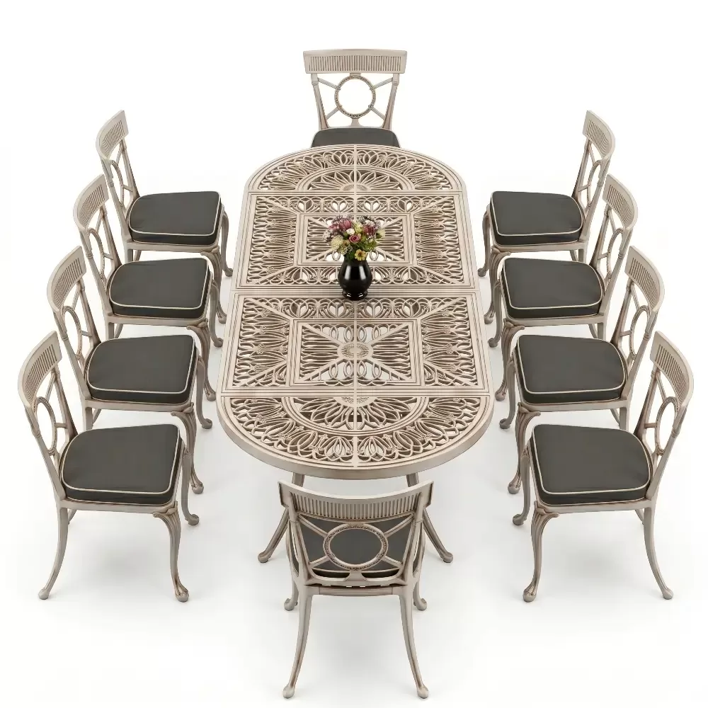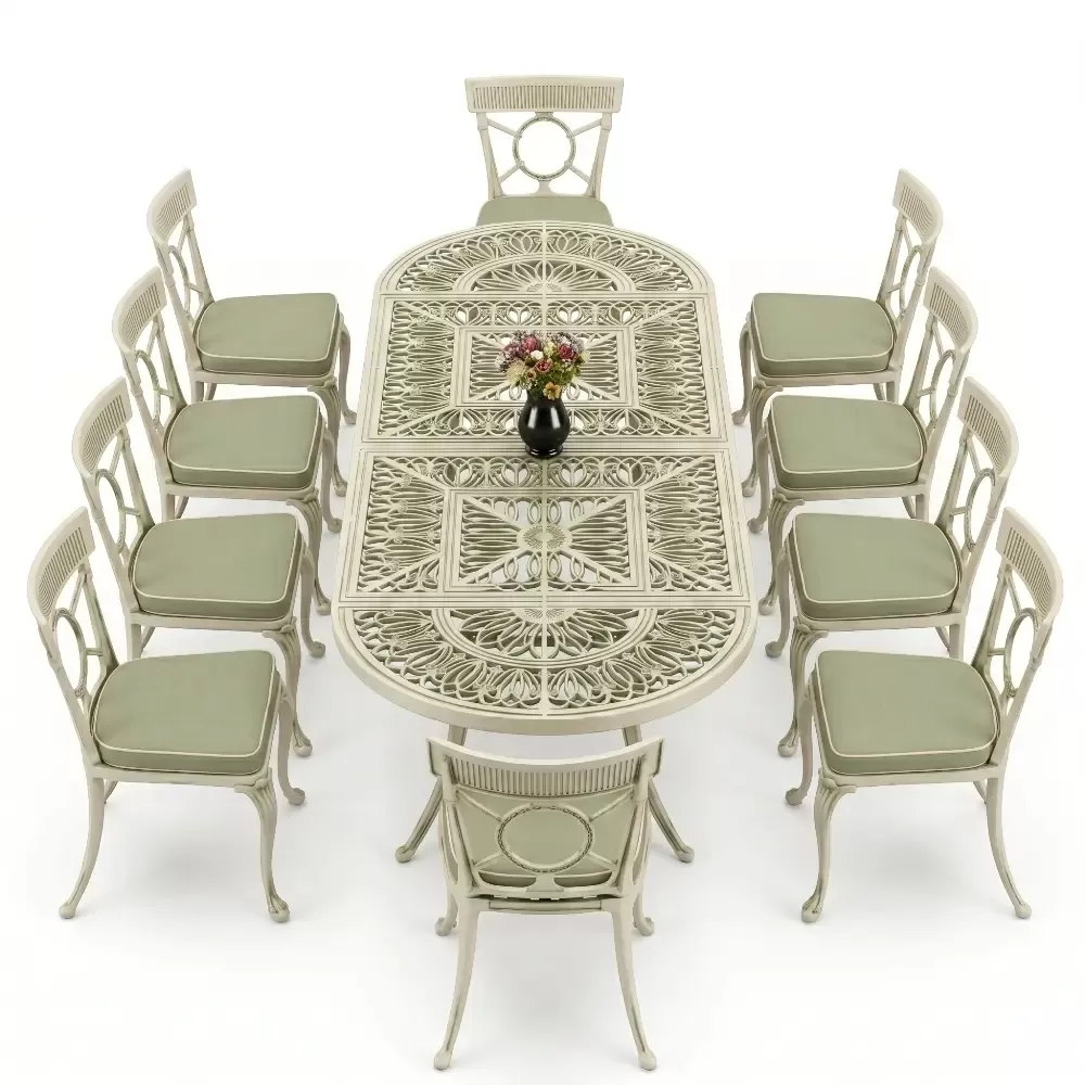 Oval Elips Masa E:100 x D:300 x Y:72 cm 10 Kişilik ferforje tip alüminyum döküm masa ve sandalye takımı (Mindersiz Fiyatı)