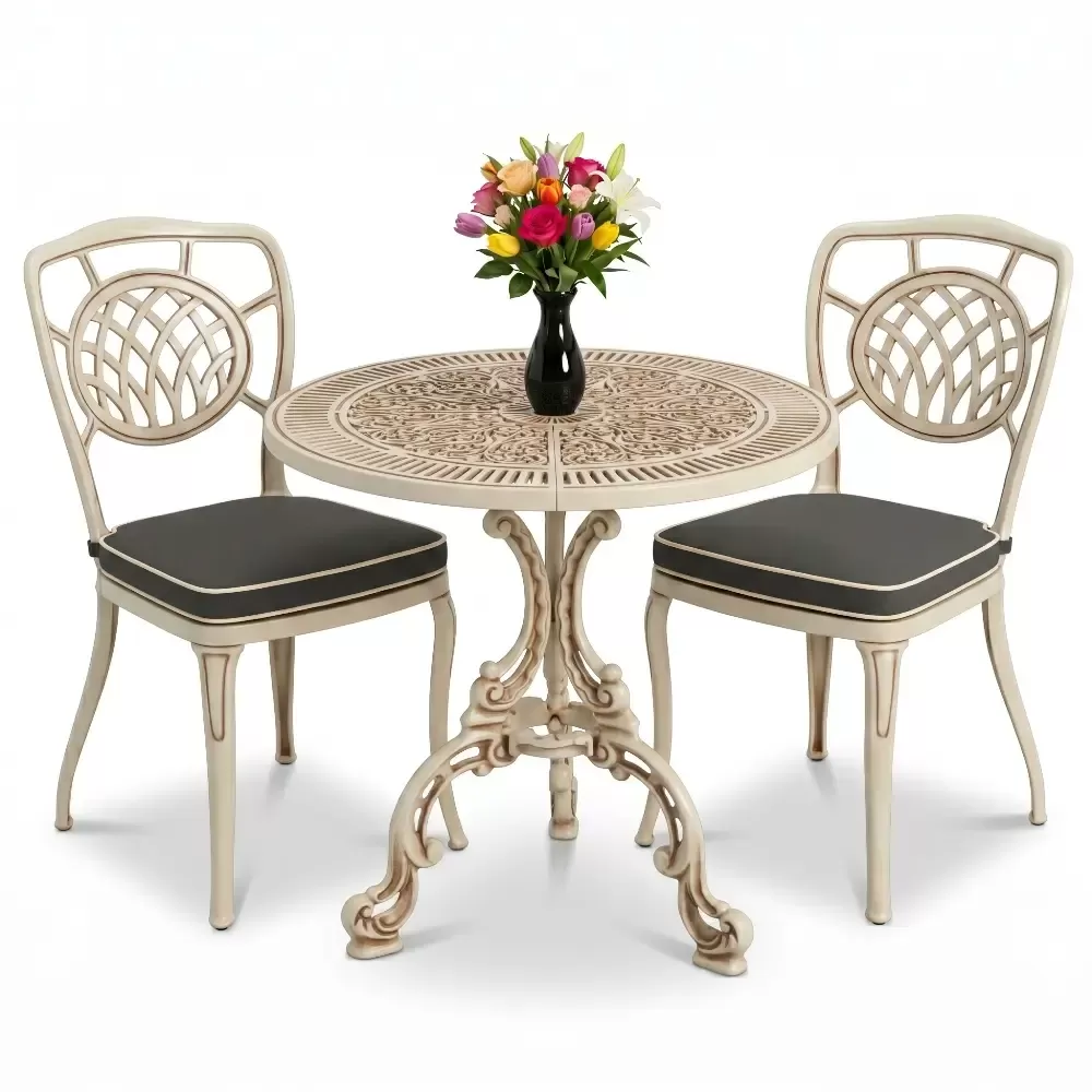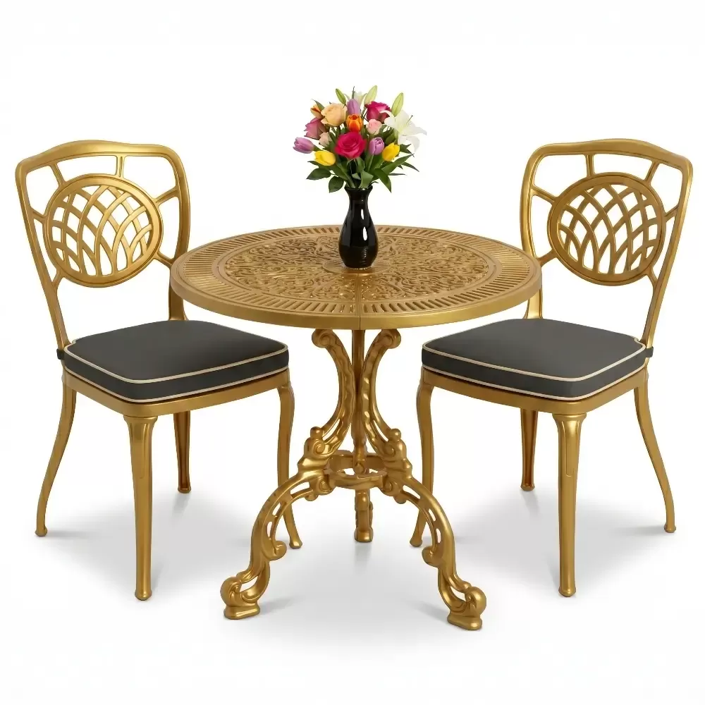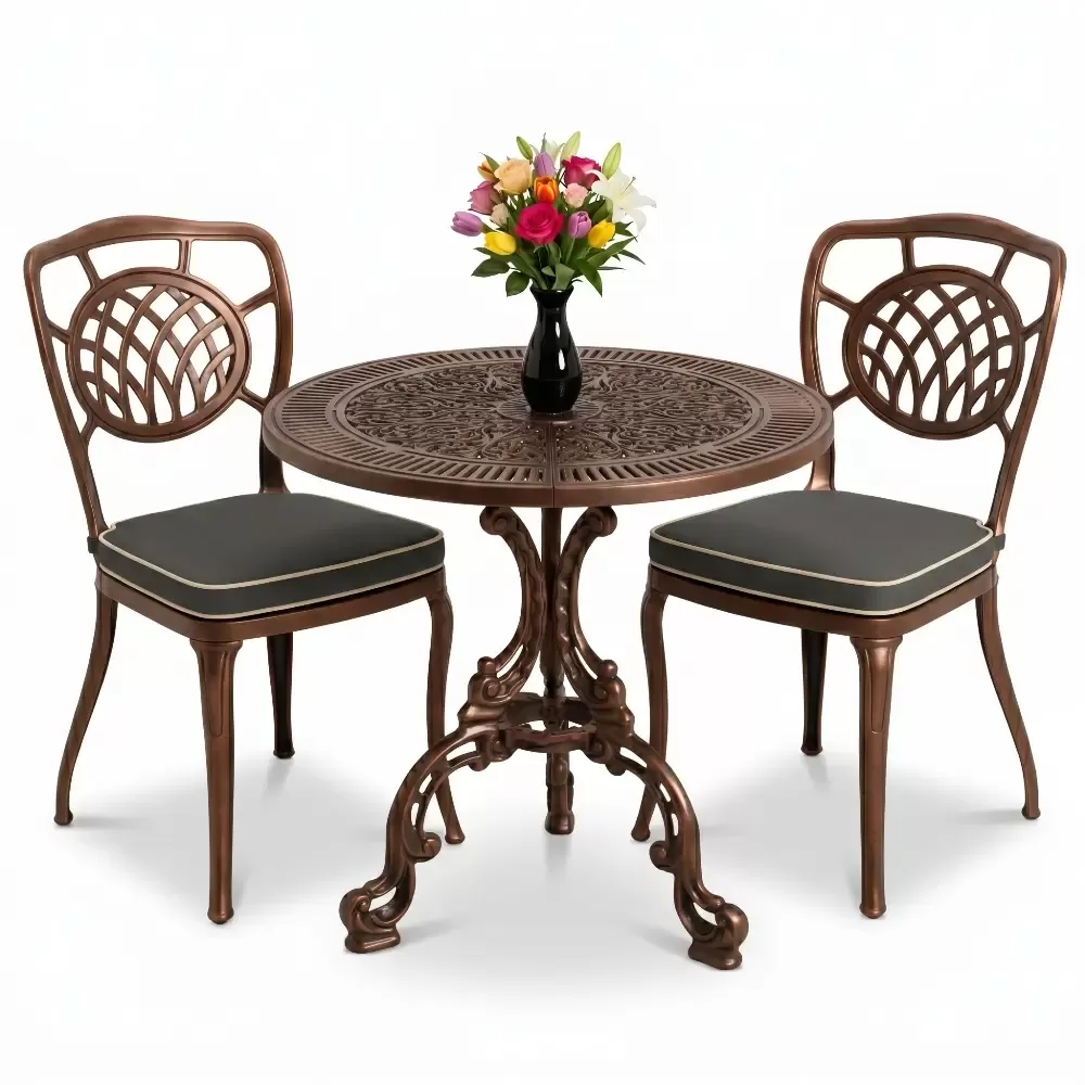 Yüksek mukavemetli alüminyum döküm malzemeden üretilen bu takım, doğa şartlarına karşı tam direnç gösterecek şekilde tasarlanmıştır. Geleneksel döküm demir mobilyaların aksine korozyona uğramaz ve paslanma yapmaz. Elektrostatik fırın boya teknolojisi ile desteklenen yüzey yapısı; UV ışınlarına, aşırı sıcaklara ve nemli ortamlara karşı üstün koruma sağlayarak ürünün ilk günkü zarafetini uzun yıllar korumasına yardımcı olur.