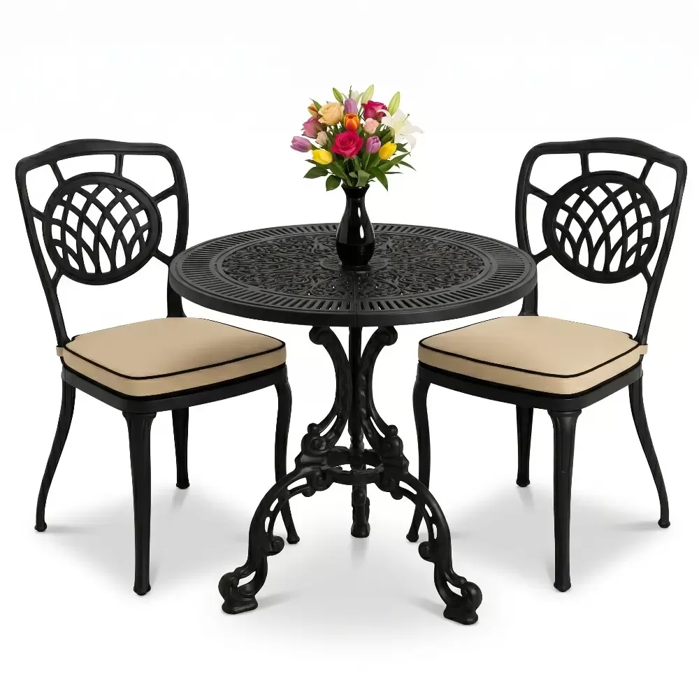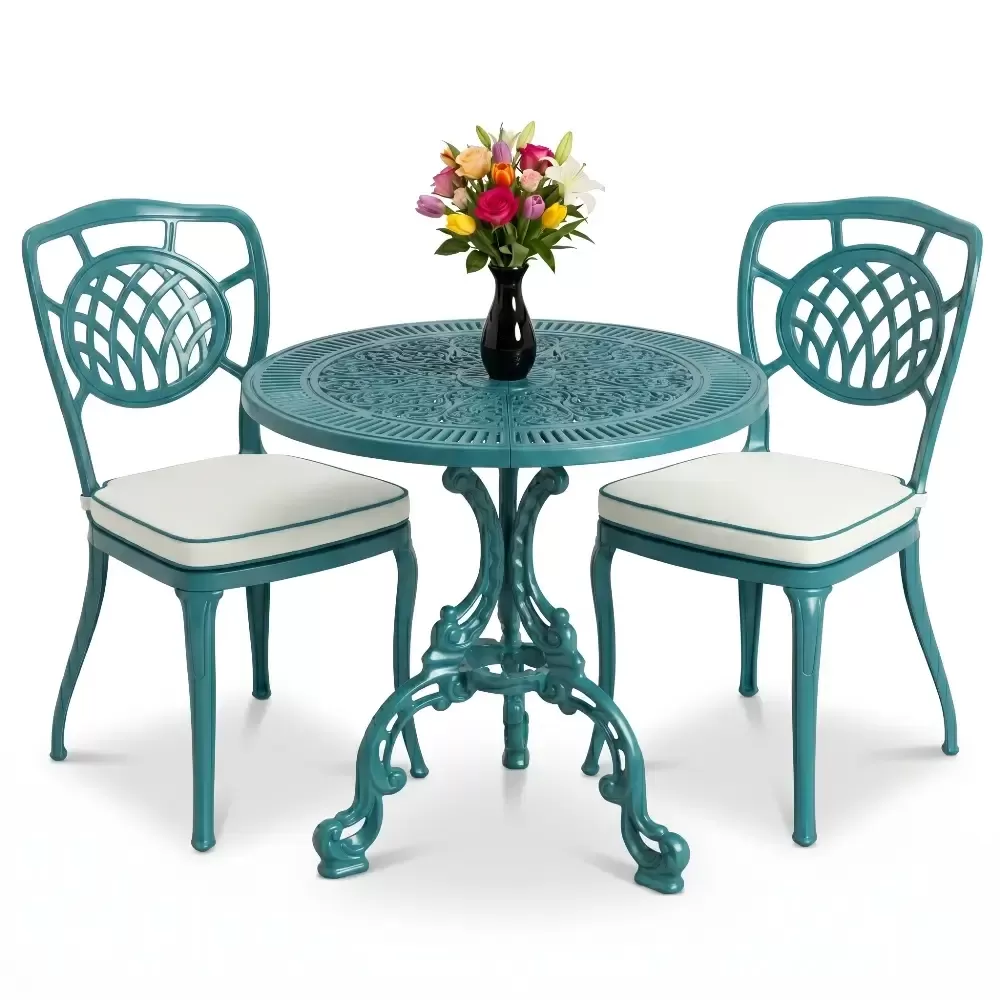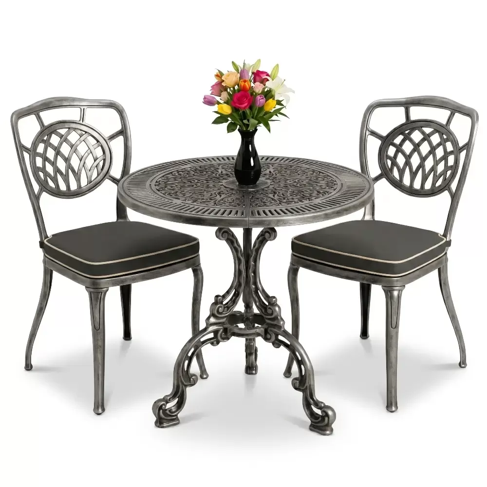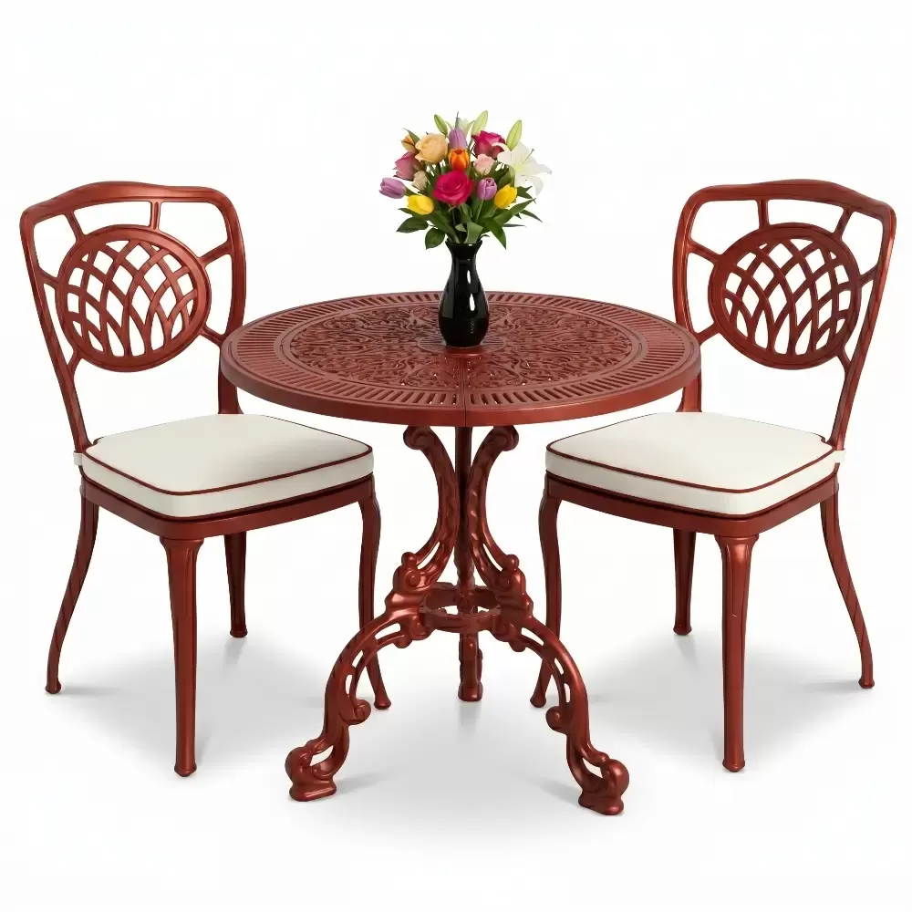 Yüksek mukavemetli alüminyum döküm malzemeden üretilen bu takım, doğa şartlarına karşı tam direnç gösterecek şekilde tasarlanmıştır. Geleneksel döküm demir mobilyaların aksine korozyona uğramaz ve paslanma yapmaz. Elektrostatik fırın boya teknolojisi ile desteklenen yüzey yapısı; UV ışınlarına, aşırı sıcaklara ve nemli ortamlara karşı üstün koruma sağlayarak ürünün ilk günkü zarafetini uzun yıllar korumasına yardımcı olur.