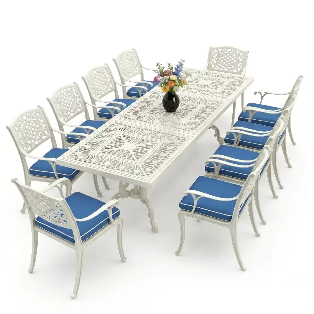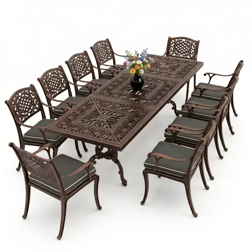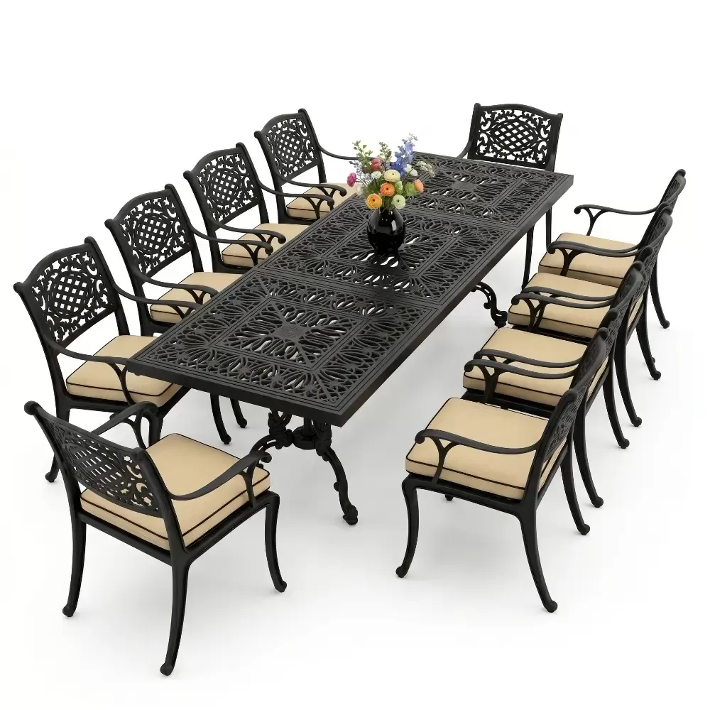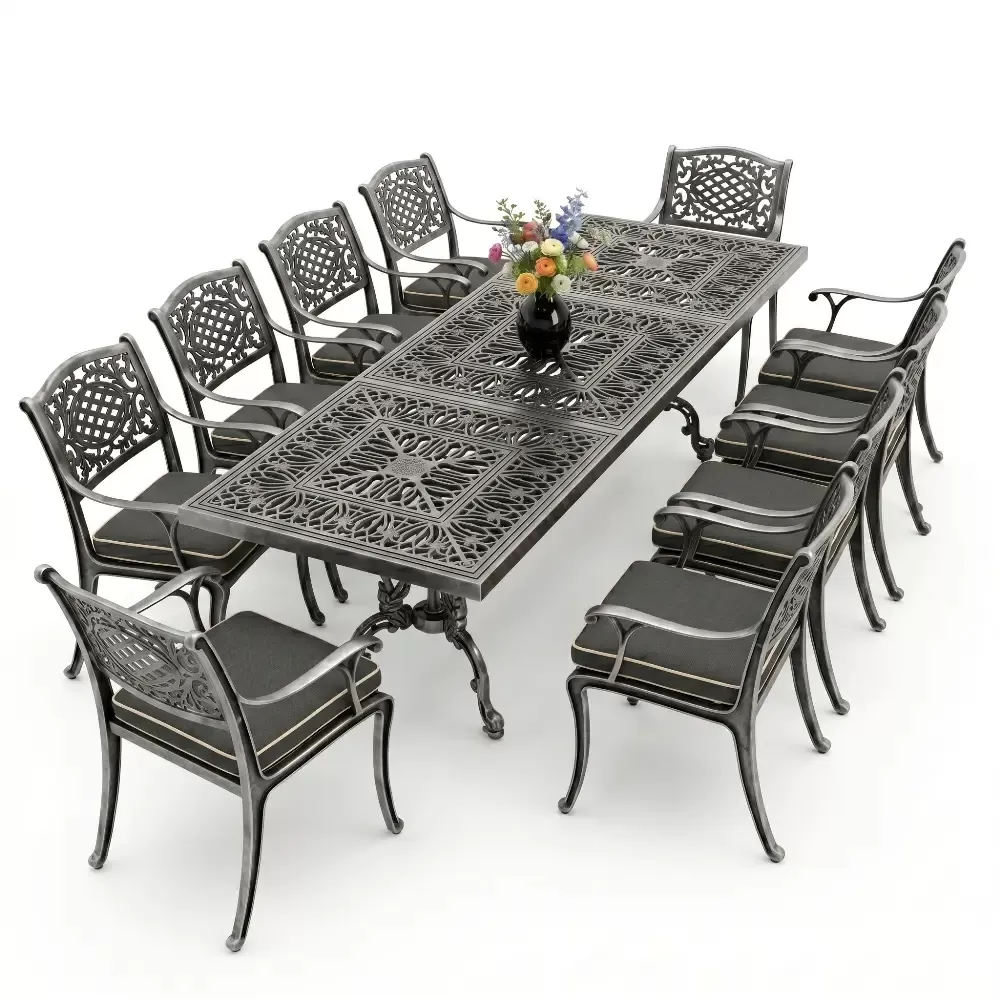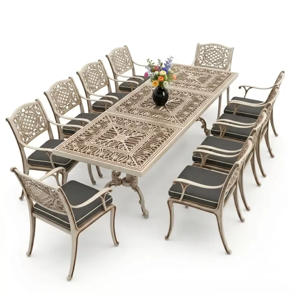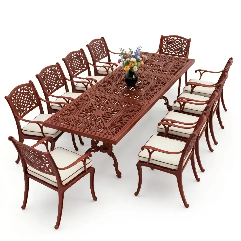 100x300 cm olculerindeki devasa dikdortgen masamiz, 10 kisilik kalabalik davetleriniz icin idealdir. 72 cm ideal yuksekligi ile ergonomik bir kullanim sunan bu set, gunes motifli islemeleriyle bahcenize klasik bir ferforje estetigi katar. Model 127, dayanikliligi ve agirbasli durusuyla uzun vadeli bir yatirimdir.