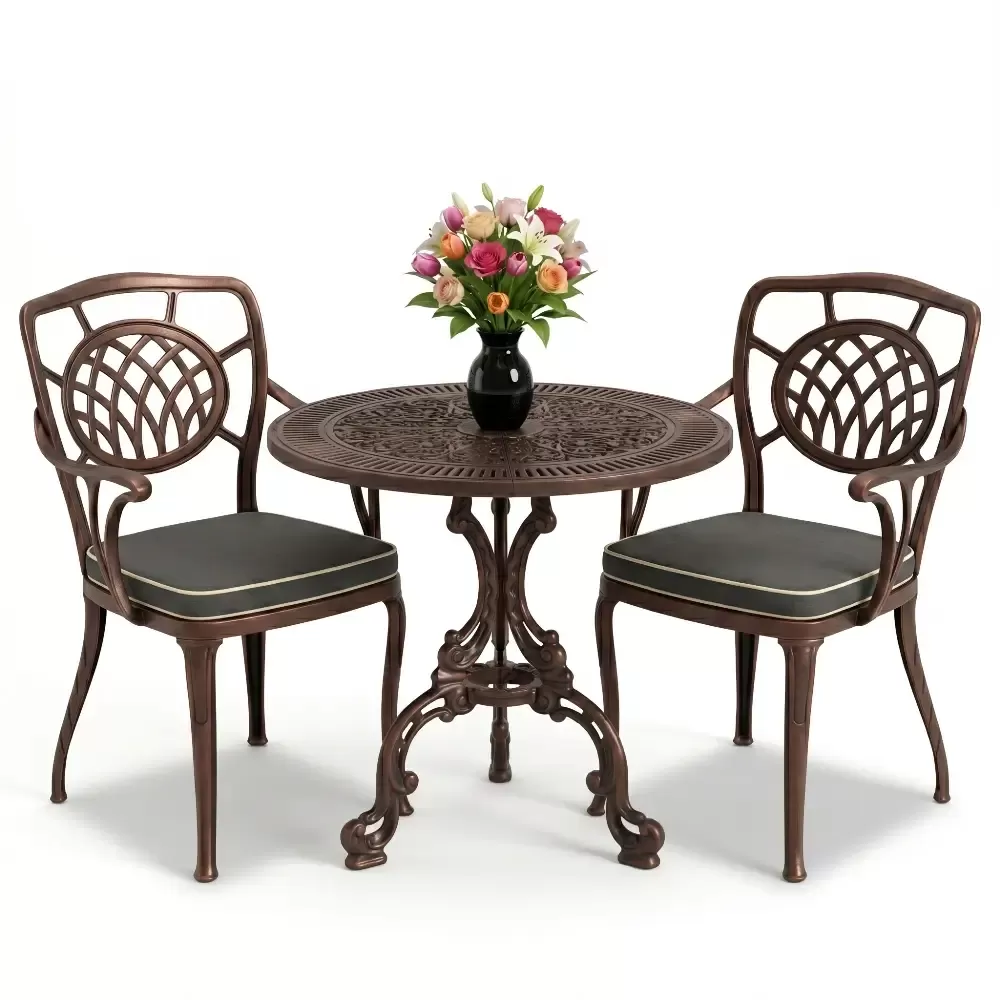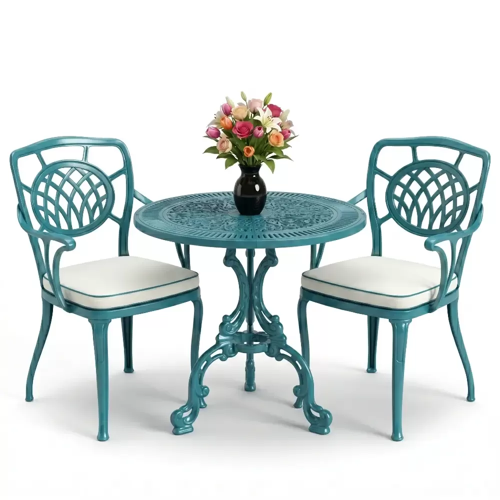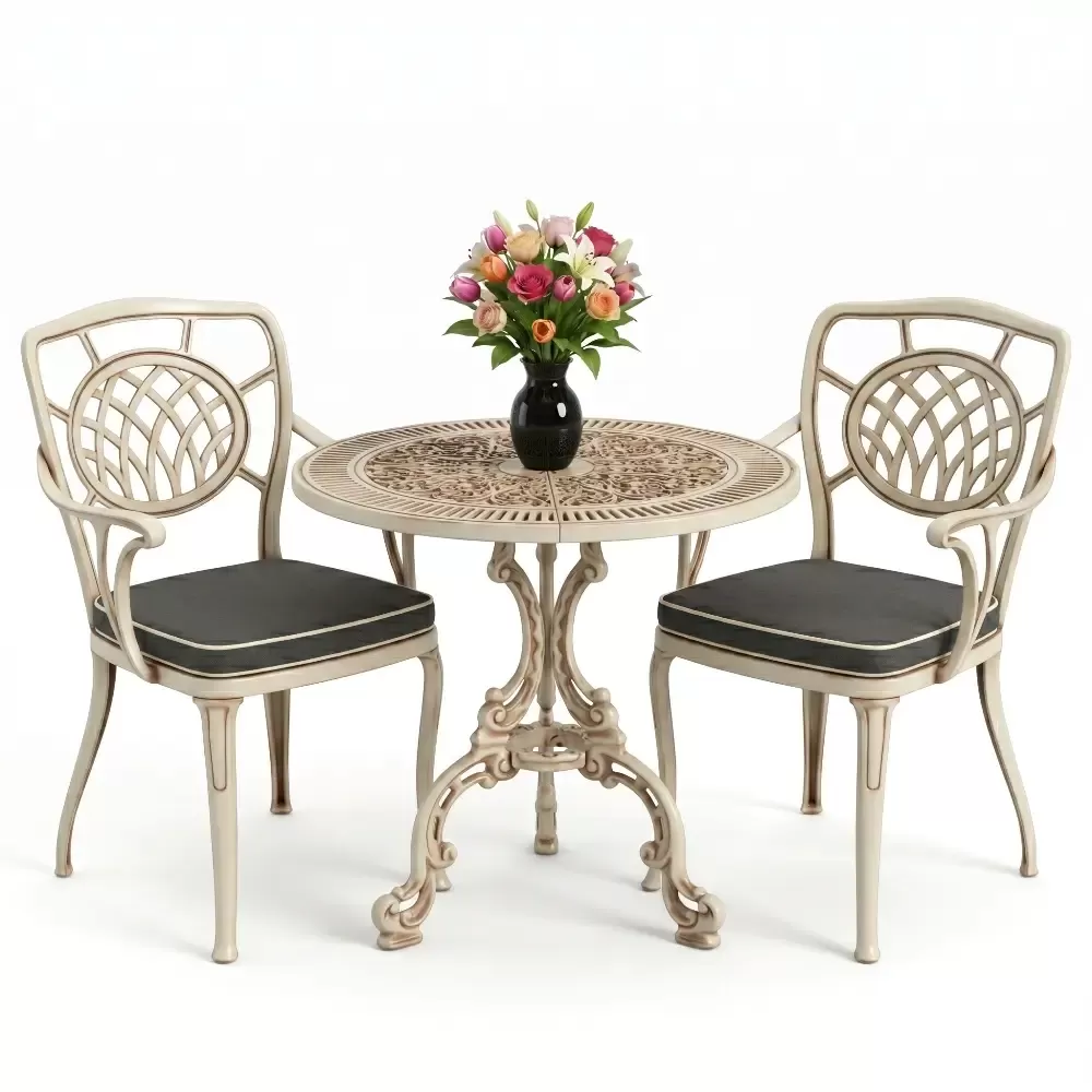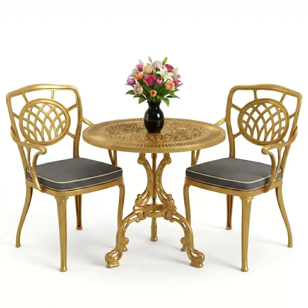 Yüksek mukavemetli alüminyum döküm malzemeden üretilen bu takım, doğa şartlarına karşı tam direnç gösterecek şekilde tasarlanmıştır. Geleneksel döküm demir mobilyaların aksine korozyona uğramaz ve paslanma yapmaz. Elektrostatik fırın boya teknolojisi ile desteklenen yüzey yapısı; UV ışınlarına, aşırı sıcaklara ve nemli ortamlara karşı üstün koruma sağlayarak ürünün ilk günkü zarafetini uzun yıllar korumasına yardımcı olur.