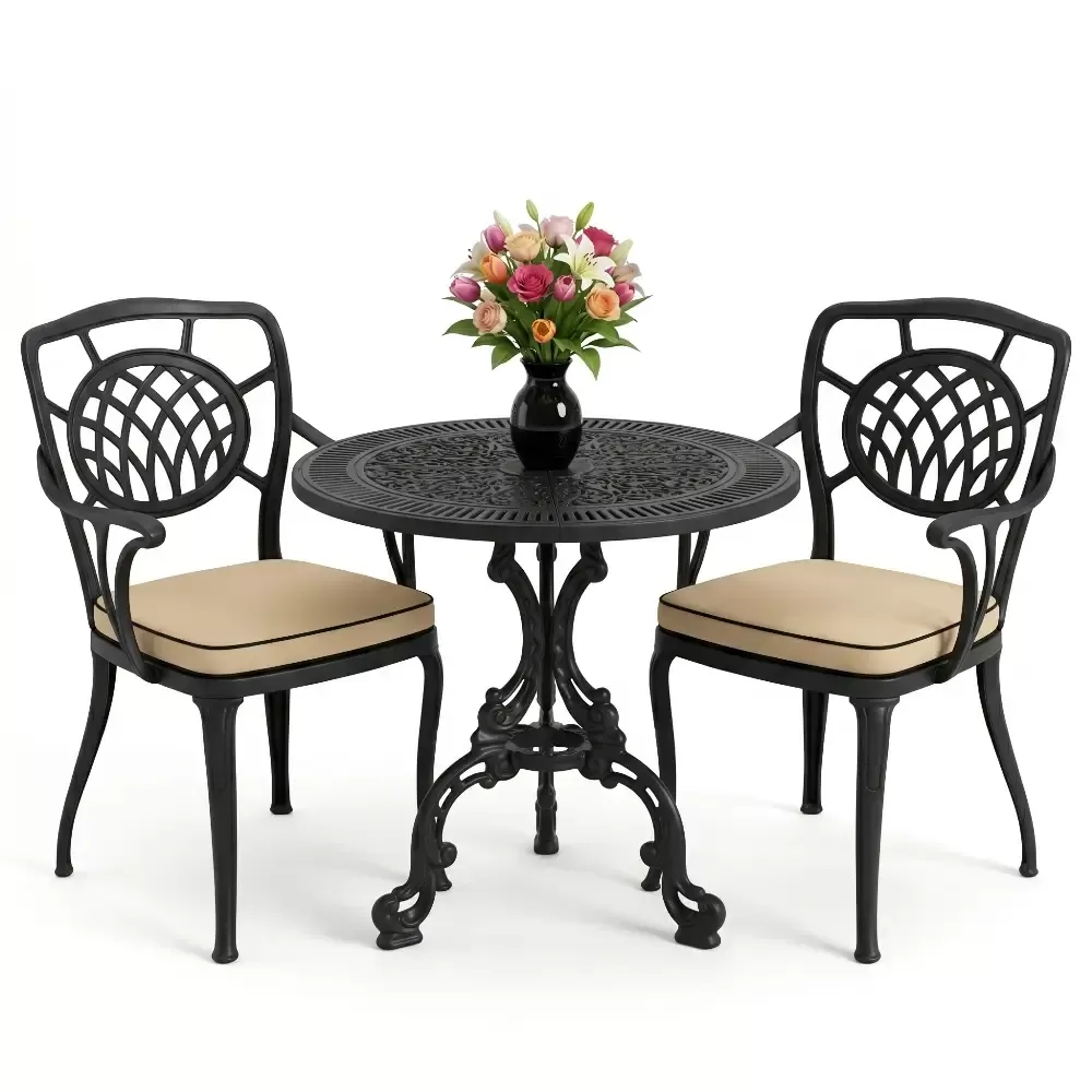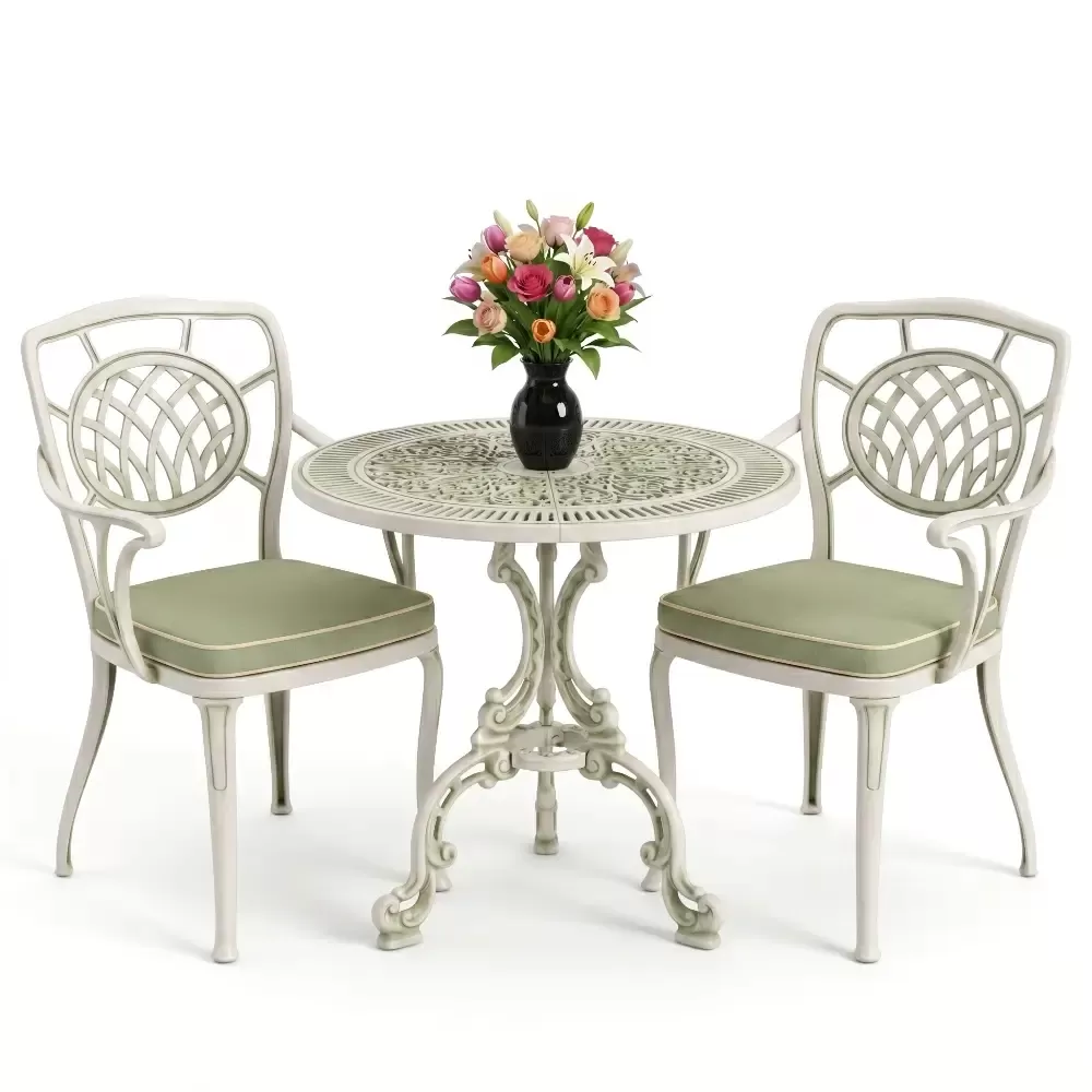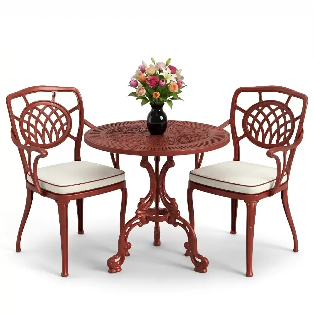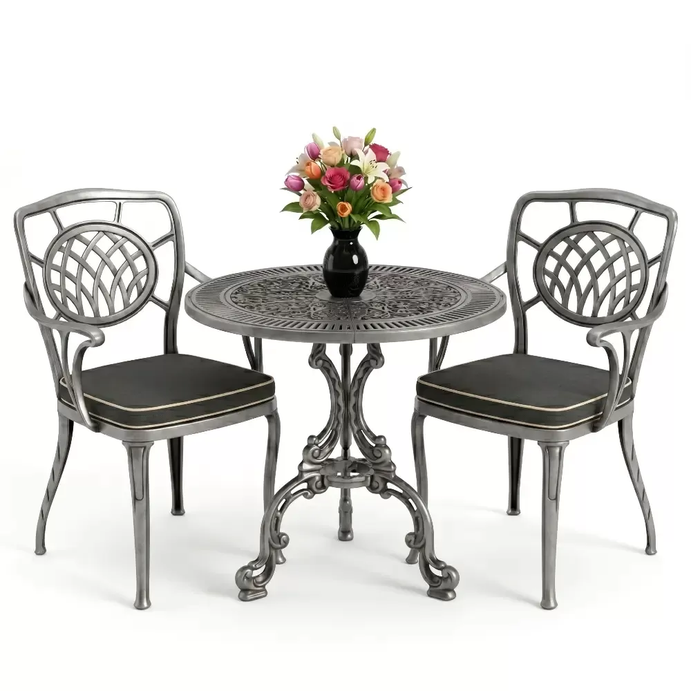 Yüksek mukavemetli alüminyum döküm malzemeden üretilen bu takım, doğa şartlarına karşı tam direnç gösterecek şekilde tasarlanmıştır. Geleneksel döküm demir mobilyaların aksine korozyona uğramaz ve paslanma yapmaz. Elektrostatik fırın boya teknolojisi ile desteklenen yüzey yapısı; UV ışınlarına, aşırı sıcaklara ve nemli ortamlara karşı üstün koruma sağlayarak ürünün ilk günkü zarafetini uzun yıllar korumasına yardımcı olur.