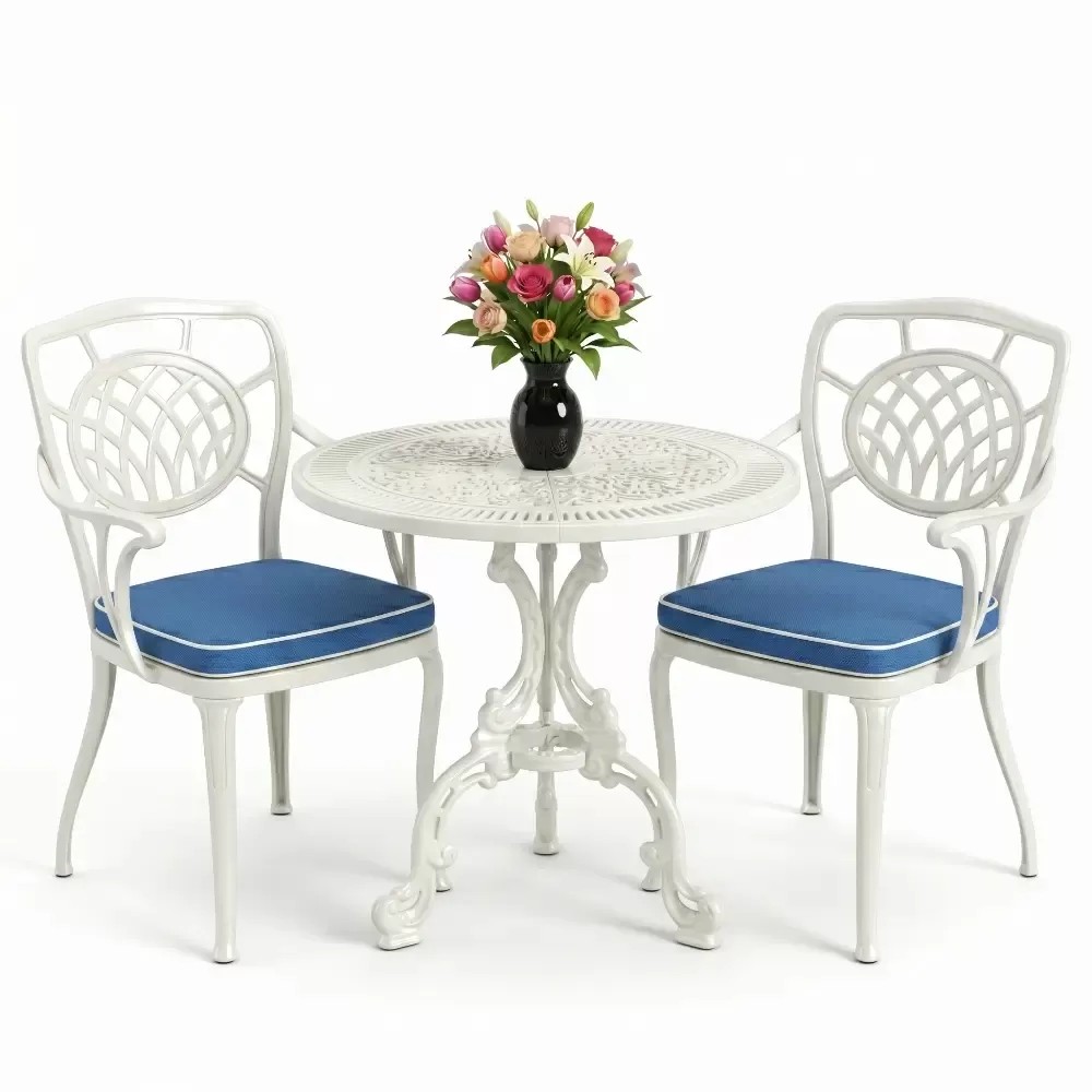 Bahçe, balkon ve teras gibi açık hava mekanlarınıza değer katmak için özel olarak geliştirilen Akbrella-nın 05 CAS serisi, nostaljik ferforje çizgilerini alüminyum döküm teknolojisinin sunduğu modern avantajlarla harmanlıyor. İki kişilik kapasitesi ile samimi ve konforlu bir oturma alanı yaratan bu set, 75x75 cm ölçülerindeki yuvarlak masası sayesinde en dar alanlarda bile ferah bir kullanım imkanı sunar.