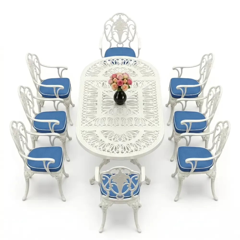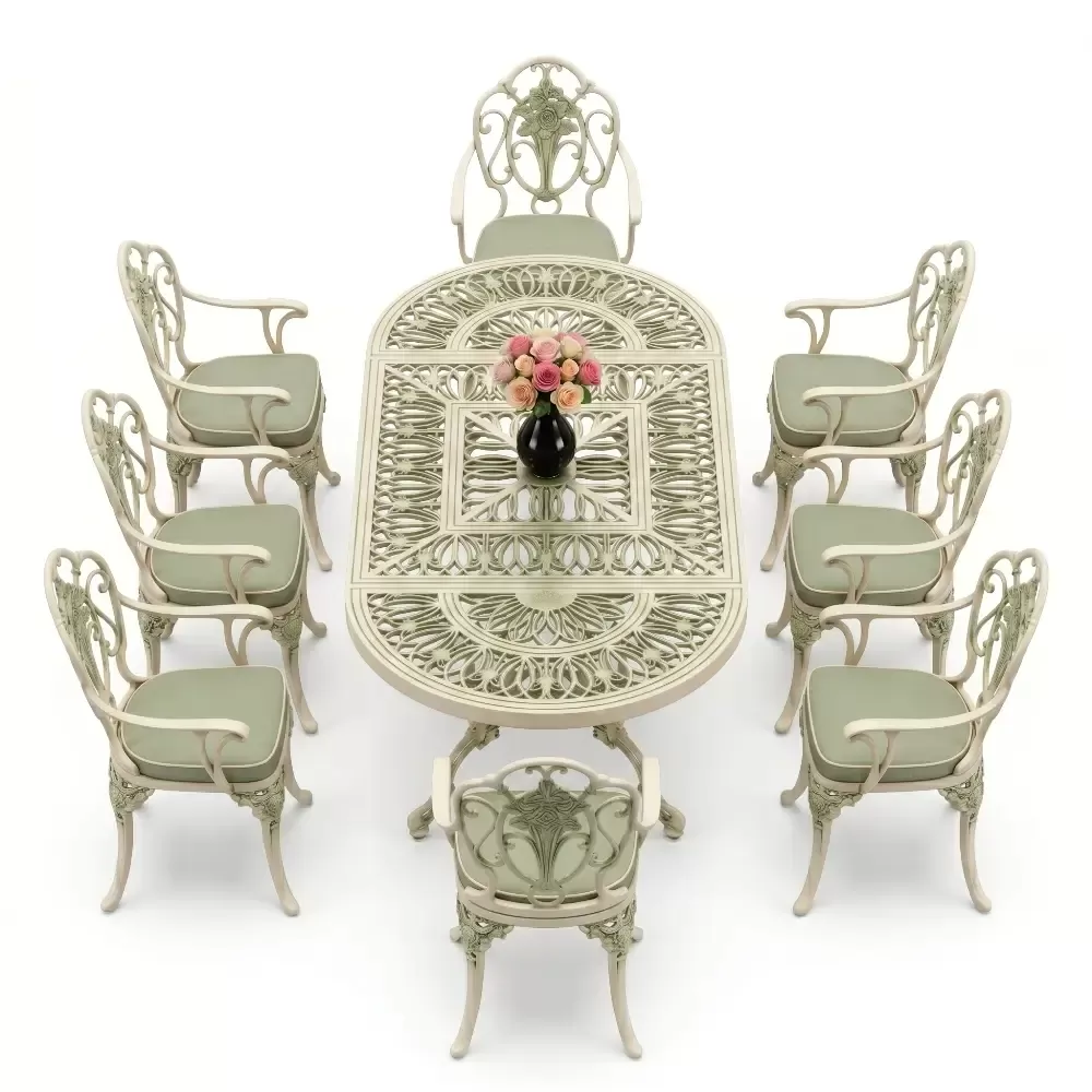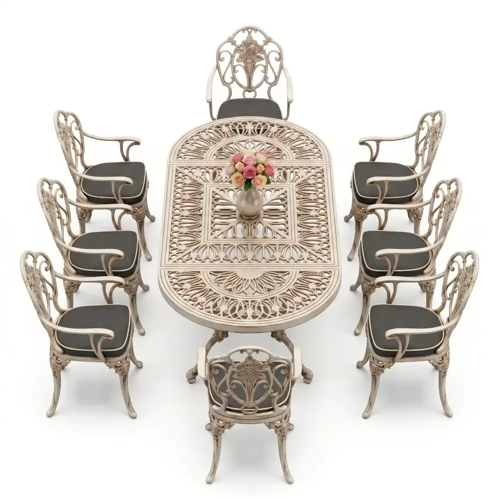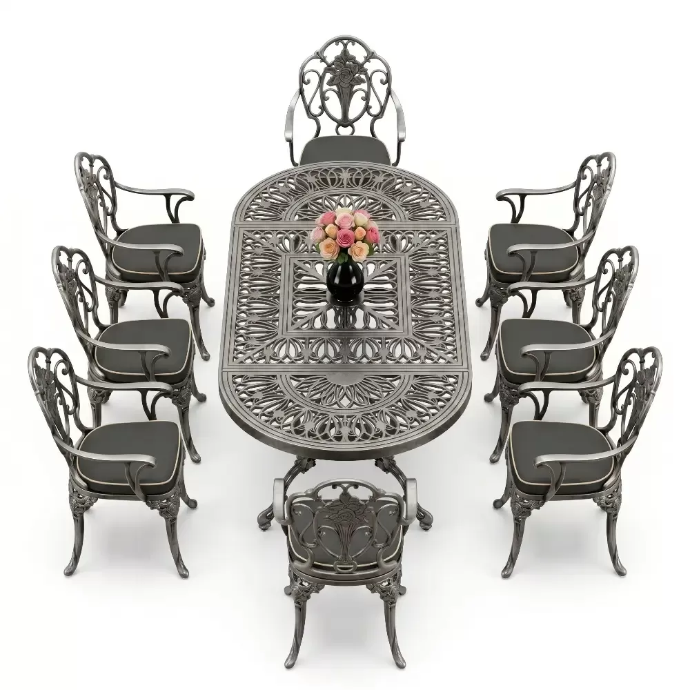 Oval Masa E:100 x D:200 x Y:72 cm 8 Kişilik güllü, kollu alüminyum döküm masa ve sandalye takımı (Mindersiz Fiyatı)