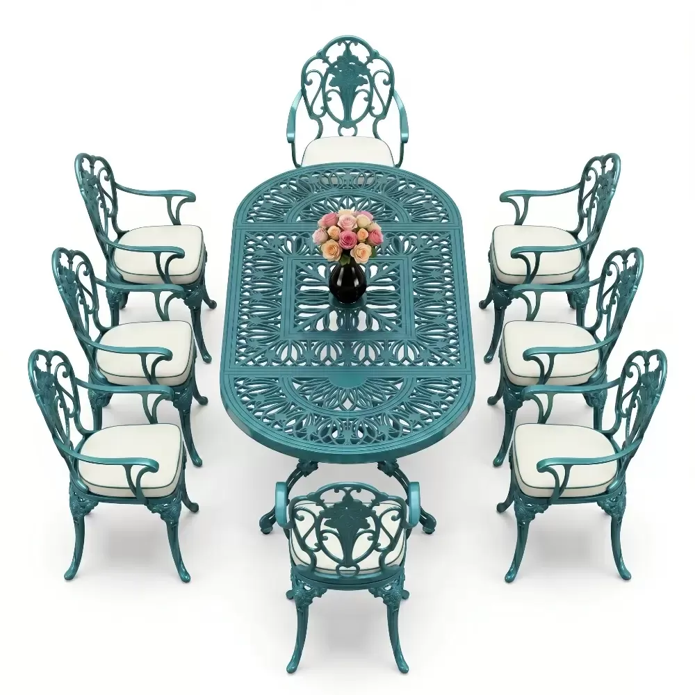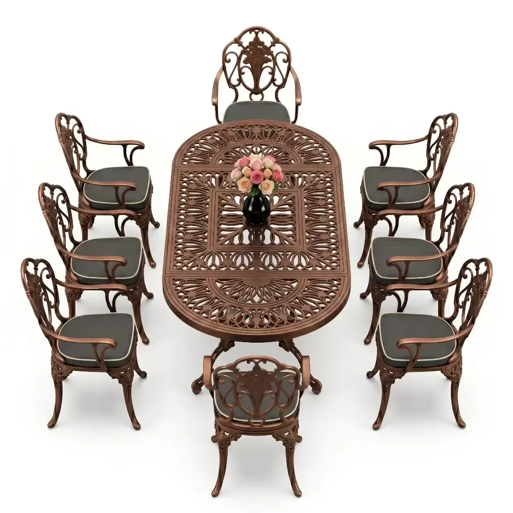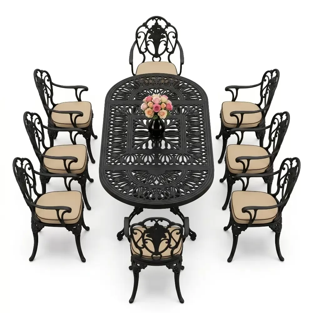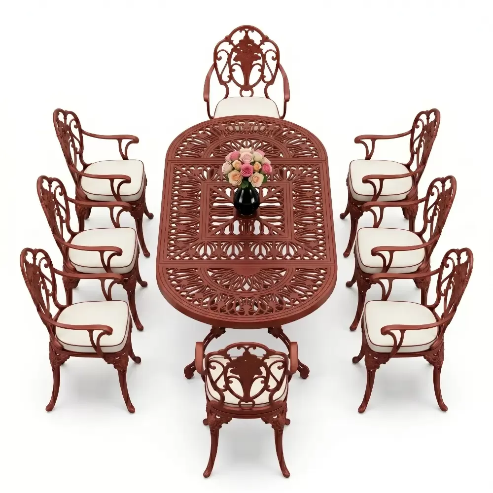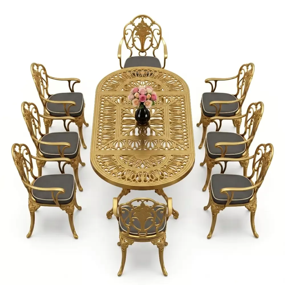 Oval Masa E:100 x D:200 x Y:72 cm 8 Kişilik güllü, kollu alüminyum döküm masa ve sandalye takımı (Mindersiz Fiyatı)