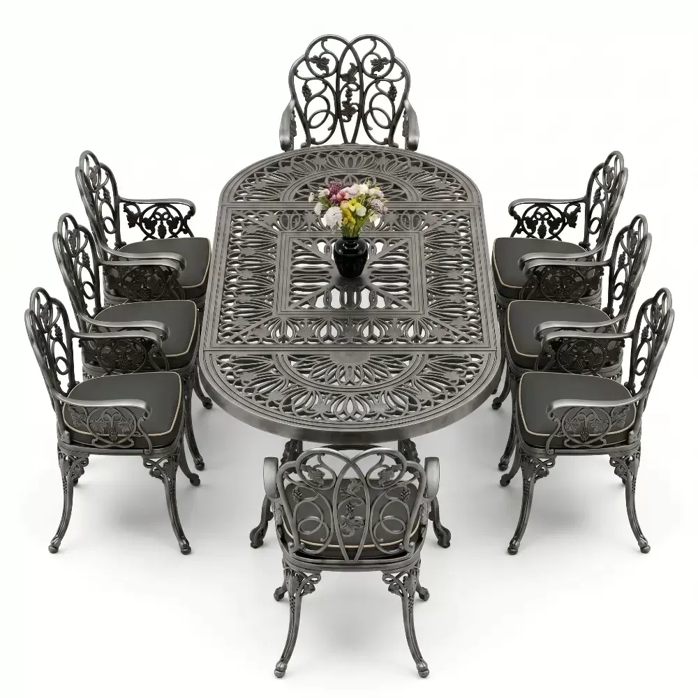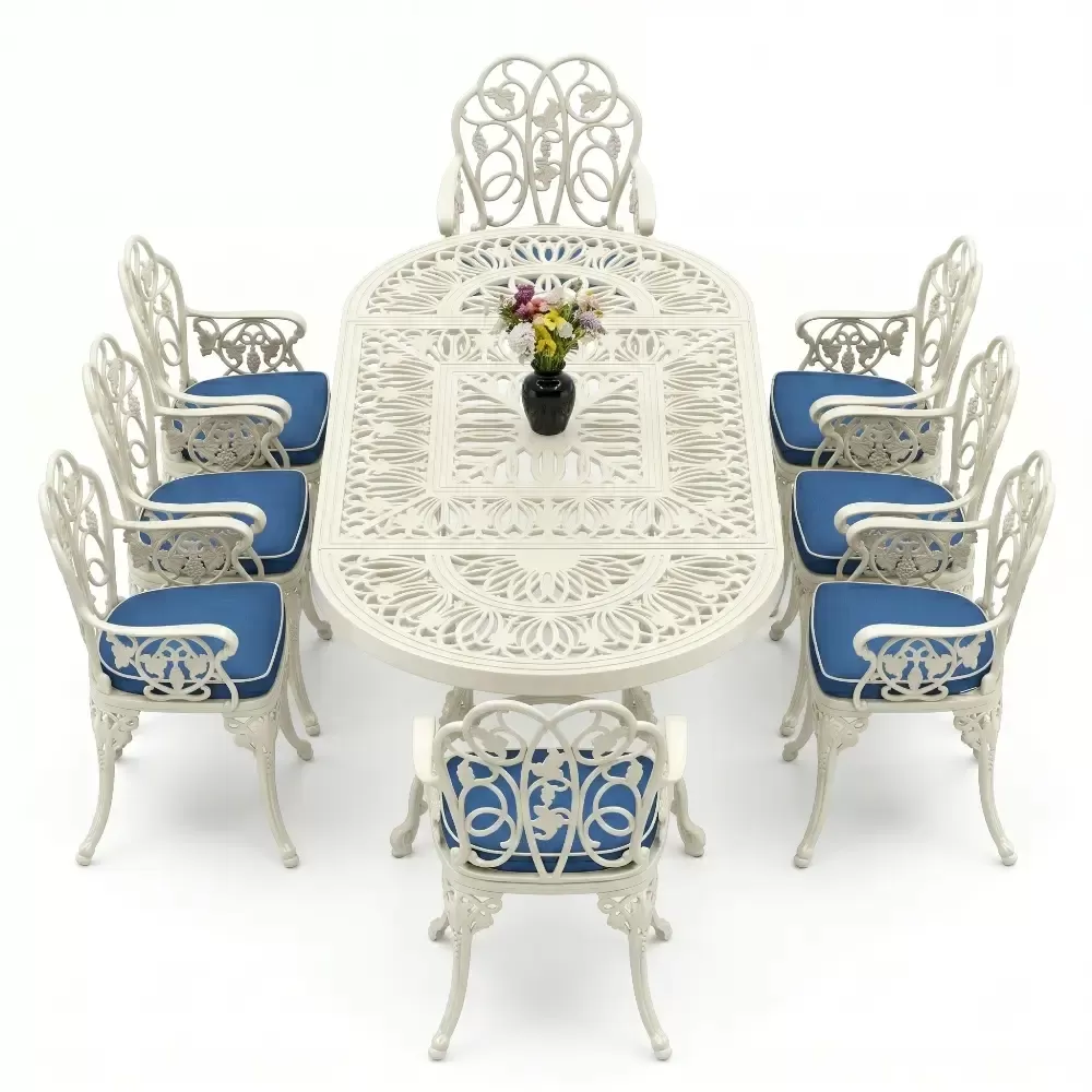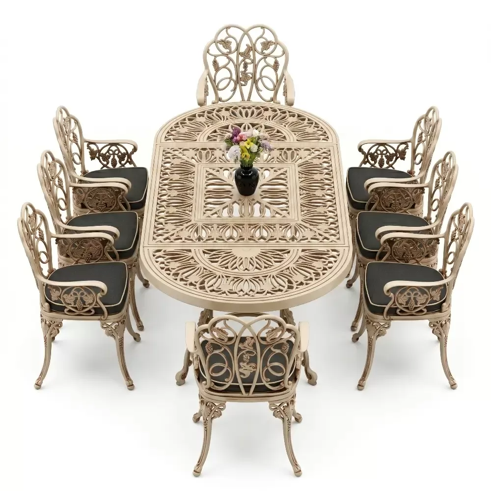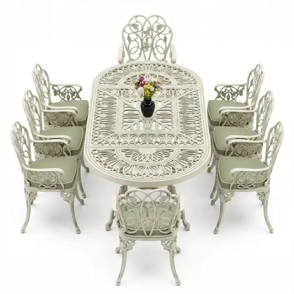 Klasik ferforje sanatını hafif ve paslanmaz alüminyum döküm teknolojisiyle harmanlayan bu set, açık hava yaşam alanlarınıza saray zarafeti getirir.