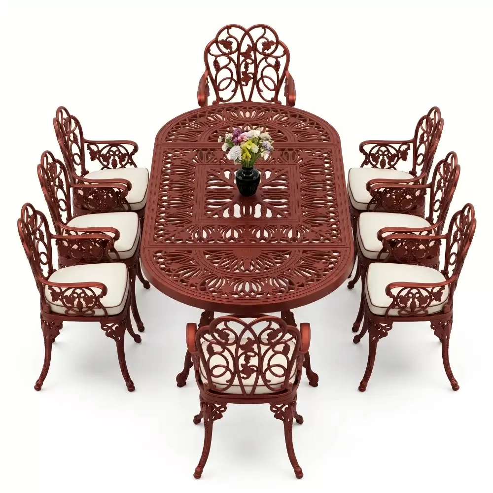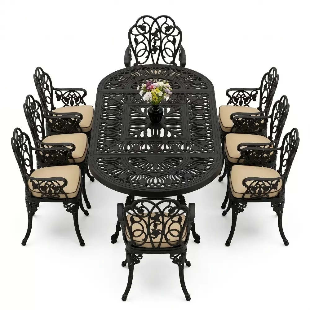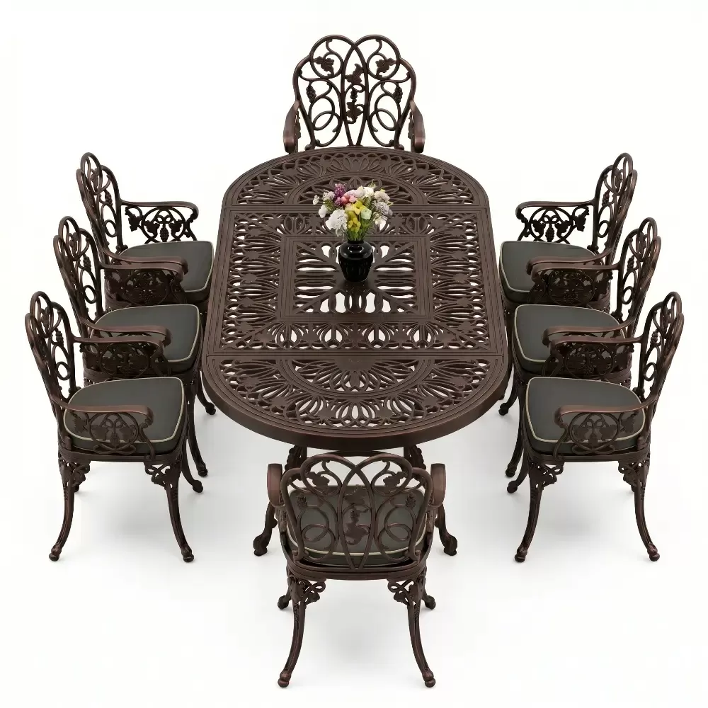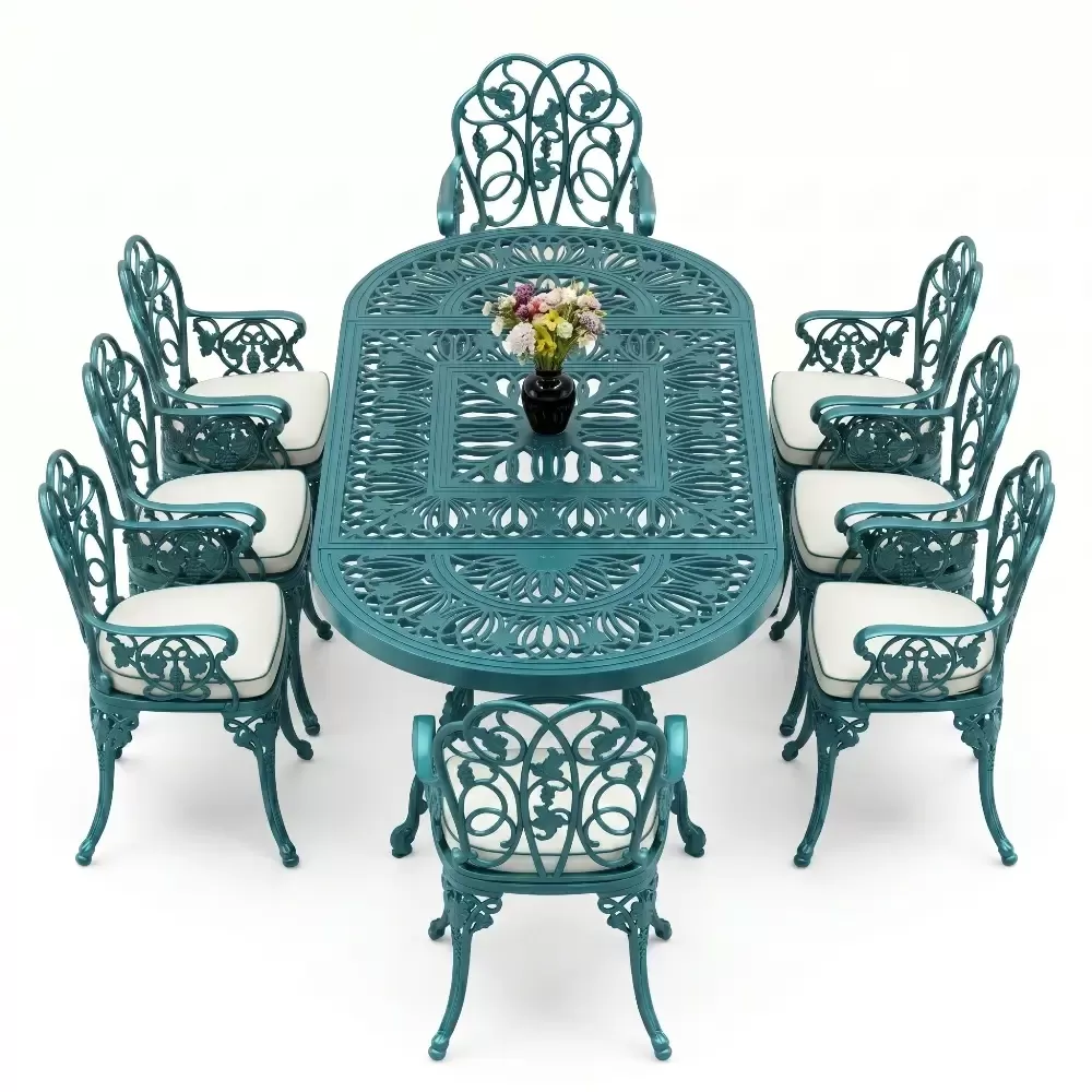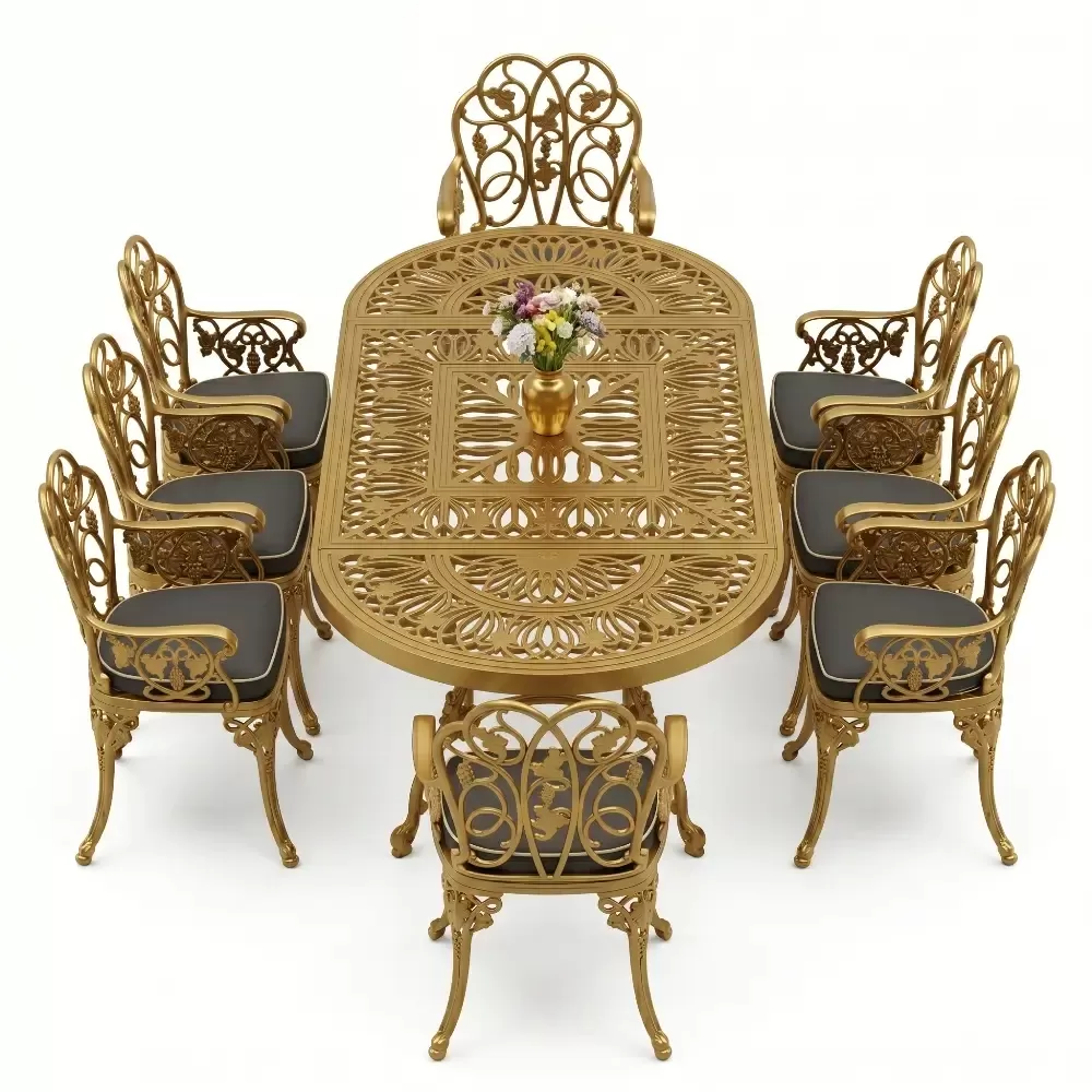 Klasik ferforje sanatını hafif ve paslanmaz alüminyum döküm teknolojisiyle harmanlayan bu set, açık hava yaşam alanlarınıza saray zarafeti getirir.