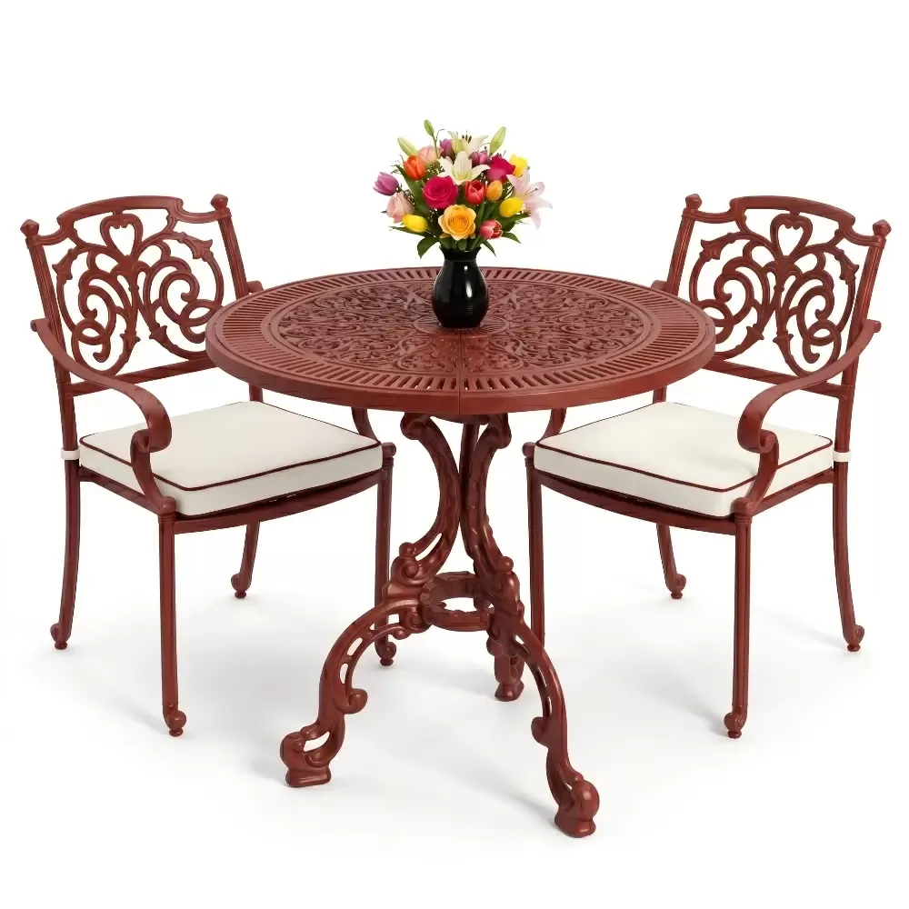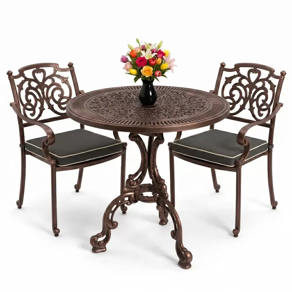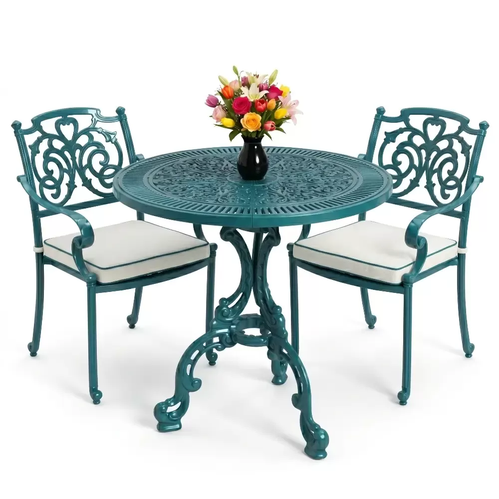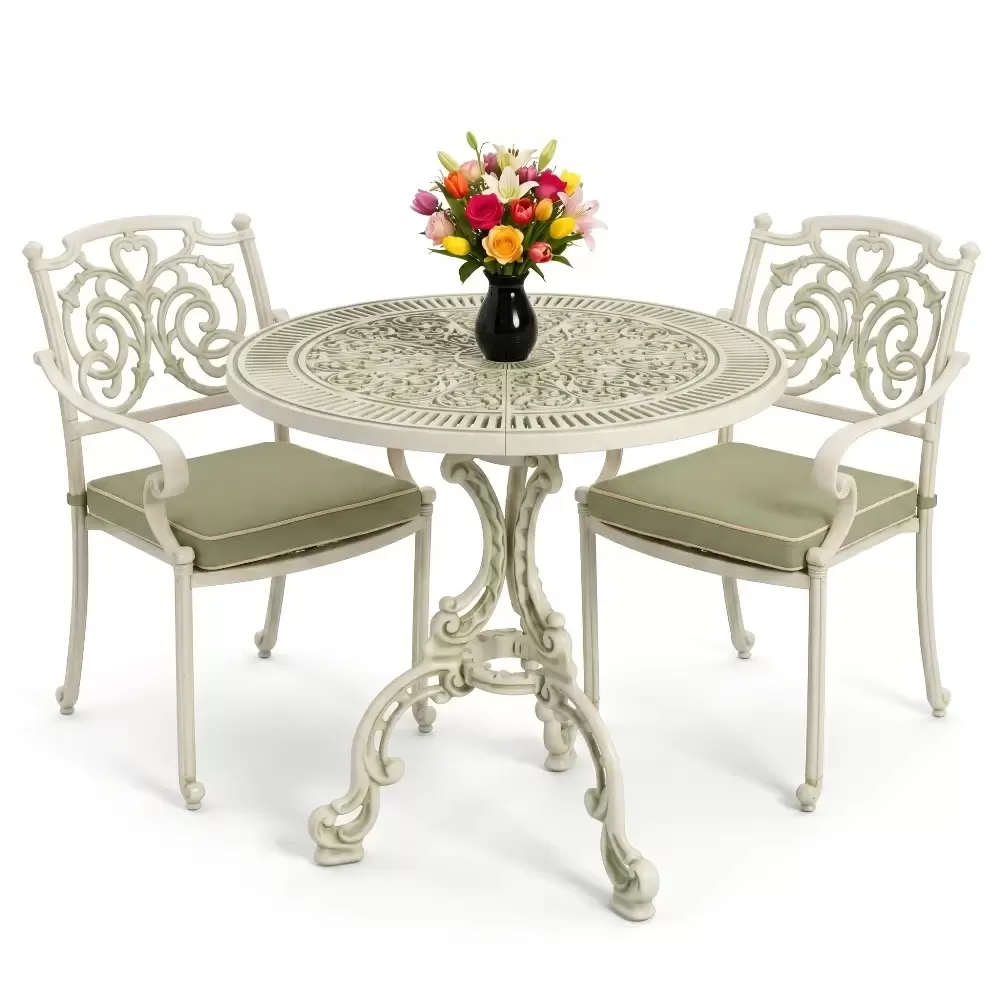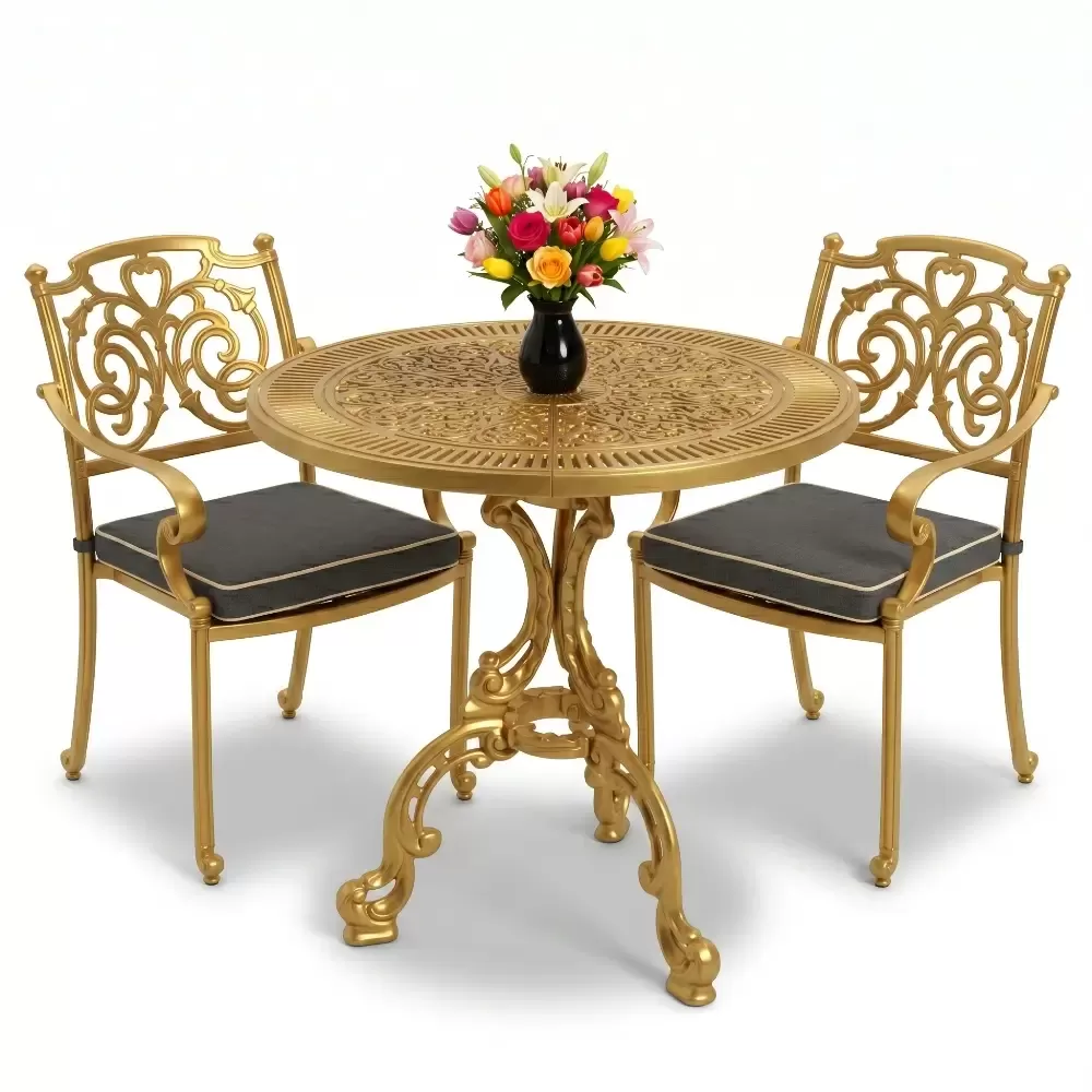 Yüksek kaliteli alüminyum döküm malzemeden üretilen bu takım, doğa şartlarına karşı tam direnç gösterecek şekilde tasarlanmıştır. Demir mobilyaların aksine paslanma ve korozyon riski barındırmaz. Elektrostatik fırın boya teknolojisi ile desteklenen yüzey dokusu; UV ışınlarına, aşırı sıcaklara ve nemli ortamlara karşı üstün koruma sağlayarak ürünün ilk günkü zarafetini uzun yıllar boyunca korumasına yardımcı olur.