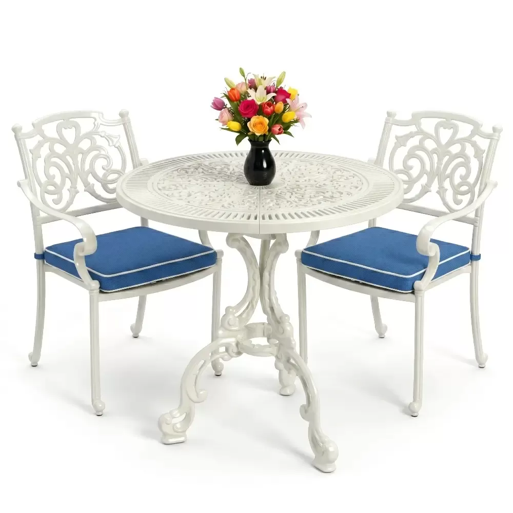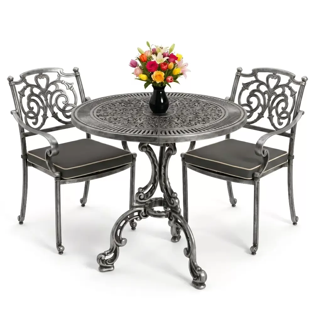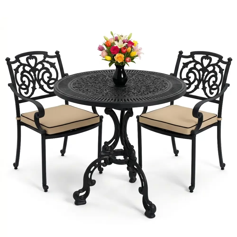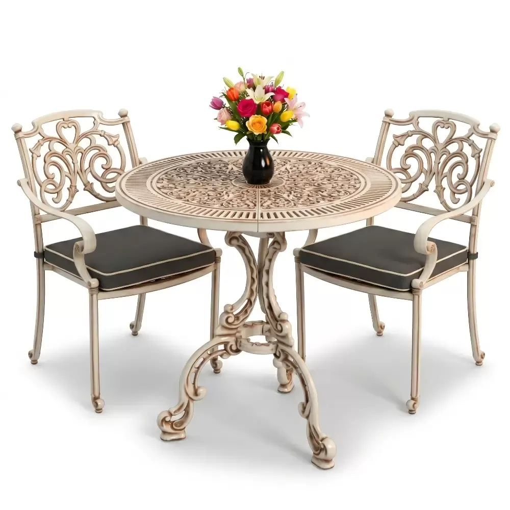 Bahçe, balkon ve teras gibi dış mekanlarda şıklığı ve sağlamlığı bir arada arayanlar için Akbrella-nın 06 CAS serisi ideal bir çözümdür. Geleneksel ferforje sanatının estetiğini modern alüminyum döküm teknolojisi ile birleştiren bu set, iki kişilik kapasitesiyle kompakt ve zarif bir kullanım sunar. 75x75 cm ölçülerindeki yuvarlak masa formu, sosyal etkileşimi artıran ergonomik bir yapı sunarken en dar alanlarda dahi ferah bir atmosfer oluşturur.