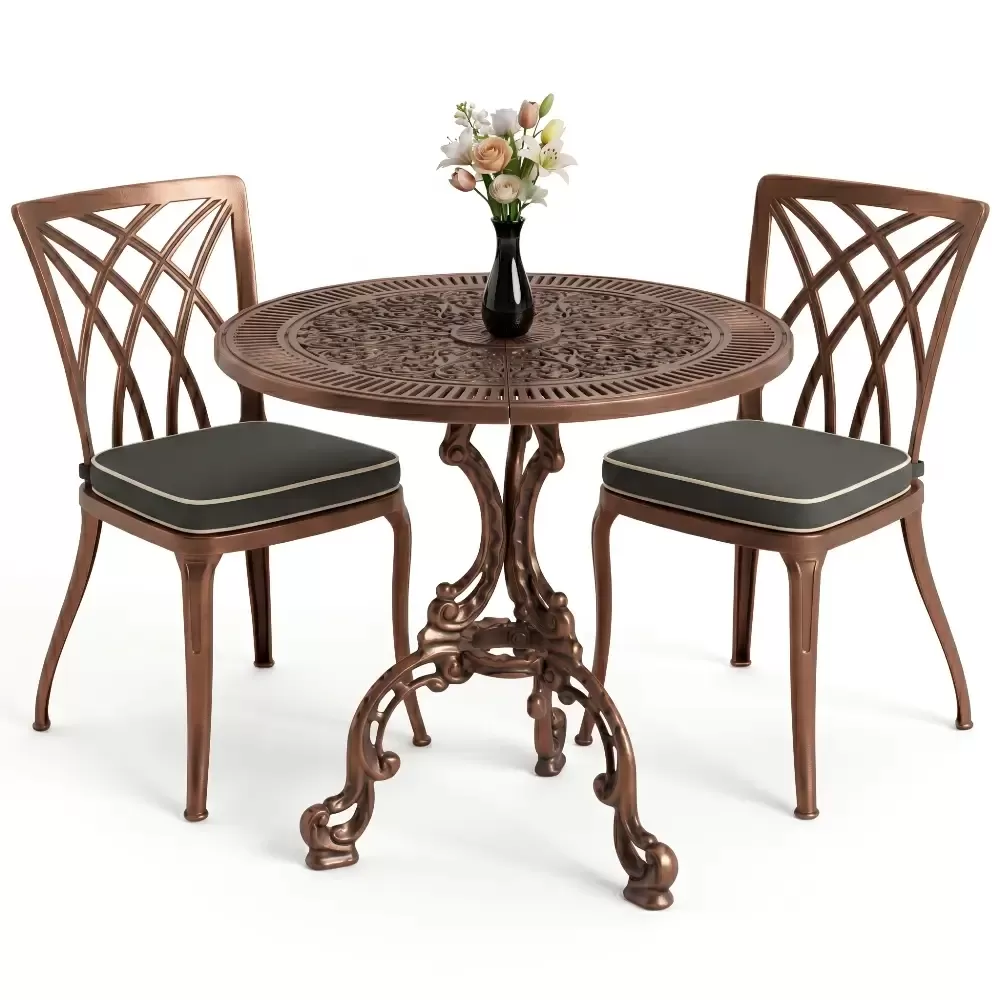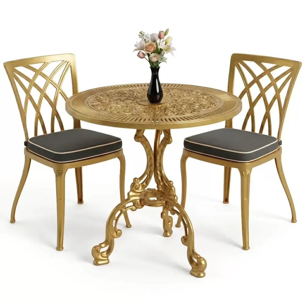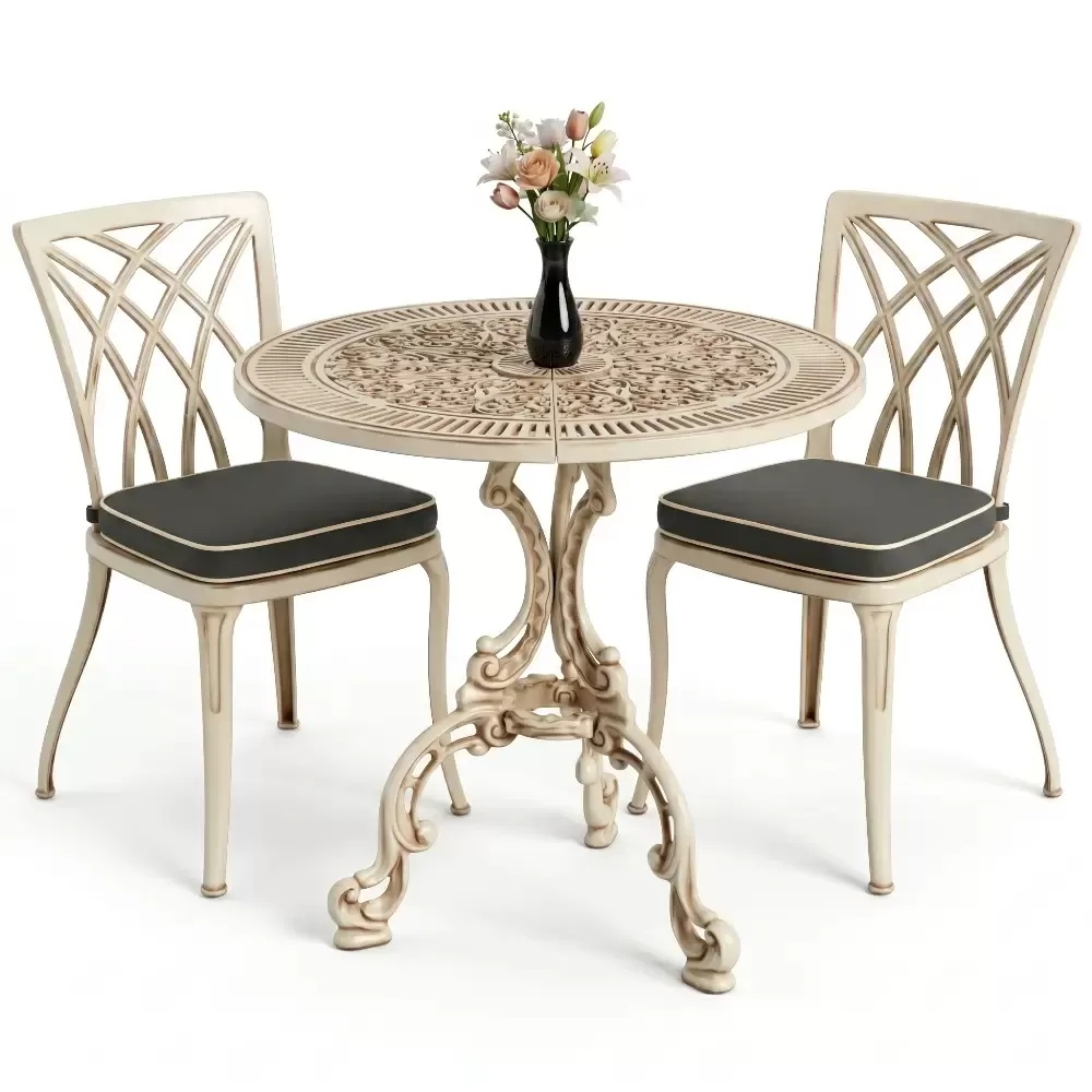 Yüksek kaliteli alüminyum döküm malzemeden üretilen bu takım, doğa şartlarına karşı tam direnç gösterecek şekilde tasarlanmıştır. Demir mobilyaların aksine paslanma ve korozyon riski barındırmaz. Elektrostatik fırın boya teknolojisi ile desteklenen yüzey dokusu; UV ışınlarına, aşırı sıcaklara ve nemli ortamlara karşı üstün koruma sağlayarak ürünün ilk günkü zarafetini uzun yıllar boyunca korumasına yardımcı olur.