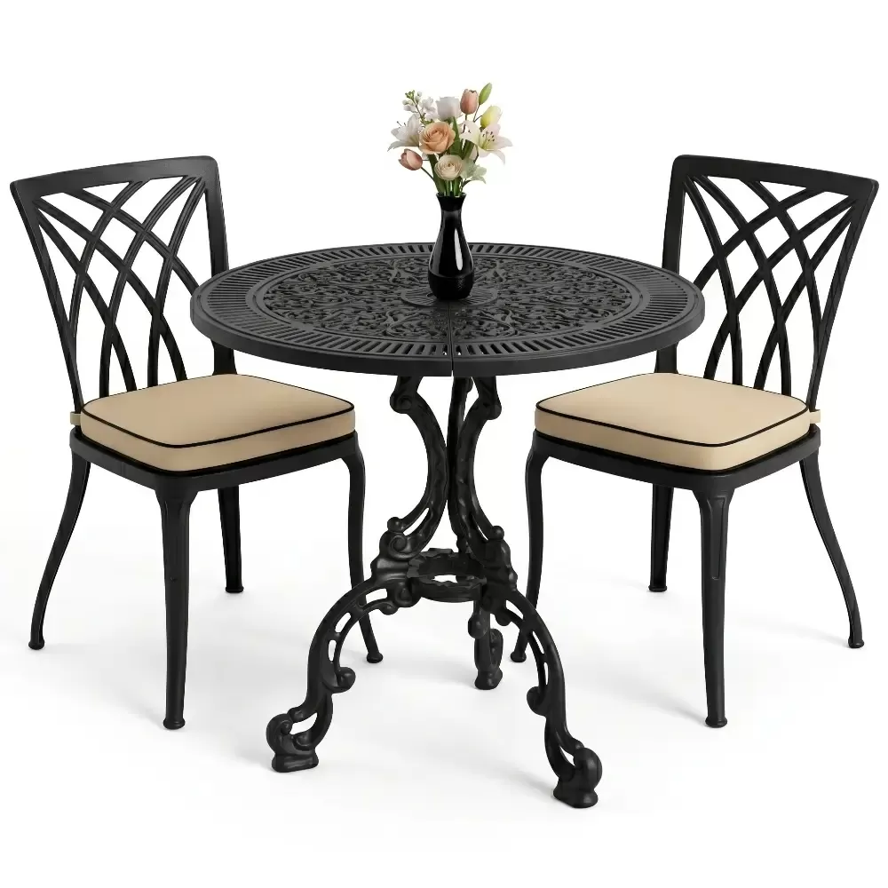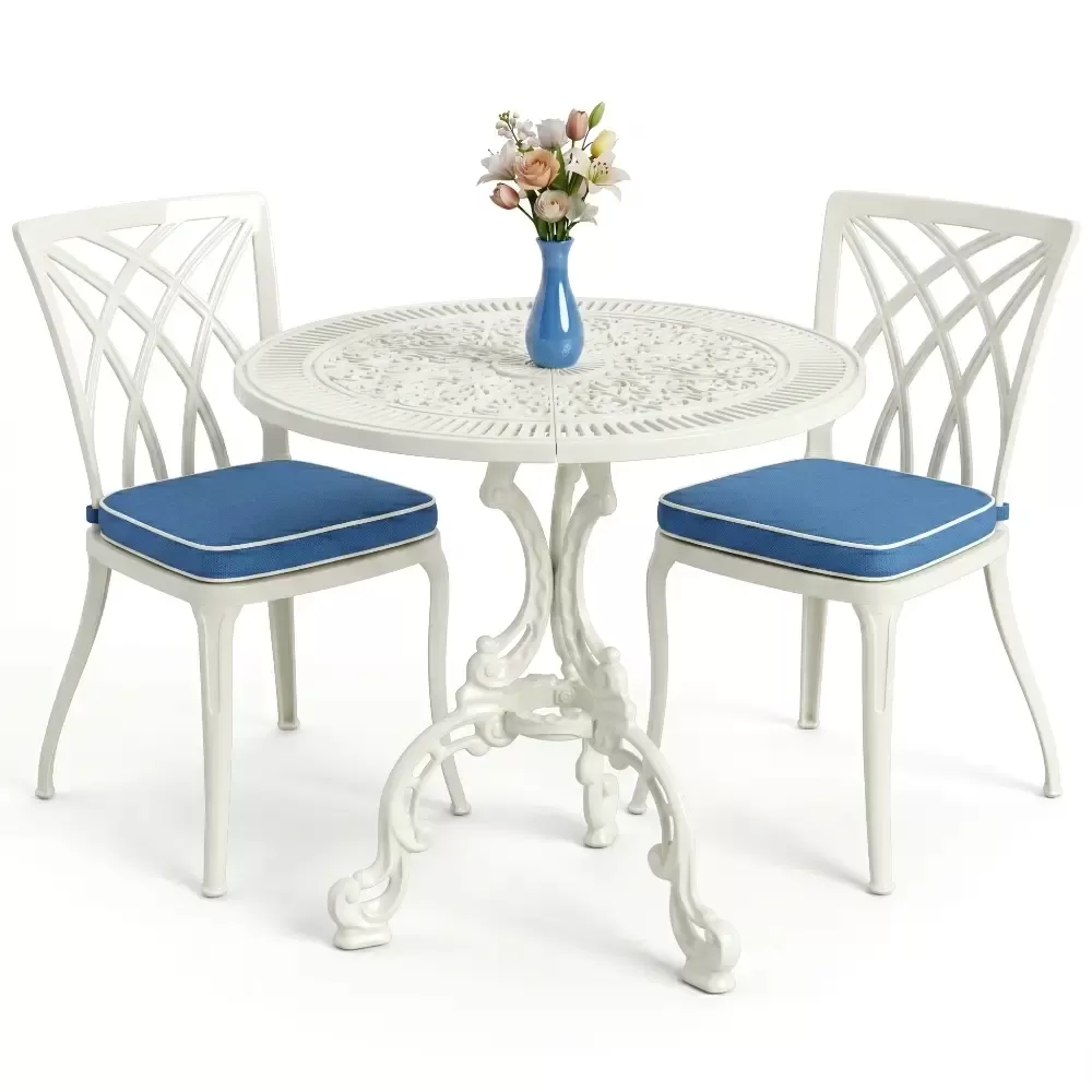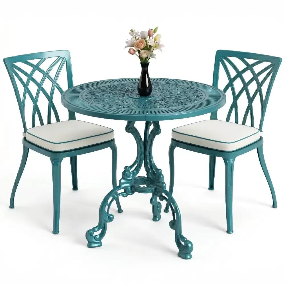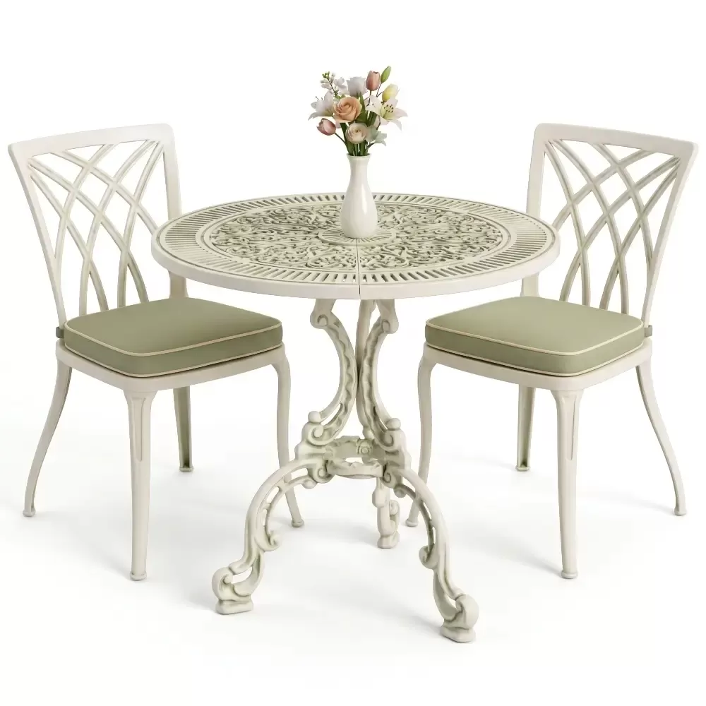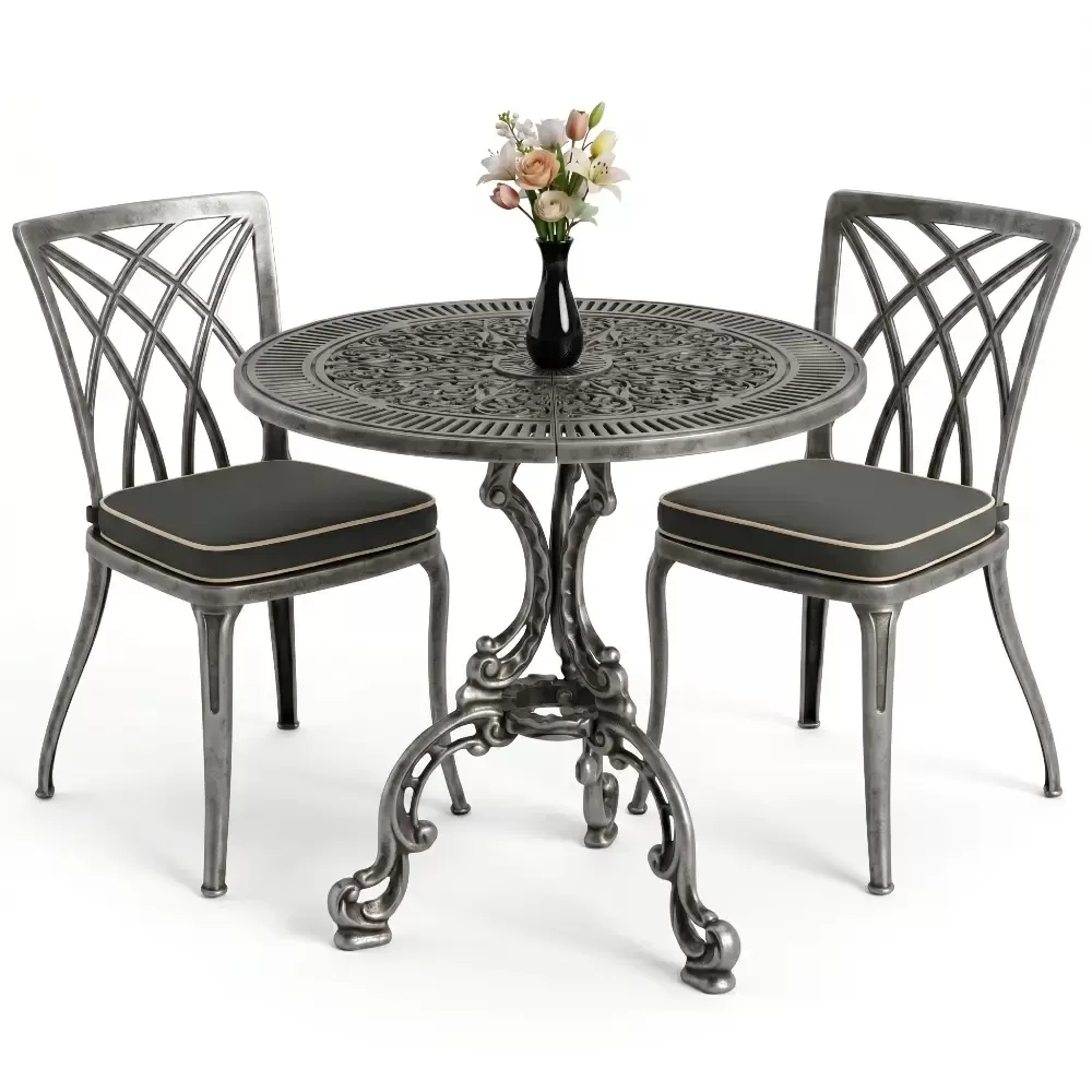 Bahçe, balkon ve teras gibi dış mekanlarda şıklığı ve sağlamlığı bir arada arayanlar için Akbrella-nın 08 CAS serisi ideal bir çözümdür. Geleneksel ferforje sanatının estetiğini modern alüminyum döküm teknolojisi ile birleştiren bu set, iki kişilik kapasitesiyle kompakt ve zarif bir kullanım sunar. 75x75 cm ölçülerindeki yuvarlak masa formu, sosyal etkileşimi artıran ergonomik bir yapı sunarken en dar alanlarda dahi ferah bir atmosfer oluşturur.