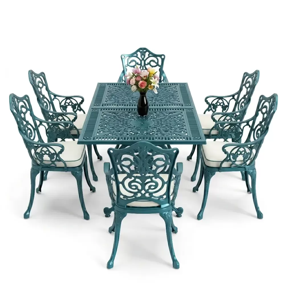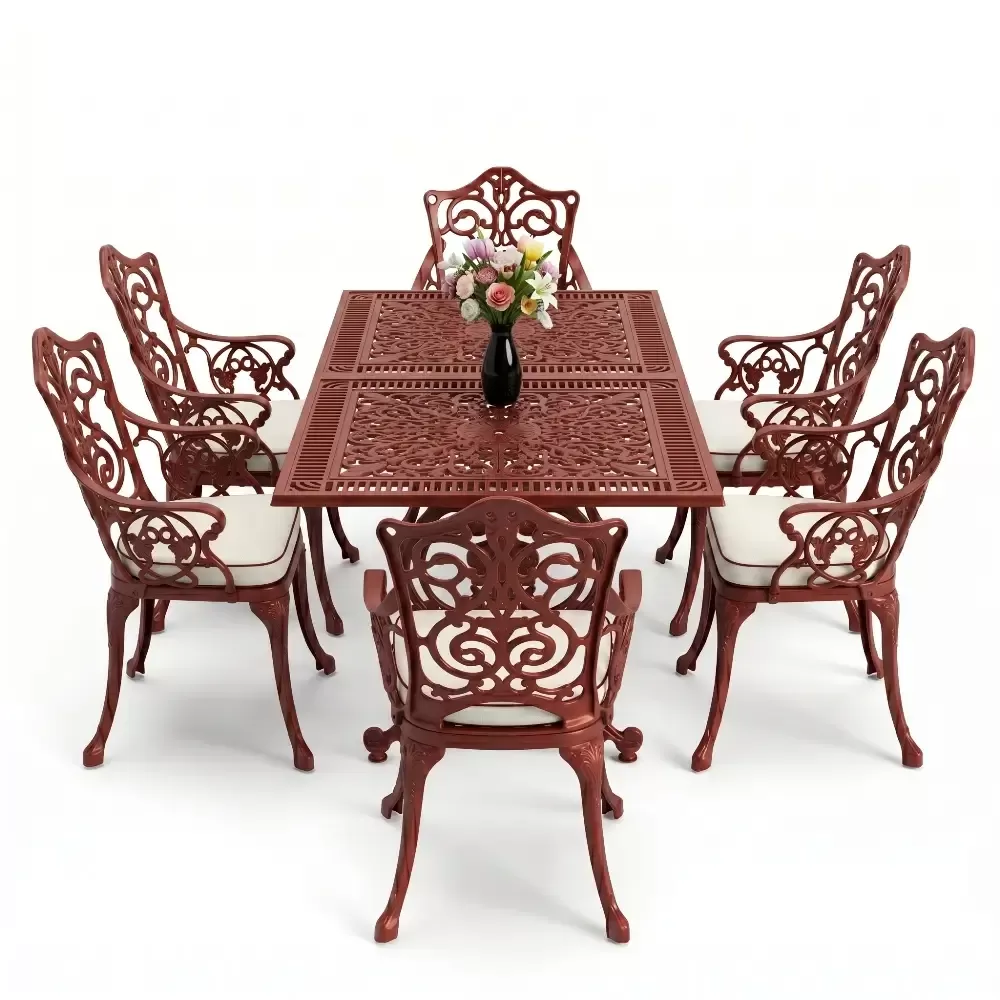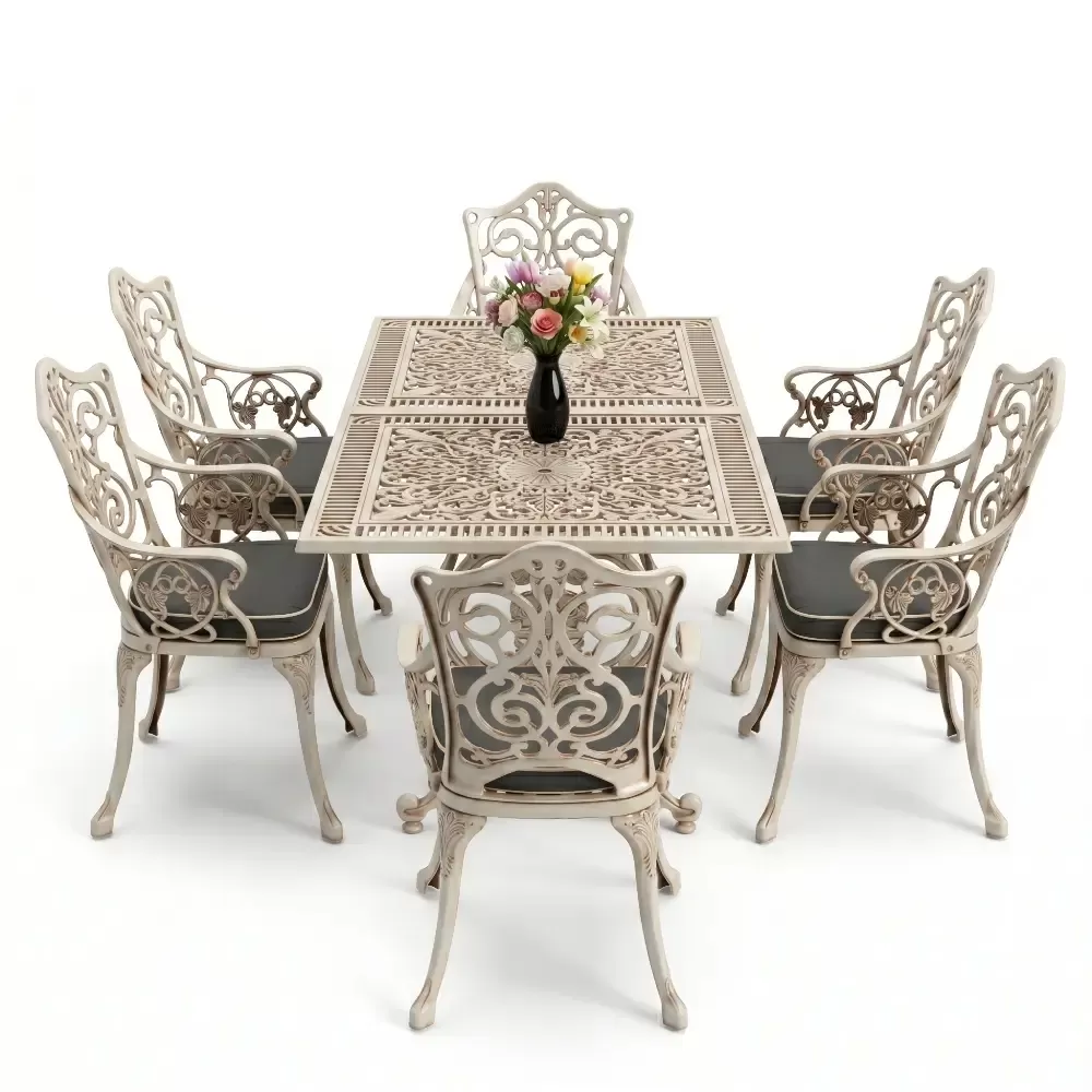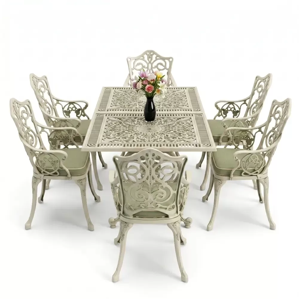 Bahce ve teras dekorasyonunda klasik ferforje ruhunu modern dokum teknolojisiyle bulusturan 84 MHS yemek takimi, dikdortgen formuyla mekaninizda maksimum verimlilik saglar. Altı kisilik genis oturma kapasitesi ve ergonomik yapisi sayesinde uzun soluklu sohbetlerinize eslik etmek uzere Akbrella kalitesiyle uretilmistir. Aluminyum dokumun sagladigi paslanmazlik ve yuksek dayaniklilik ozellikleri, urunu sadece bir mobilya degil, uzun yillara meydan okuyan bir yatirim haline getiriyor.