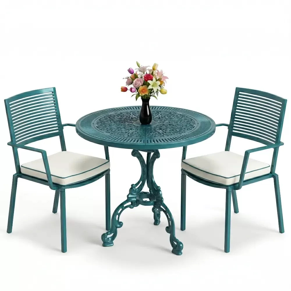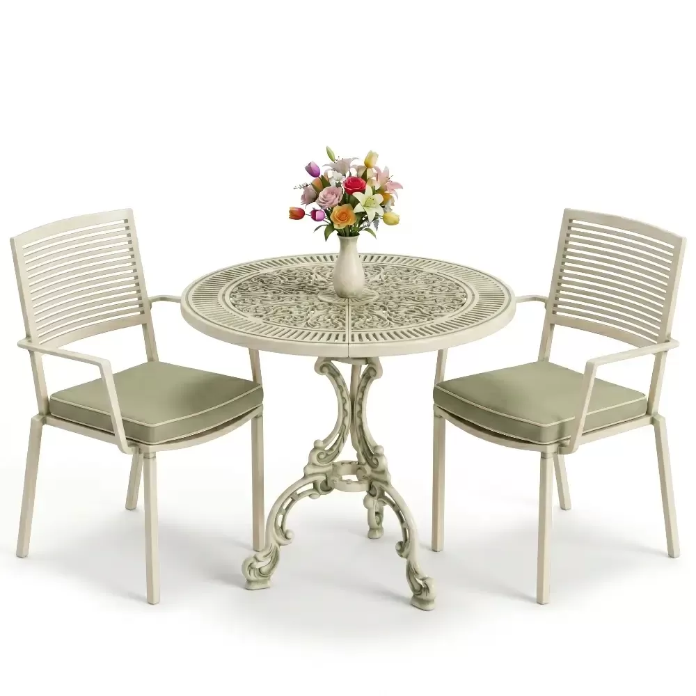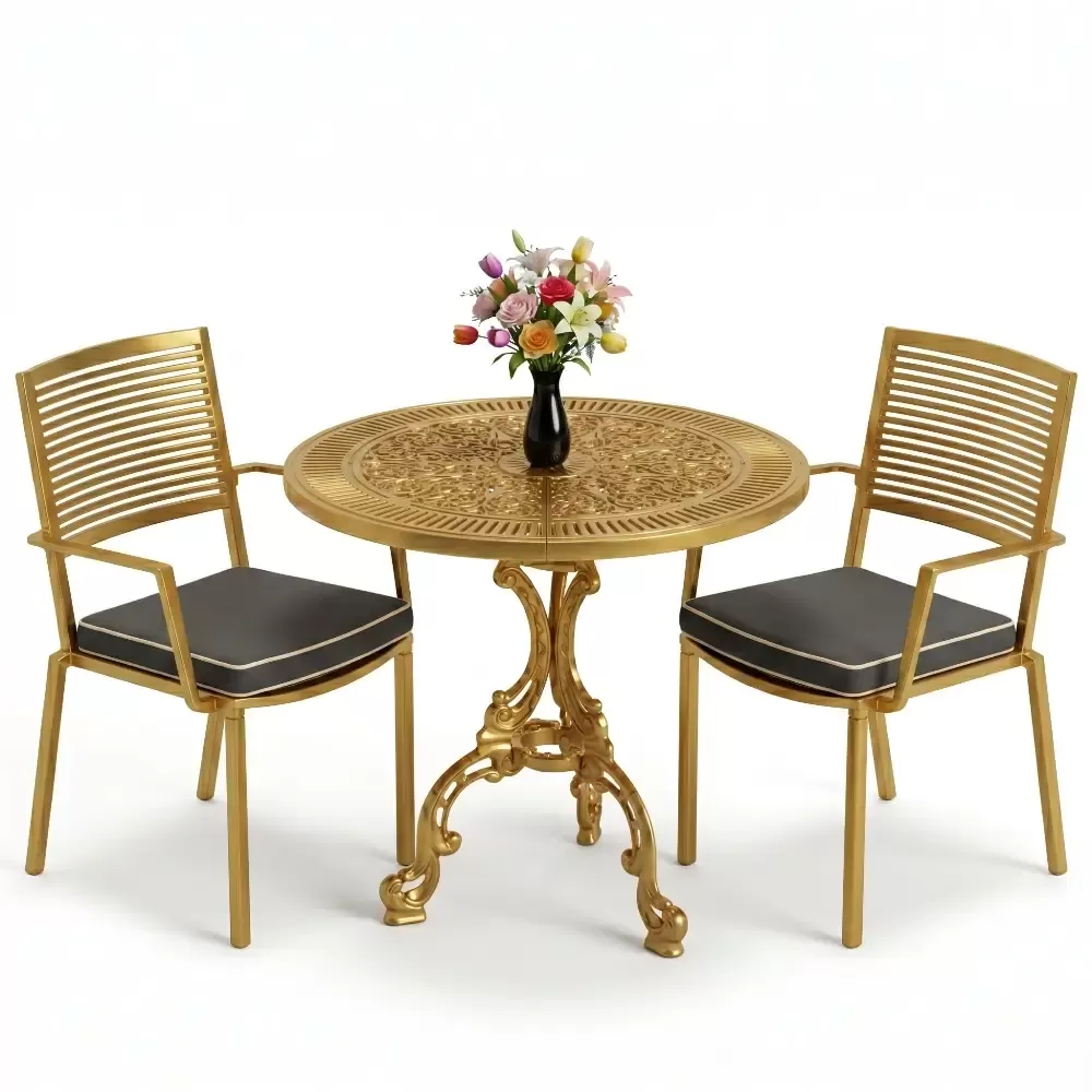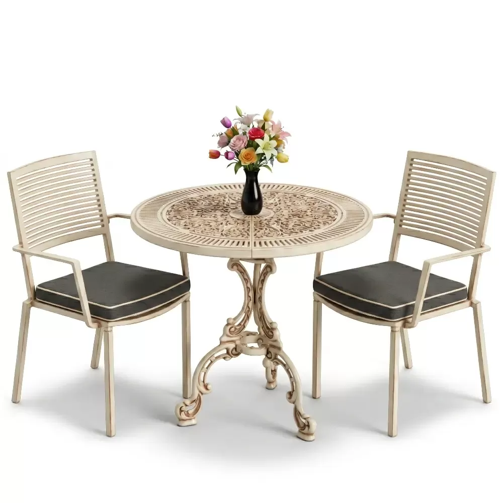 Bahçe, balkon ve teras gibi dış mekanlarda şıklığı ve sağlamlığı bir arada arayanlar için Akbrella-nın 10 CAS serisi ideal bir çözümdür. Geleneksel ferforje sanatının estetiğini modern alüminyum döküm teknolojisi ile birleştiren bu set, iki kişilik kapasitesiyle kompakt ve zarif bir kullanım sunar. 75x75 cm ölçülerindeki yuvarlak masa formu, sosyal etkileşimi artıran ergonomik bir yapı sunarken en dar alanlarda dahi ferah bir atmosfer oluşturur.