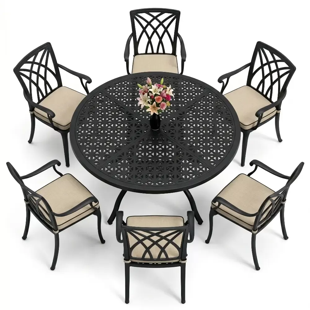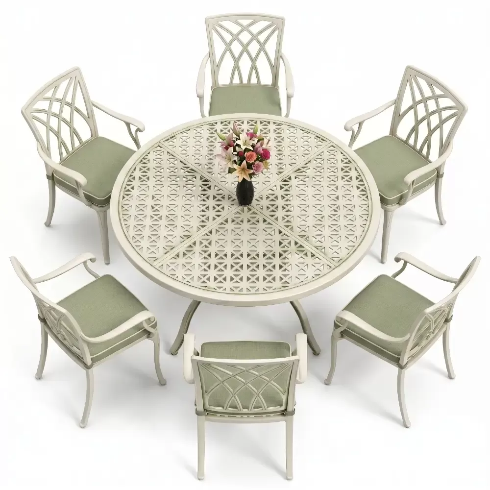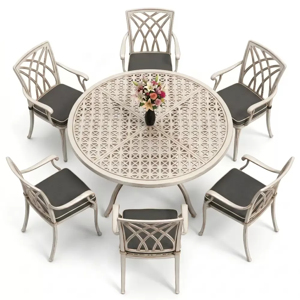 160 cm çapindaki yuvarlak masa yapisi, tum misafirlerin birbirini gorebildigi esit mesafeli ve sosyal bir oturum duzeni saglar. Keskin koselerin olmayisi, bahce ve teraslarda akiskan bir hareket alani yaratir. Takimda yer alan kollu sandalyeler, sirt ve kol destegi ile uzun sureli oturumlarda ust duzey konfor sunar. 74 cm ideal yukseklik degeri, teknik muhendislik hesaplamalariyla yemek ergonomisine en uygun sekilde kurgulanmistir.