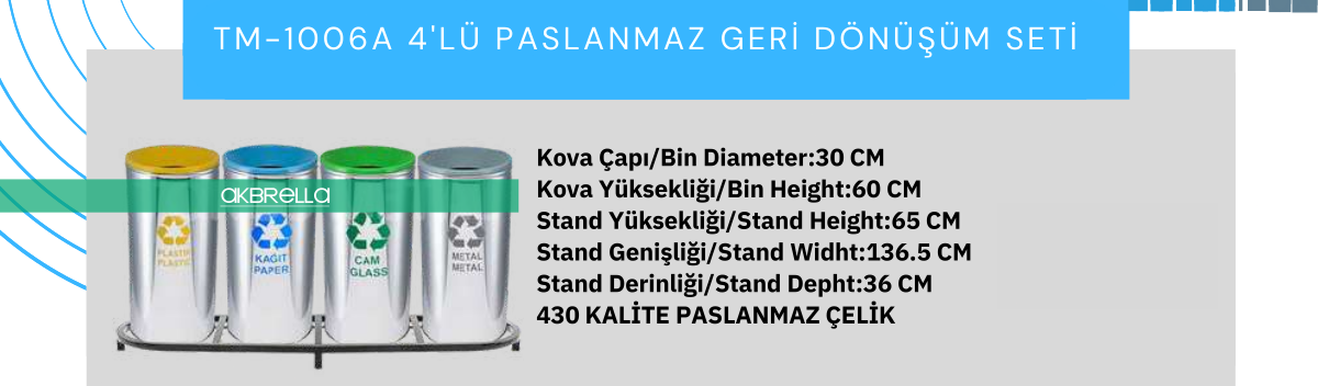 Akbrella olarak, çevreye duyarlı ve kaliteli ürünler üretmeye özen gösteriyoruz. TRS 1006 A 4'lü Geri Dönüşüm Çöp Kovası setimiz, hem işlevsel hem de estetik tasarımıyla yaşam alanlarınıza değer katarken, doğamızın korunmasına da katkıda bulunur.