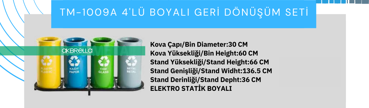 Akbrella olarak, çevreye duyarlı ve kullanıcı dostu ürünler tasarlamaya özen gösteriyoruz. TRS 1009 A 4'lü Geri Dönüşüm Çöp Kovası Setimiz, hem çevre bilincini artırmayı hem de geri dönüşümü renkli ve kolay bir hale getirmeyi hedefliyor.