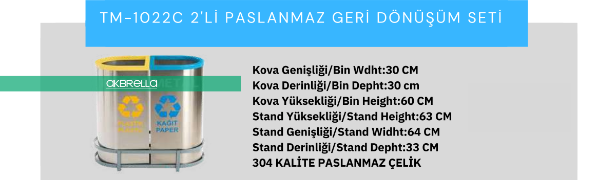 Akbrella olarak, çevreye duyarlı ve kaliteli ürünler sunmayı ilke ediniyoruz. TRS 1022 C 2'li geri dönüşüm çöp kovası seti, bu anlayışla üretilmiş, dayanıklı, kullanışlı ve estetik bir üründür.