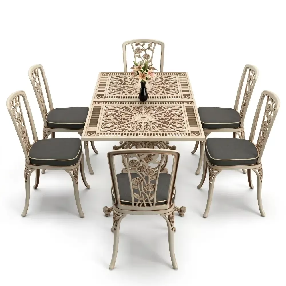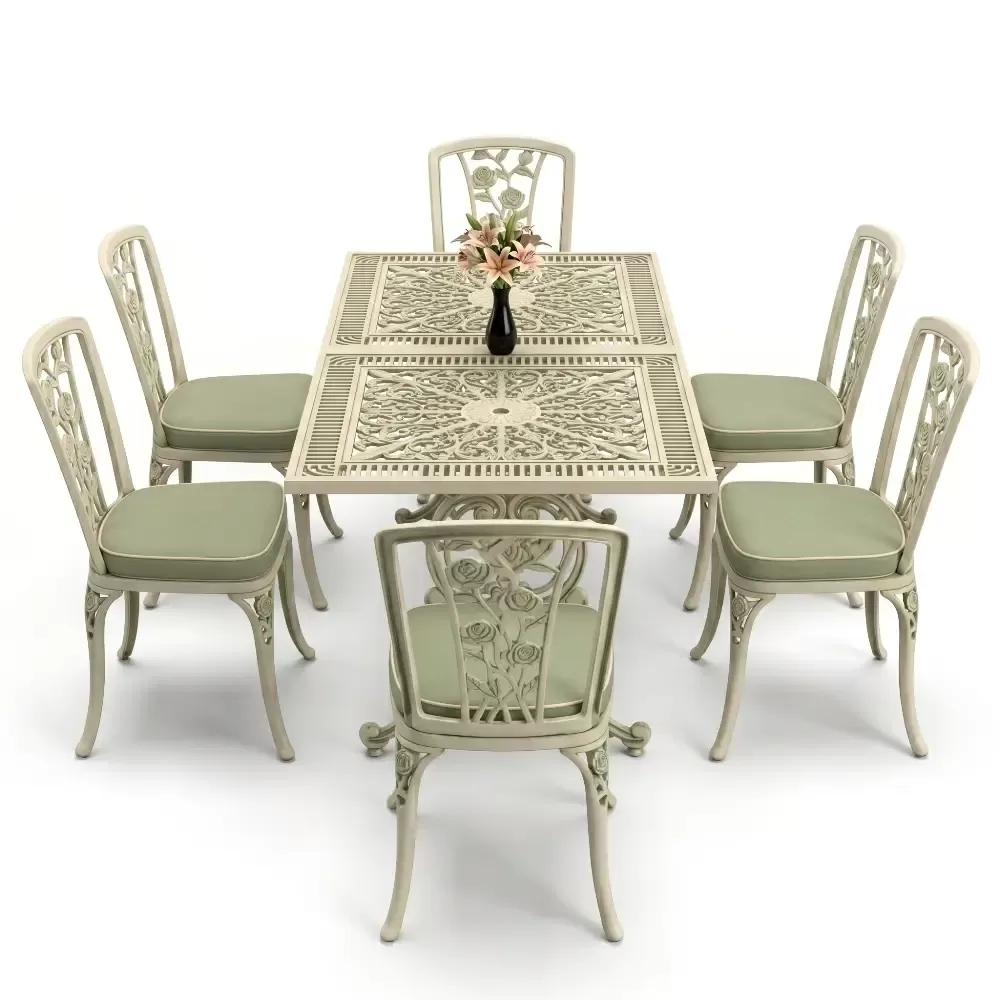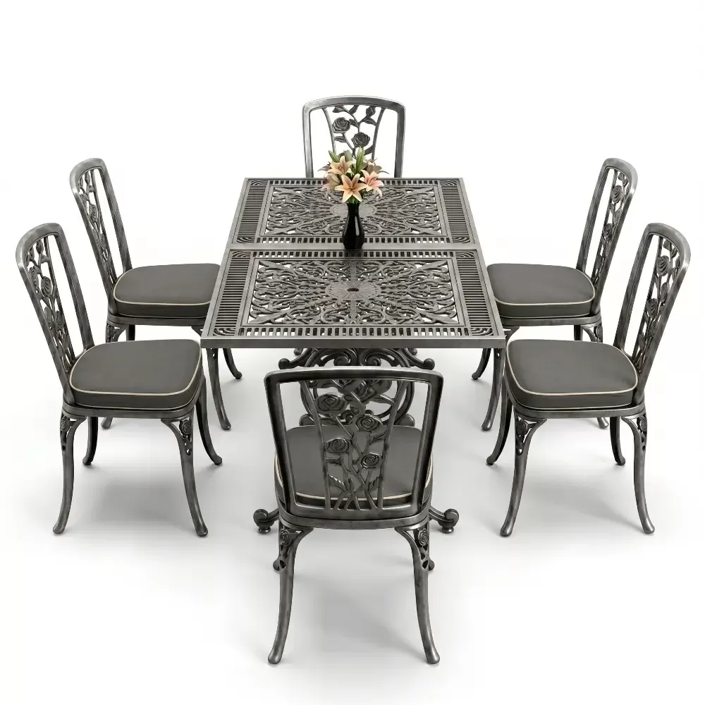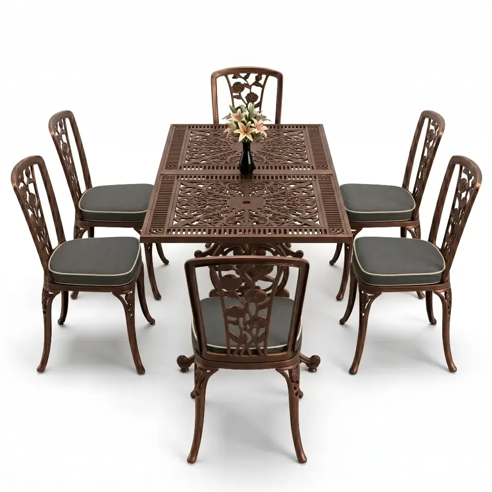 Acik hava yasam alanlarinizi birer davet alanina donusturen 86 MHS dikdortgen yemek grubu, ferforje sanatının klasik ruhunu modern aluminyum teknolojisi ile harmanliyor. Altı kisilik genis oturma kapasitesi ve ergonomik yapisi sayesinde uzun soluklu dost sohbetlerine konfor katan bu set, Akbrella uretim kalitesini her santimetresinde hissettiriyor. Aluminyumun dogal paslanmaz yapisi ve yuksek dayaniklilik ozellikleri, urunu sadece bir mobilya degil, uzun yillara meydan okuyan prestijli bir yatirim haline getiriyor.