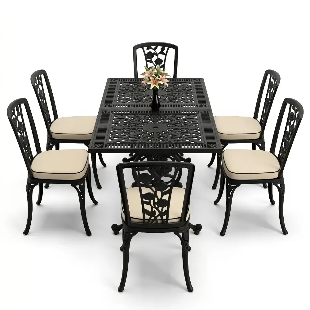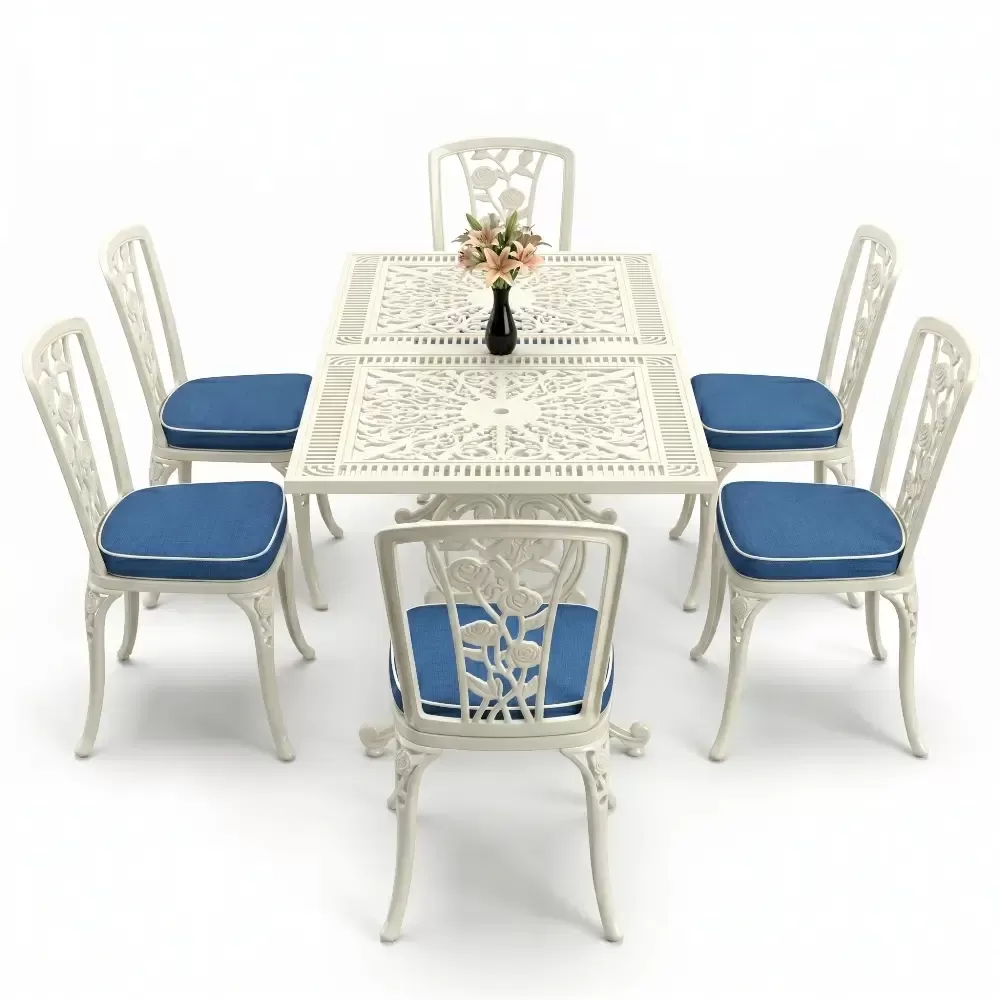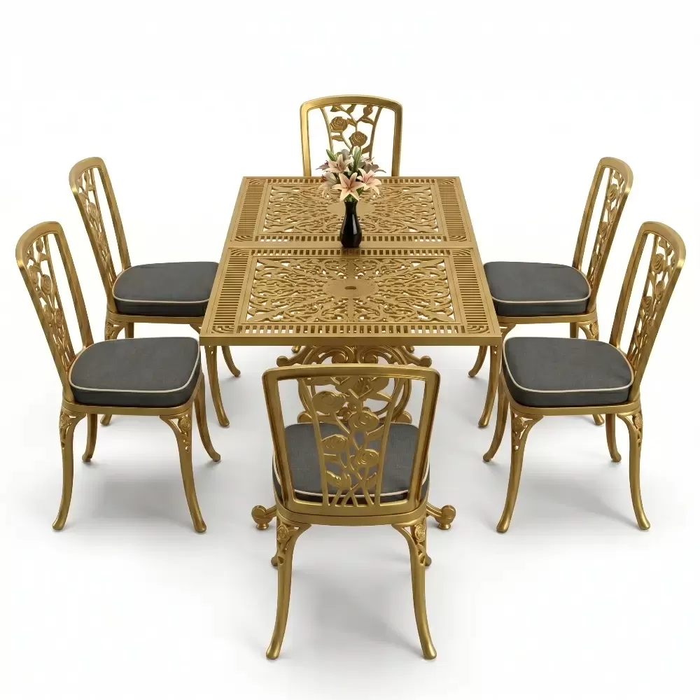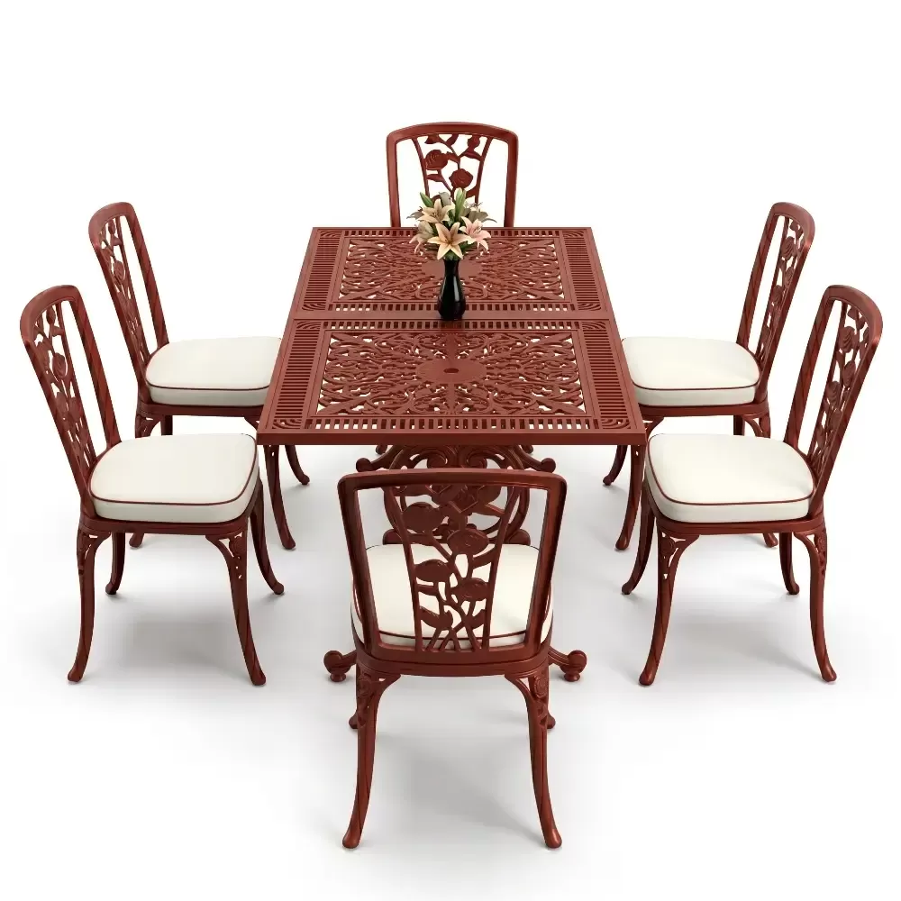 Acik hava yasam alanlarinizi birer davet alanina donusturen 86 MHS dikdortgen yemek grubu, ferforje sanatının klasik ruhunu modern aluminyum teknolojisi ile harmanliyor. Altı kisilik genis oturma kapasitesi ve ergonomik yapisi sayesinde uzun soluklu dost sohbetlerine konfor katan bu set, Akbrella uretim kalitesini her santimetresinde hissettiriyor. Aluminyumun dogal paslanmaz yapisi ve yuksek dayaniklilik ozellikleri, urunu sadece bir mobilya degil, uzun yillara meydan okuyan prestijli bir yatirim haline getiriyor.