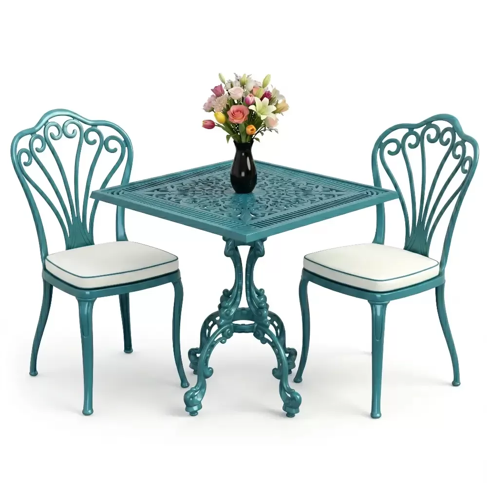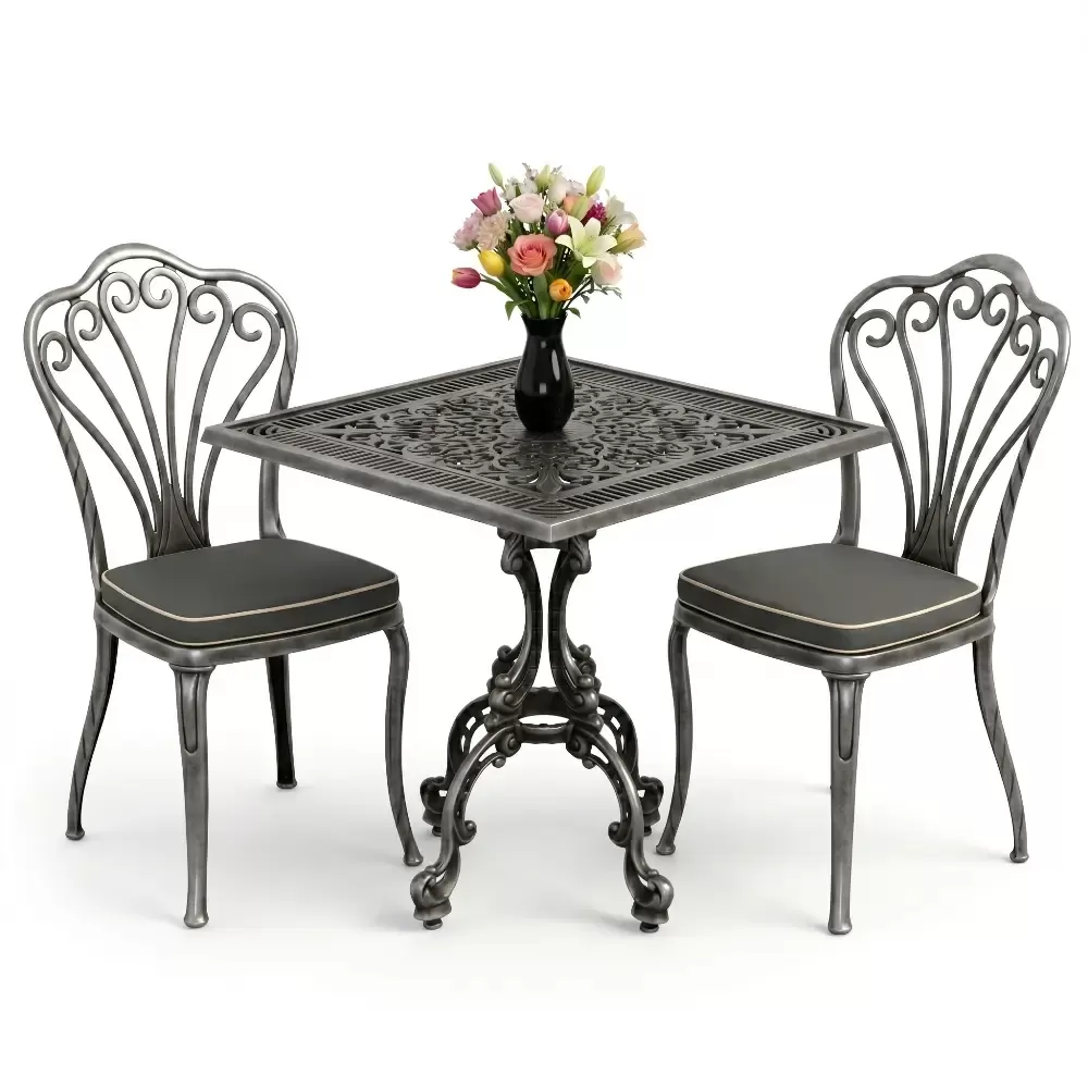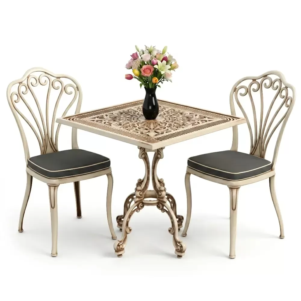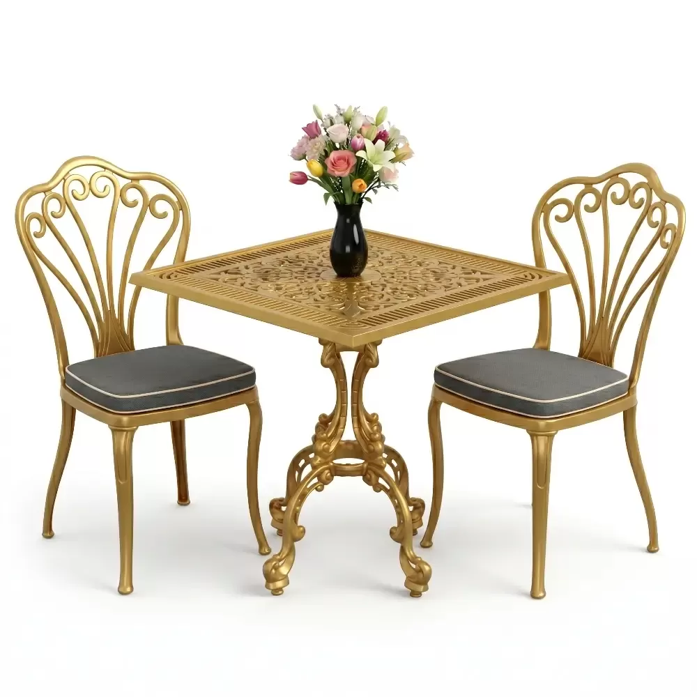 Yüksek kaliteli alüminyum döküm malzemeden üretilen bu takım, doğa şartlarına karşı tam direnç gösterecek şekilde tasarlanmıştır. Demir mobilyaların aksine paslanma ve korozyon riski barındırmaz. Elektrostatik fırın boya teknolojisi ile desteklenen yüzey dokusu; UV ışınlarına, aşırı sıcaklara ve nemli ortamlara karşı üstün koruma sağlayarak ürünün ilk günkü zarafetini uzun yıllar boyunca korumasına yardımcı olur.