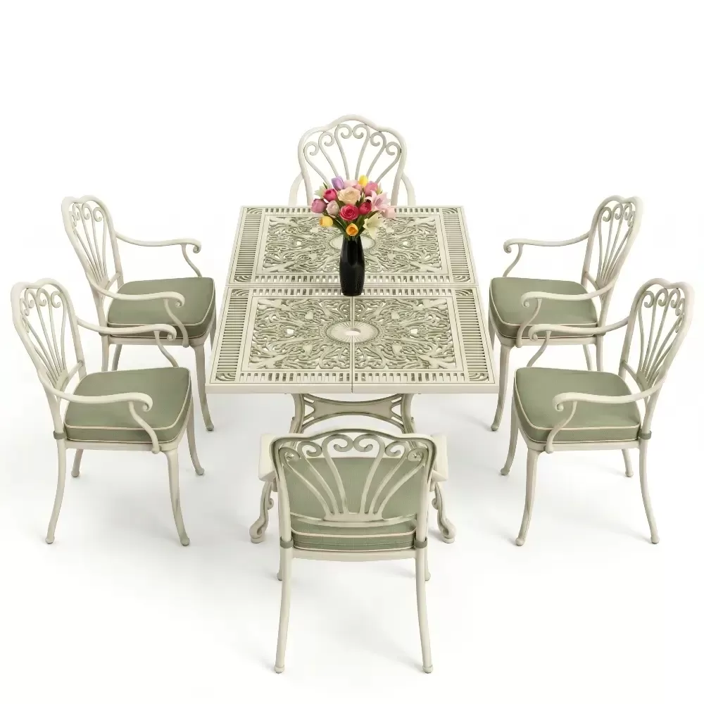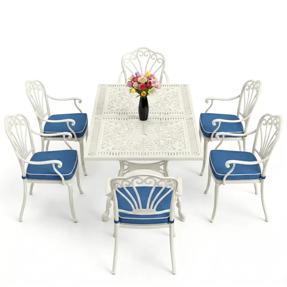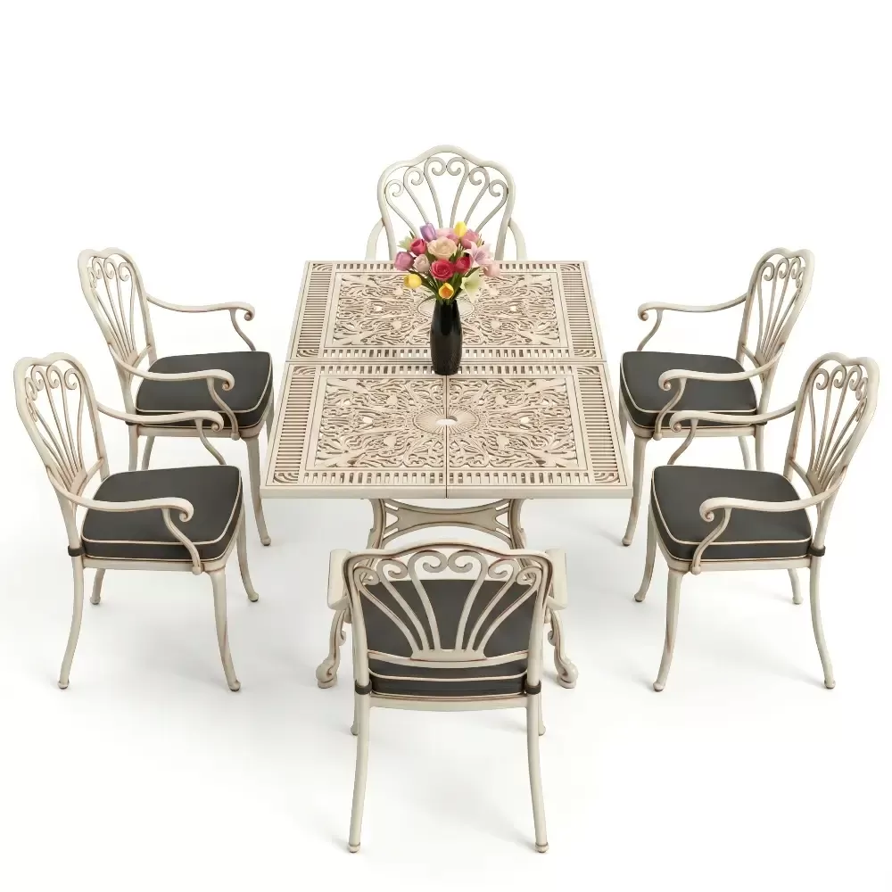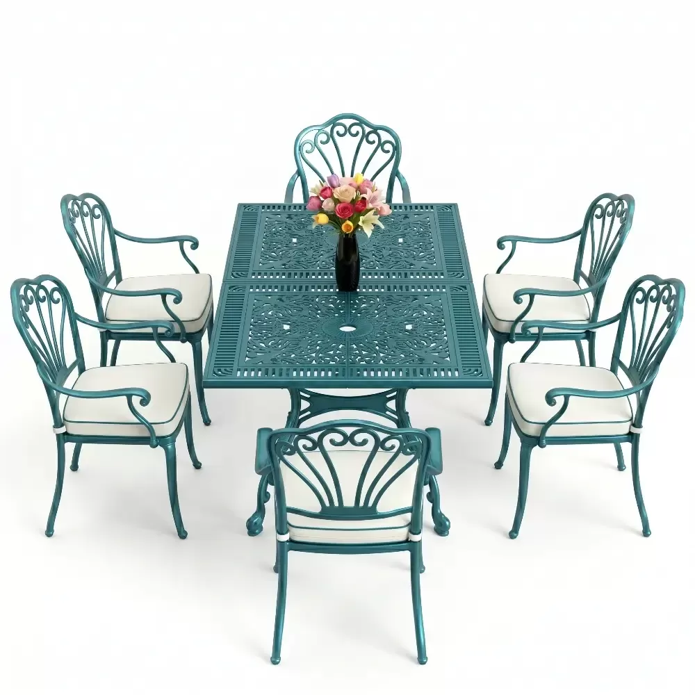 Dikdörtgen Masa E:70 x D:140 x Y:72 cm 6 Kişilik kollu tavuskuşu motif alüminyum döküm masa ve sandalye takımı (Mindersiz Fiyatı)