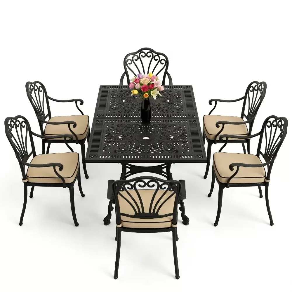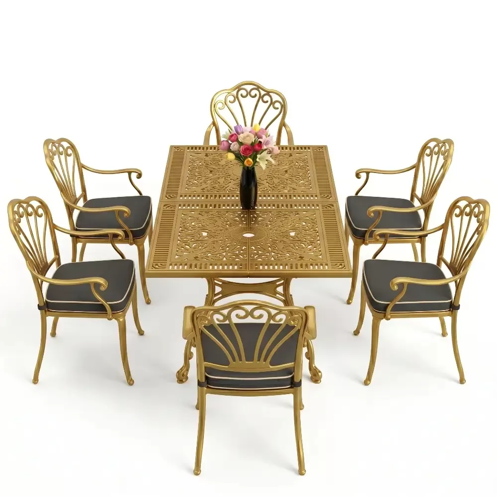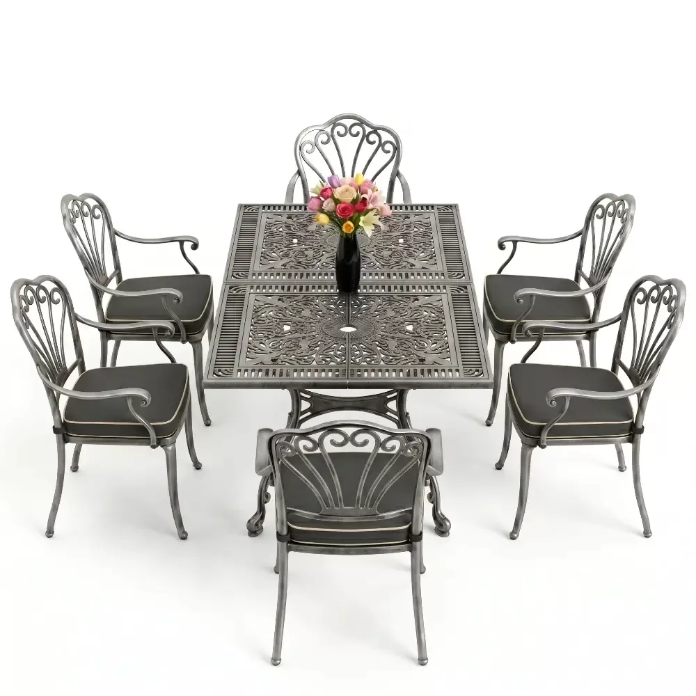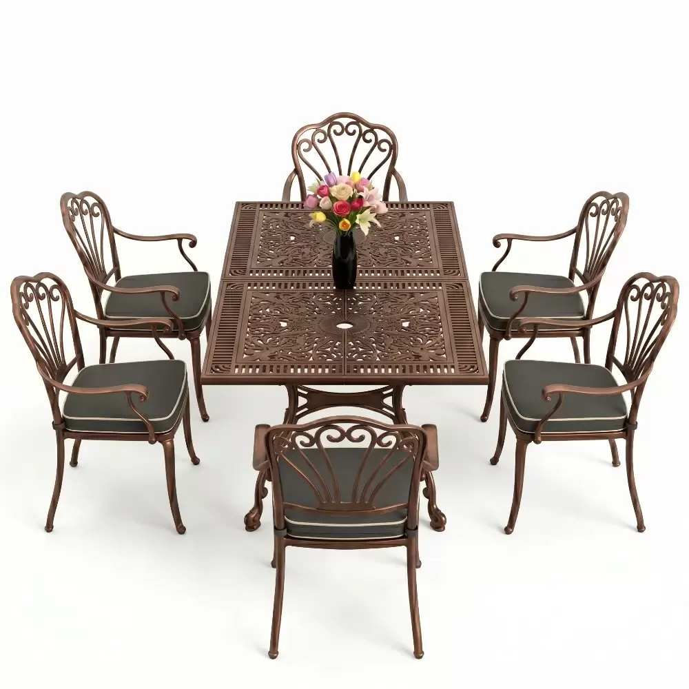 Dikdörtgen Masa E:70 x D:140 x Y:72 cm 6 Kişilik kollu tavuskuşu motif alüminyum döküm masa ve sandalye takımı (Mindersiz Fiyatı)