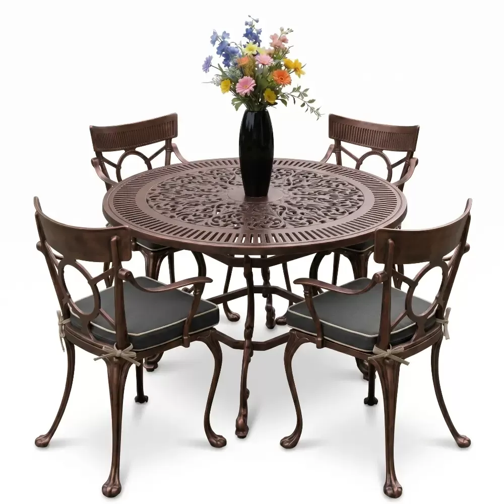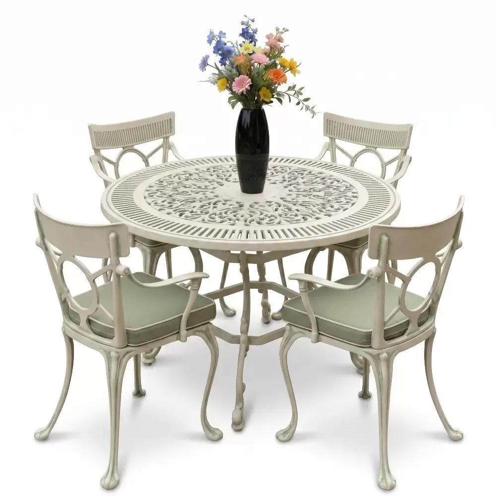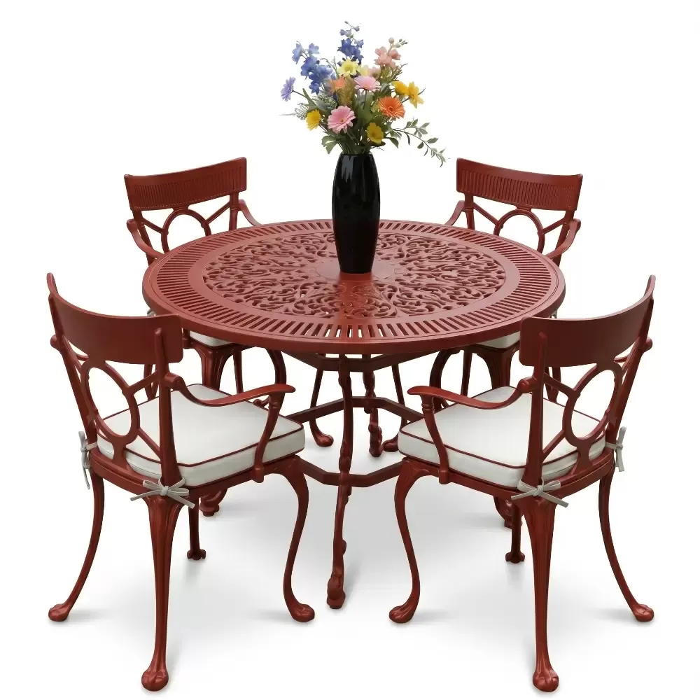 Açık havada geçirilen anları daha değerli kılmak için geliştirilen 54 MHS alüminyum döküm masa takımı, ferforje estetiğini yuvarlak formun birleştirici gücüyle harmanlıyor. Akbrella uzmanlığıyla üretilen bu dört kişilik özel koleksiyon, sadece bir mobilya grubu değil, mekanınıza prestij katan uzun ömürlü bir mimari öğedir. Tasarımındaki akıcı hatlar ve döküm sanatının ince detayları, bahçe ve balkonlarınızda sofistike bir atmosfer oluşturmak üzere titizlikle şekillendirilmiştir.
