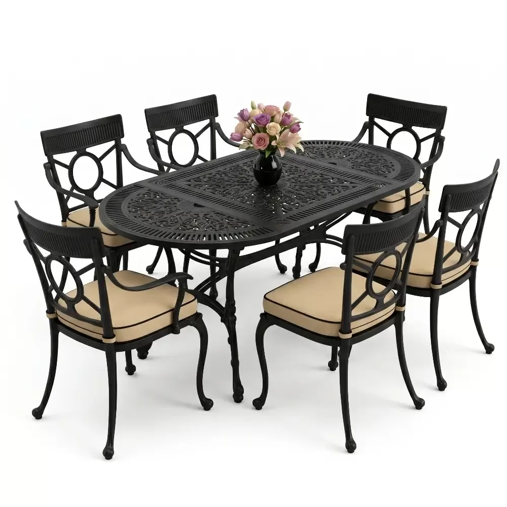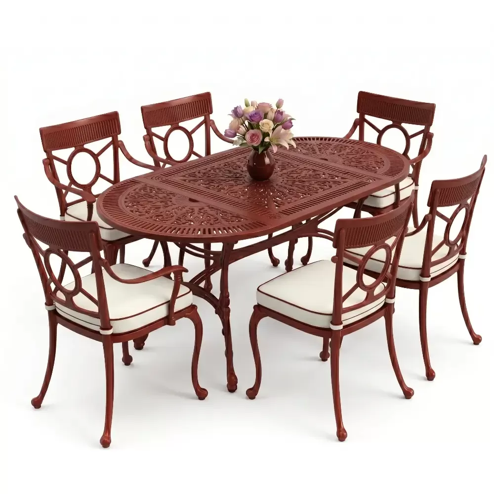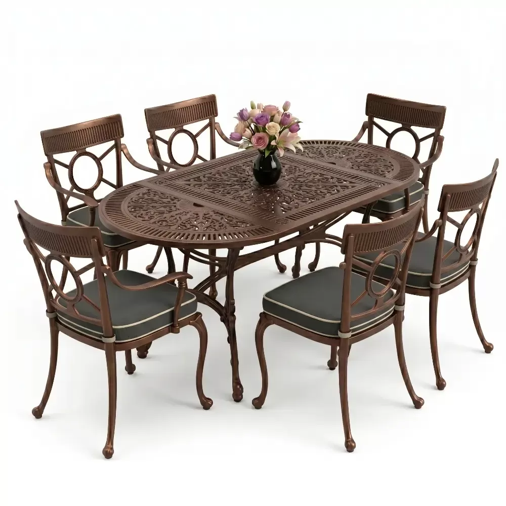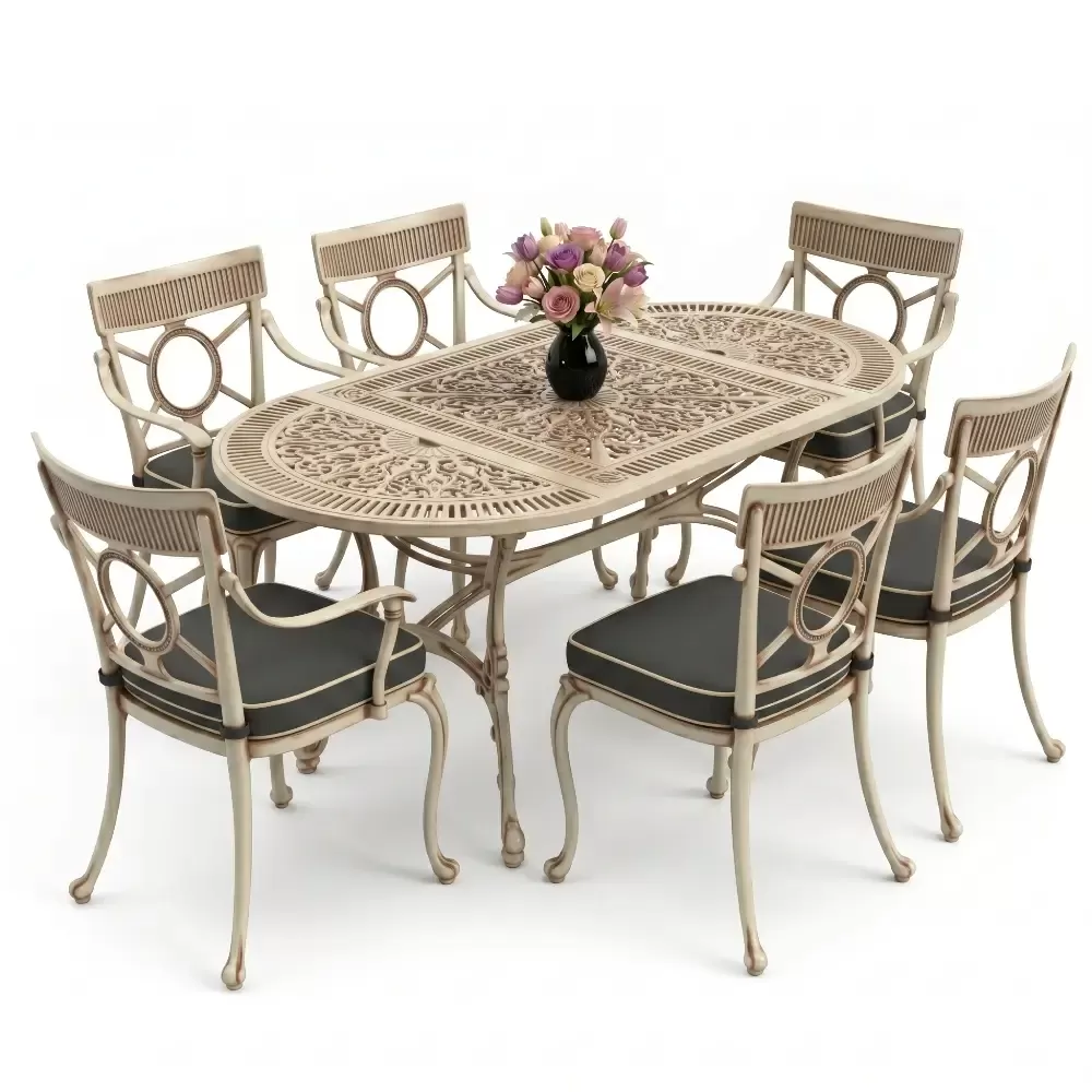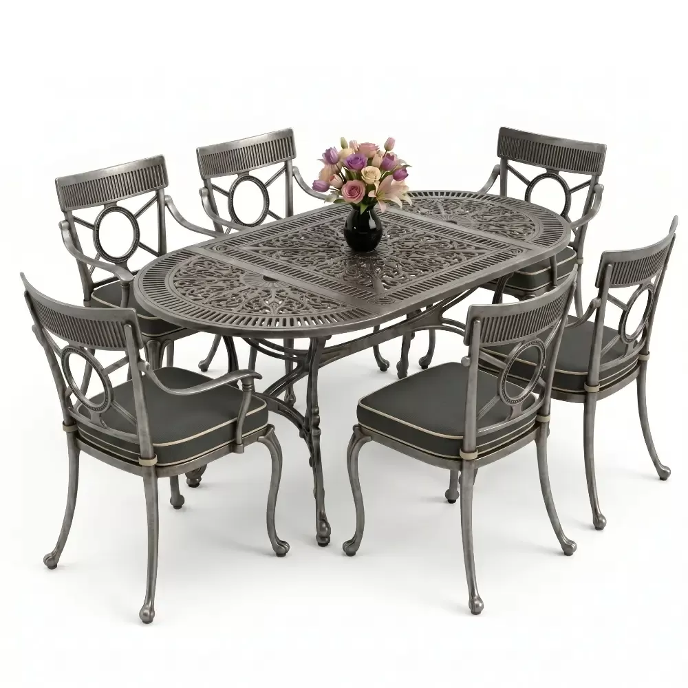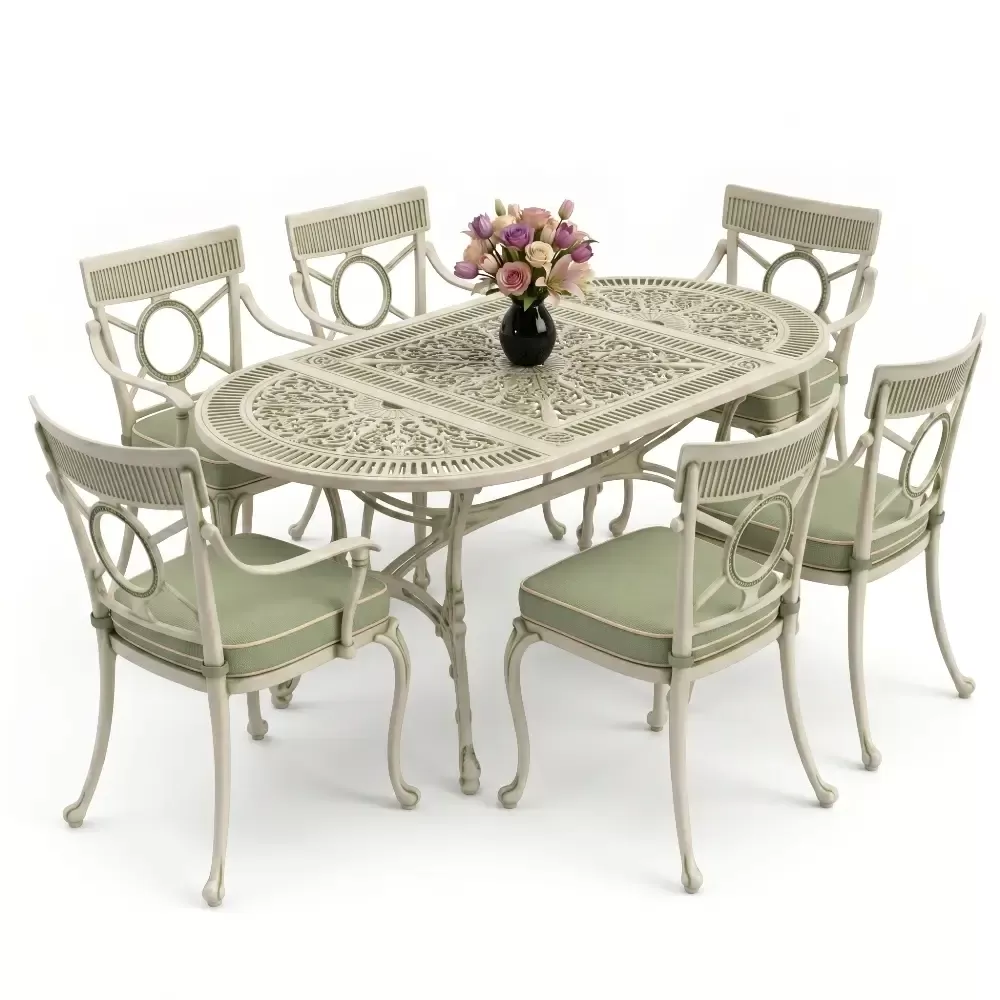Dis mekan yasam alanlarinizda klasik ferforje ruhunu modern bir akiskanlikla bulusturan 89 MHS yemek grubu, elips formu sayesinde mekaninizda yumusak ve davetkar bir atmosfer olusturur. Keskin koselerin olmadigi bu ozel tasarim, altı kisilik kapasitesiyle Akbrella kalitesini en ergonomik haliyle sunuyor. Aluminyum dokumun sagladigi paslanmazlik ve yuksek dayaniklilik ozellikleri, urunu sadece bir mobilya degil, yillara meydan okuyan prestijli bir yatirim haline getiriyor.