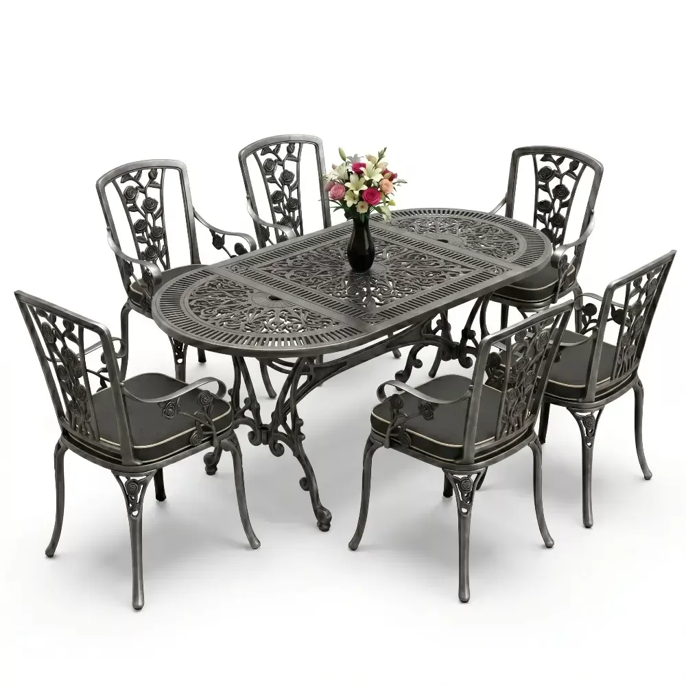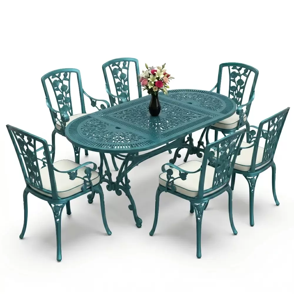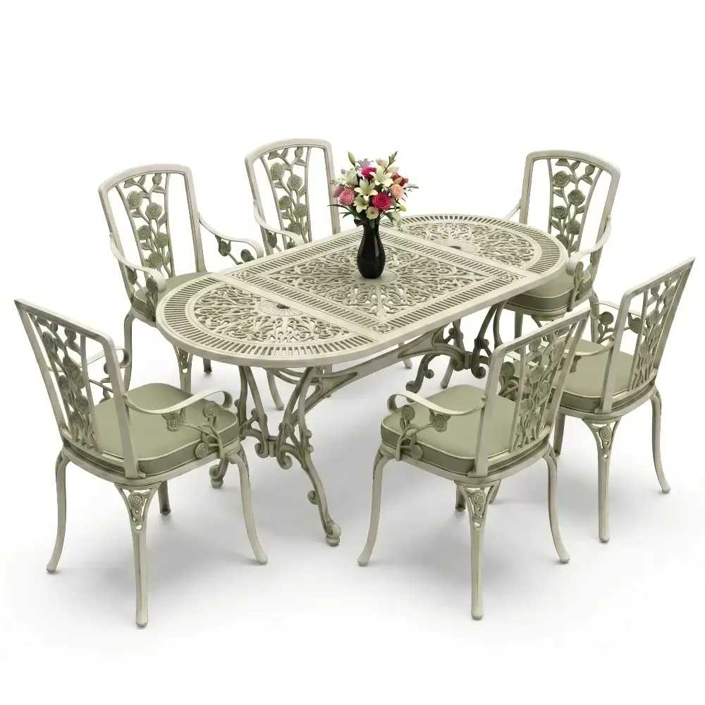 Dis mekan yasam alanlarinizda klasik ferforje ruhunu oval hatlarin modern dokunusuyla bulusturan 90 MHS yemek grubu, mekaninizda yumusak ve davetkar bir atmosfer olusturur. Elips formu sayesinde keskin koseleri ortadan kaldiran bu ozel tasarim, altı kisilik kapasitesiyle Akbrella kalitesini en konforlu haliyle sunuyor. Aluminyum dokumun sagladigi paslanmazlik ve yuksek dayaniklilik ozellikleri, urunu sadece bir mobilya degil, yillara meydan okuyan prestijli bir yatirim haline getiriyor.