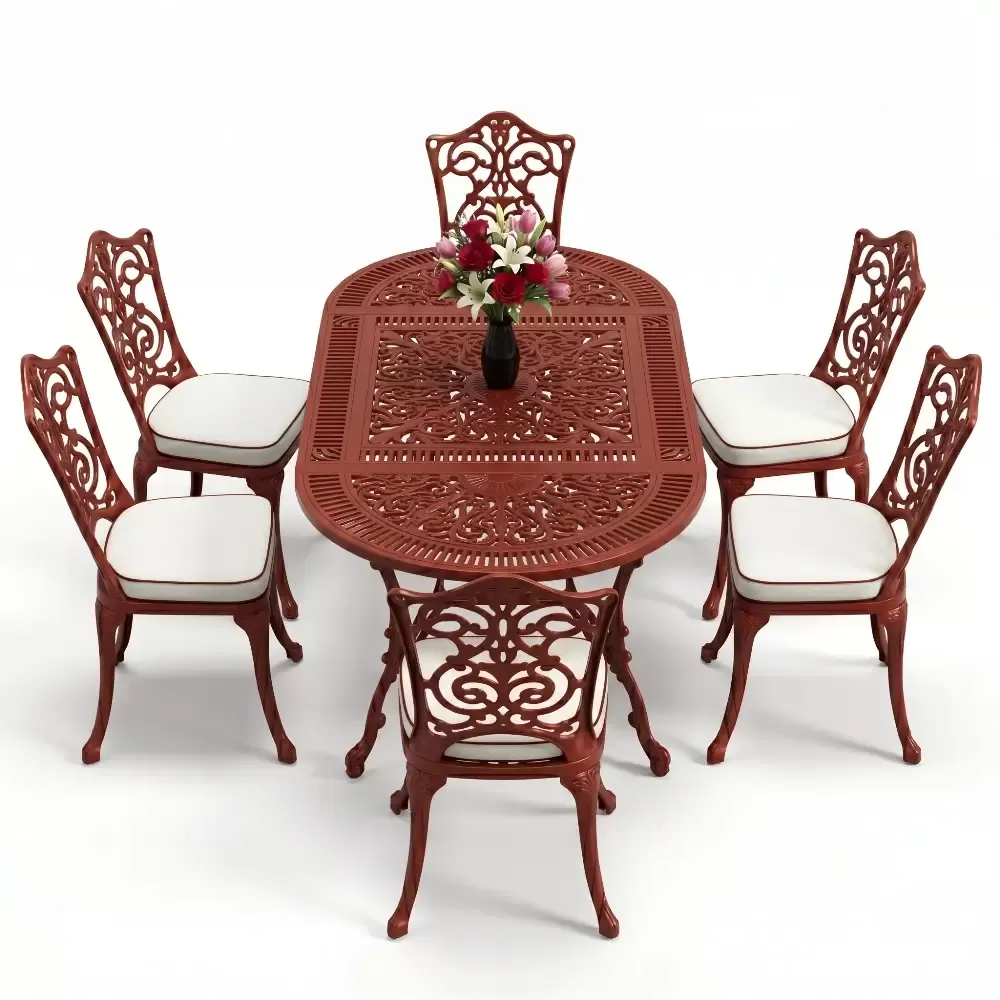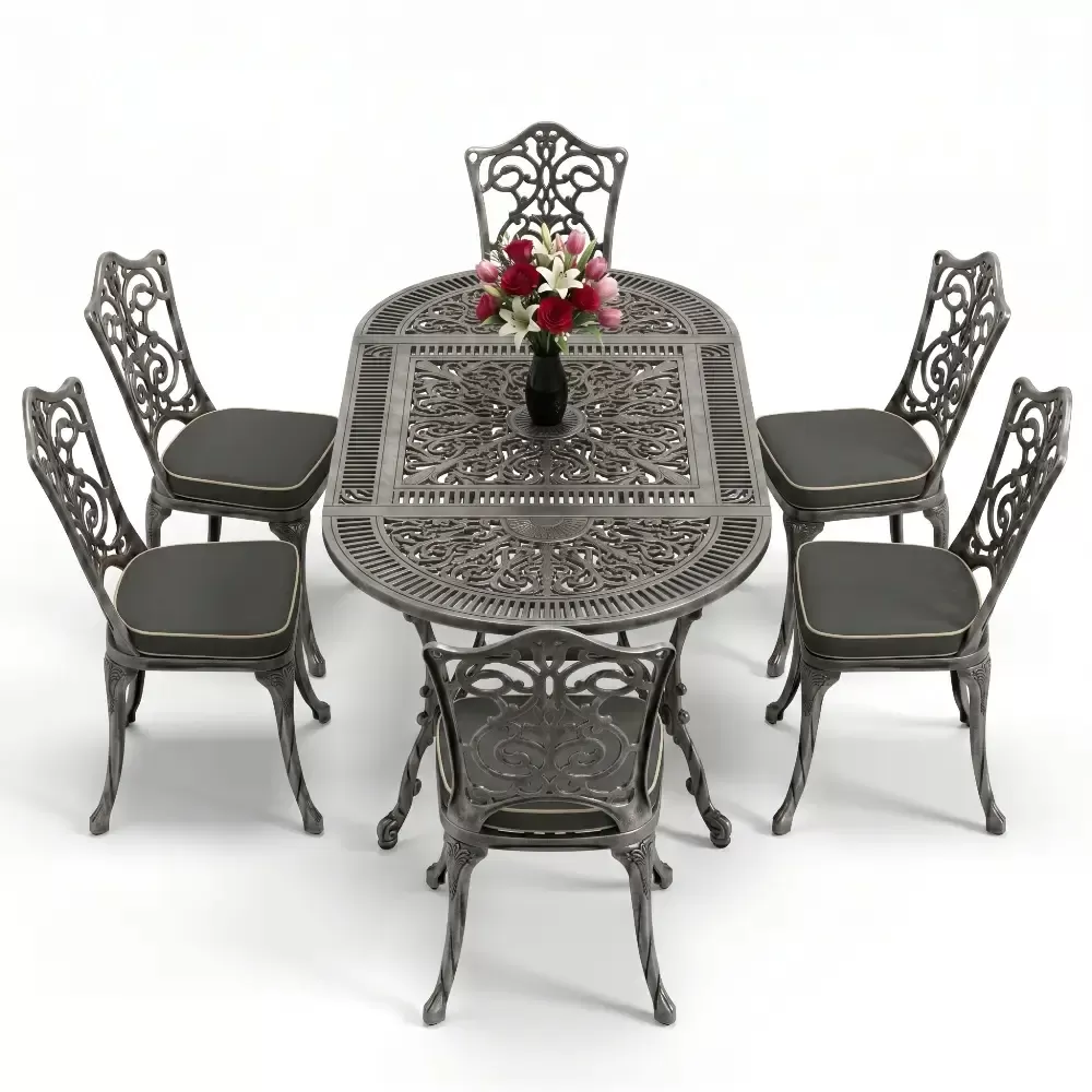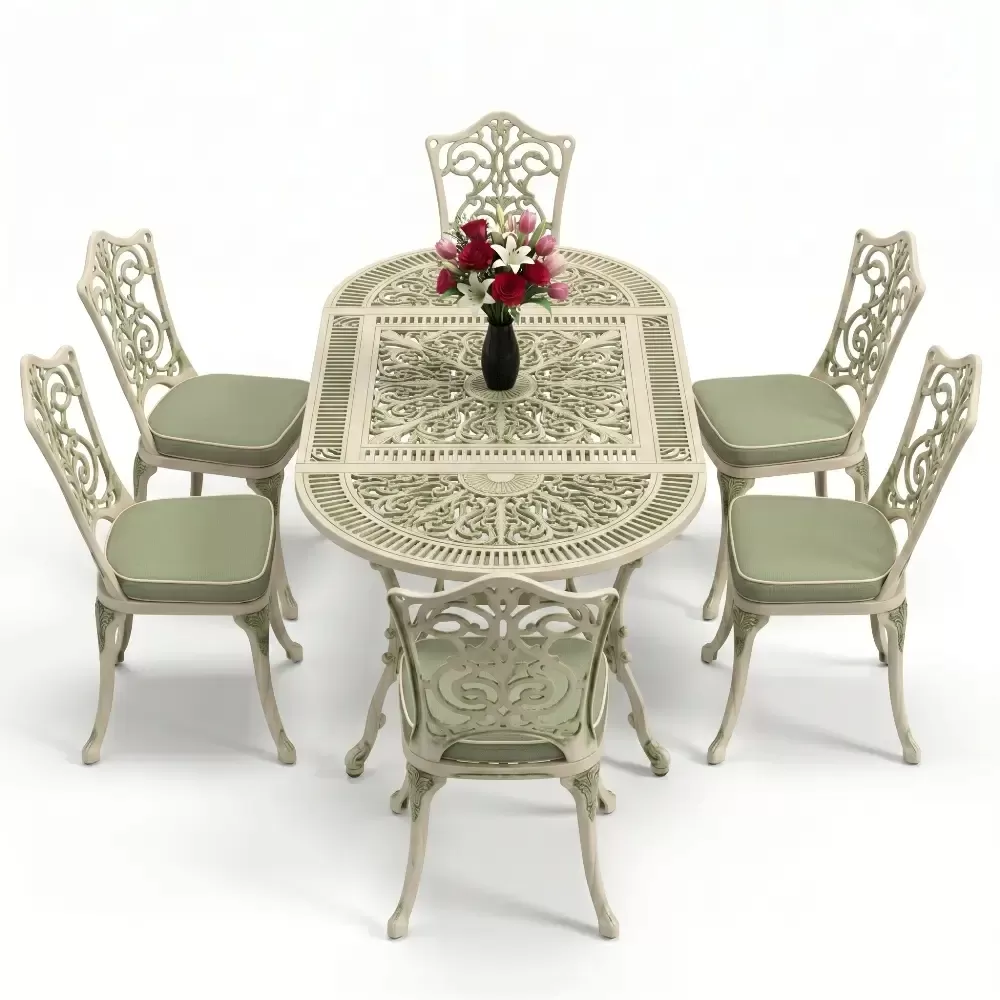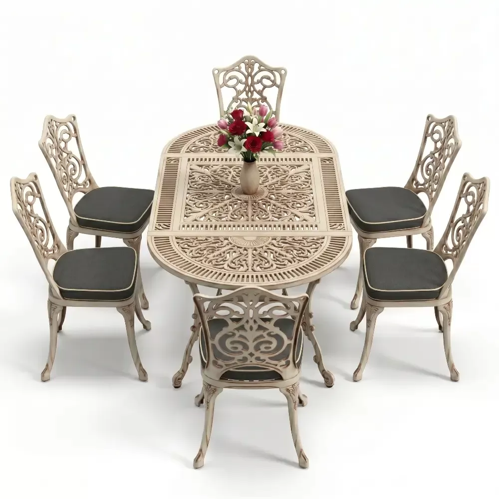 Dis mekan yasam alanlarinizda klasik ferforje ruhunu oval hatlarin modern dokunusuyla bulusturan 91 MHS yemek grubu, mekaninizda yumusak ve davetkar bir atmosfer olusturur. Elips formu sayesinde keskin koseleri ortadan kaldiran bu ozel tasarim, altı kisilik kapasitesiyle Akbrella kalitesini en ergonomik haliyle sunuyor. Aluminyum dokumun sagladigi paslanmazlik ve yuksek dayaniklilik ozellikleri, urunu sadece bir mobilya degil, yillara meydan okuyan prestijli bir yatirim haline getiriyor.