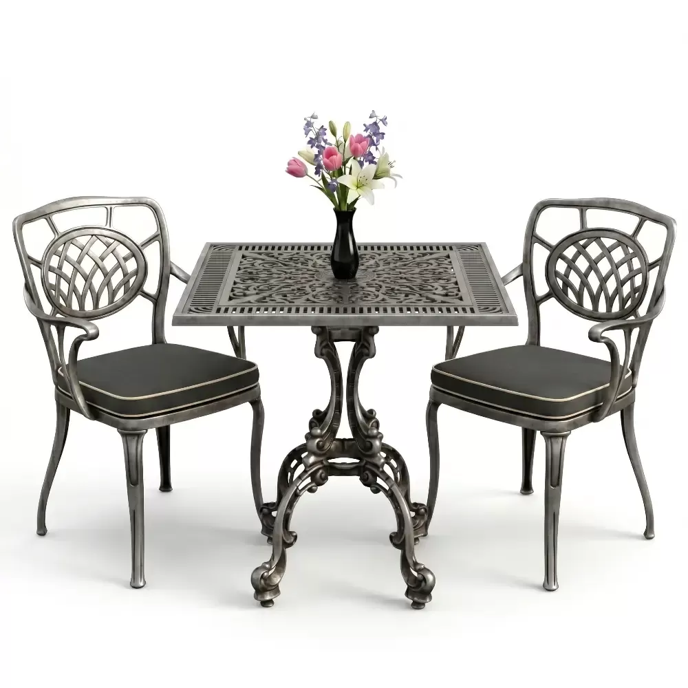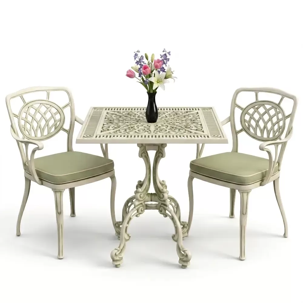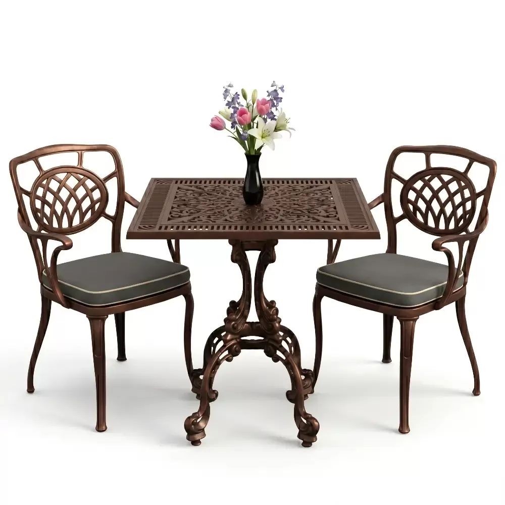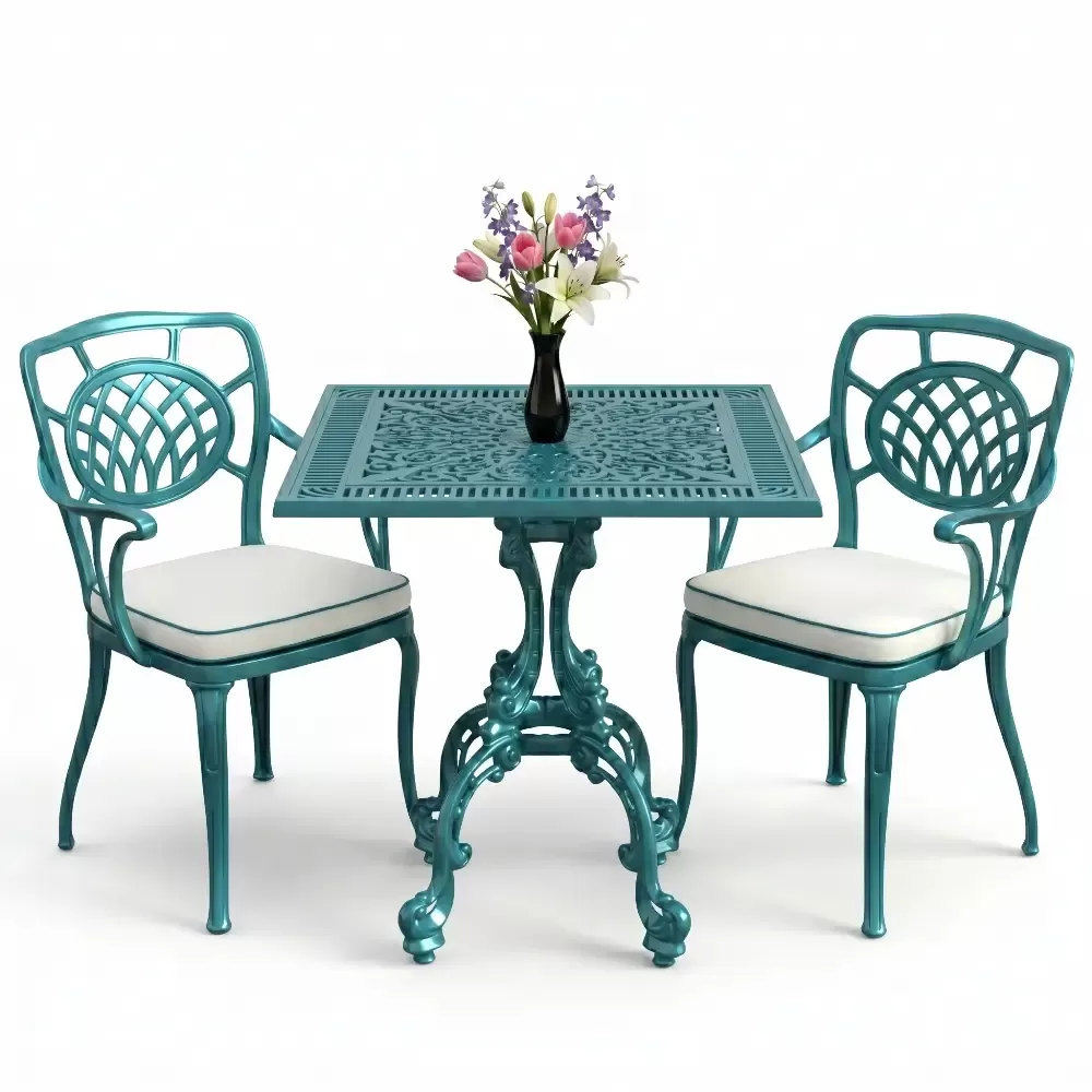 Yüksek kaliteli alüminyum döküm malzemeden üretilen bu takım, doğa şartlarına karşı tam direnç gösterecek şekilde tasarlanmıştır. Demir mobilyaların aksine paslanma ve korozyon riski barındırmaz. Elektrostatik fırın boya teknolojisi ile desteklenen yüzey dokusu; UV ışınlarına, aşırı sıcaklara ve nemli ortamlara karşı üstün koruma sağlayarak ürünün ilk günkü zarafetini uzun yıllar boyunca korumasına yardımcı olur.