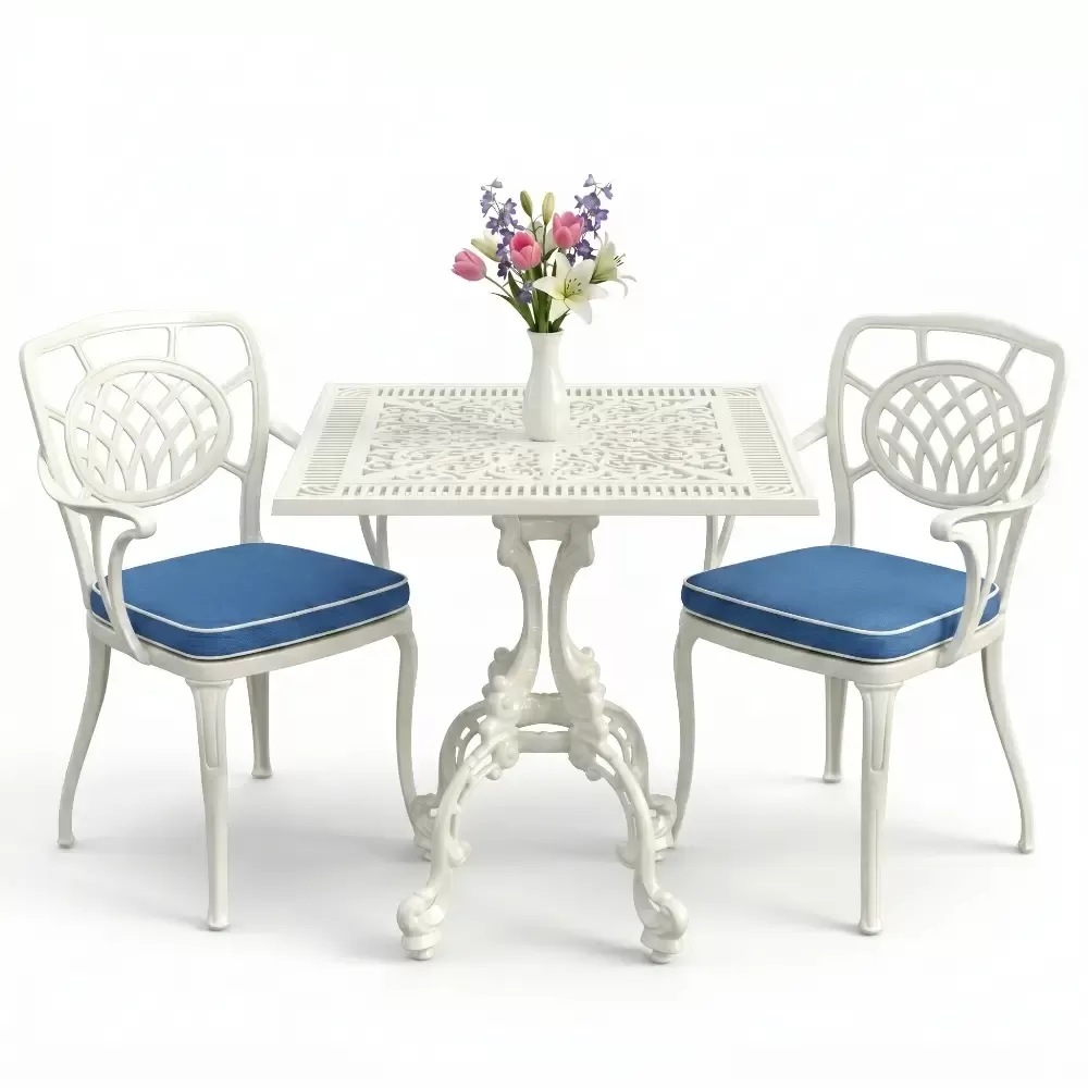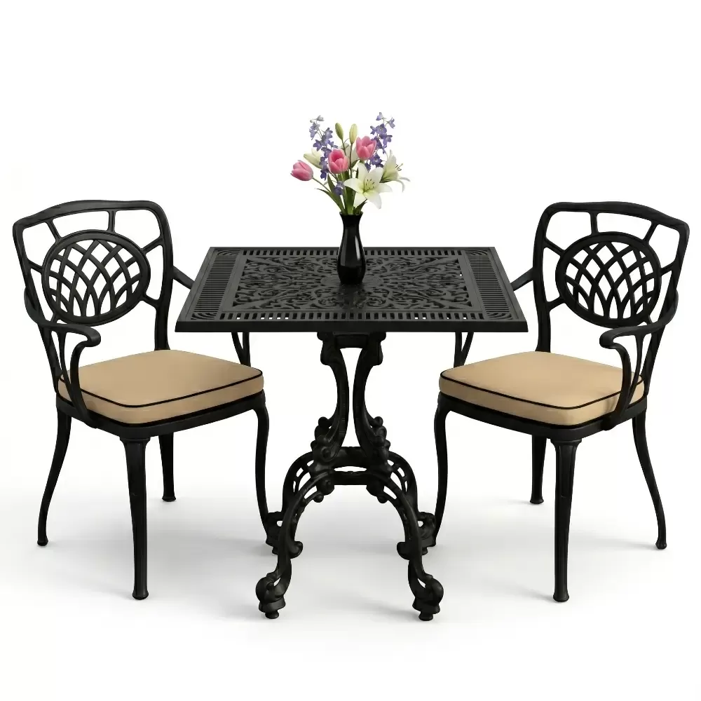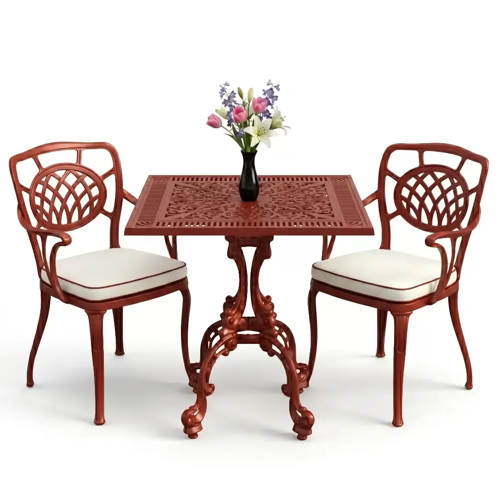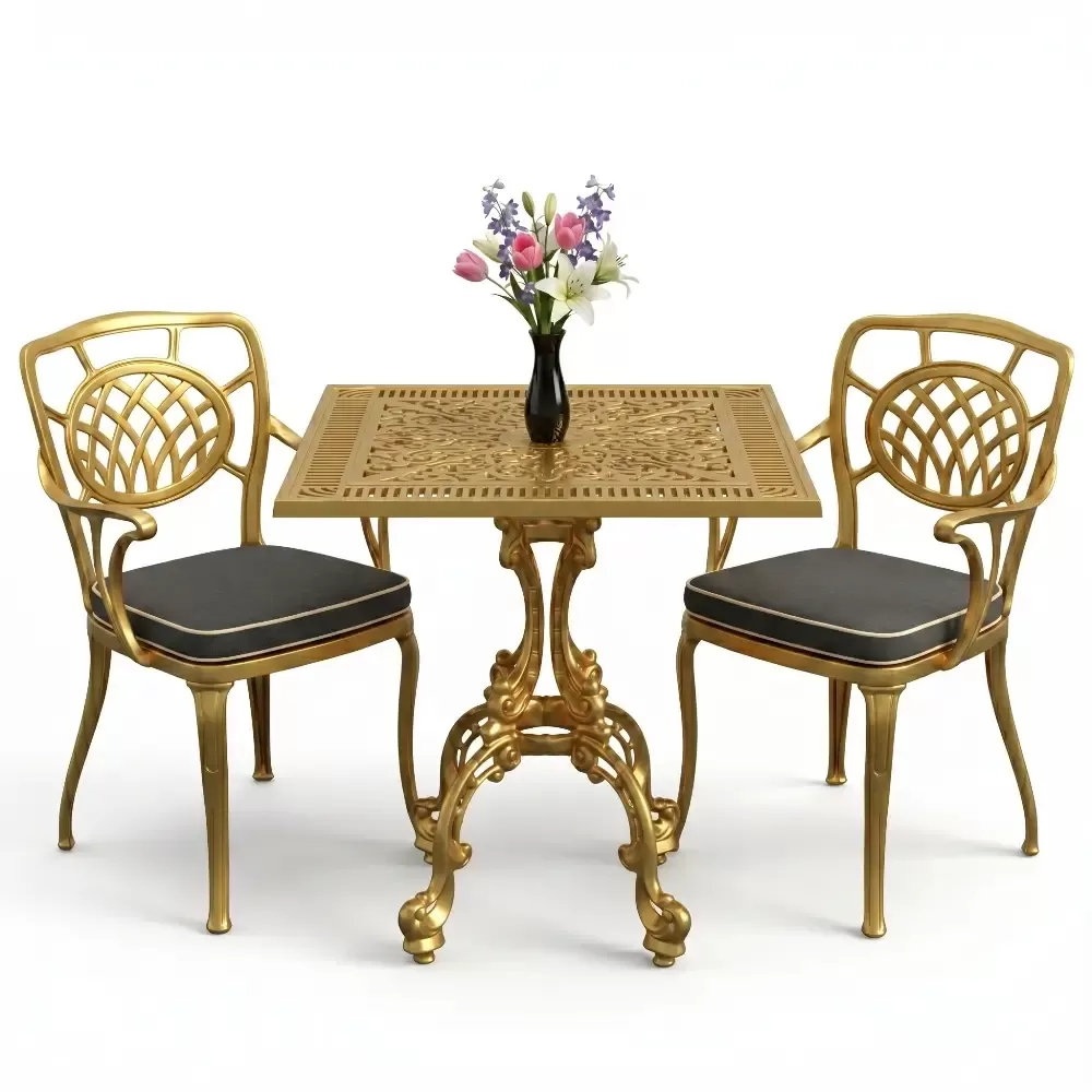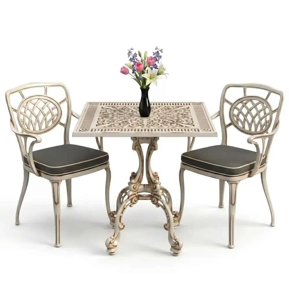 Yüksek kaliteli alüminyum döküm malzemeden üretilen bu takım, doğa şartlarına karşı tam direnç gösterecek şekilde tasarlanmıştır. Demir mobilyaların aksine paslanma ve korozyon riski barındırmaz. Elektrostatik fırın boya teknolojisi ile desteklenen yüzey dokusu; UV ışınlarına, aşırı sıcaklara ve nemli ortamlara karşı üstün koruma sağlayarak ürünün ilk günkü zarafetini uzun yıllar boyunca korumasına yardımcı olur.