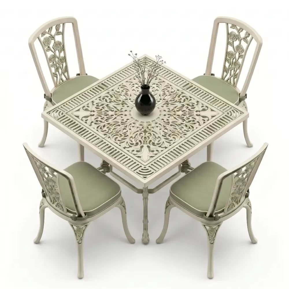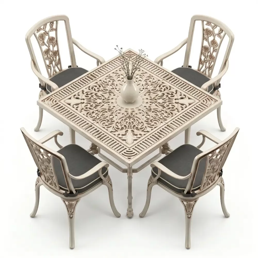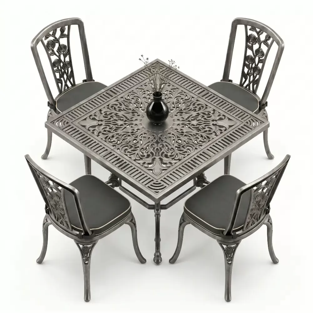 Dış mekan dekorasyonunda hem konforu hem de sarsılmaz bir estetiği bir arada arayanlar için geliştirilen 57 MHS alüminyum döküm masa takımı, ferforje sanatının asaletini modern üretim disipliniyle buluşturuyor. Akbrella imzasını taşıyan bu özel dört kişilik set, 100 cm genişliğindeki kare formuyla kullanıcılarına ferah bir yemek ve sosyal etkileşim alanı vaat eder. Bahçenizden verandanıza kadar her noktada fark yaratan bu tasarım, döküm metalin gücünü zarafetle harmanlayarak mekanınızın değerini artırır.