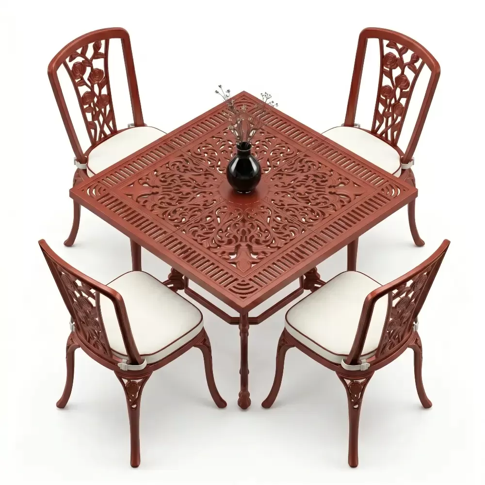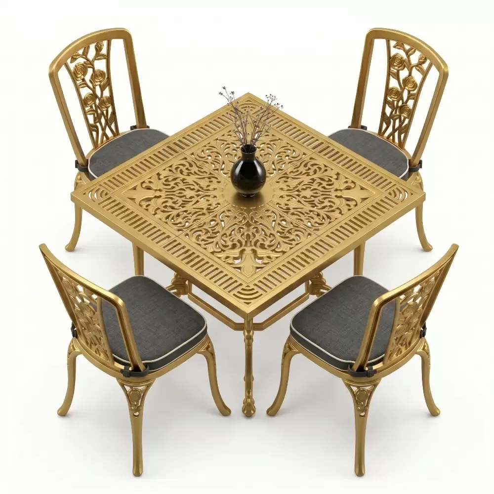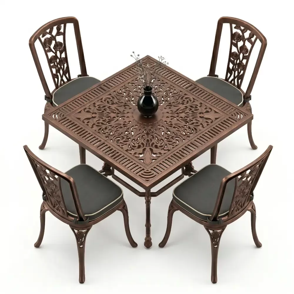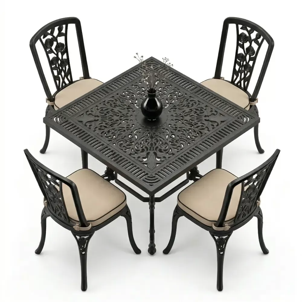 Dış mekan dekorasyonunda hem konforu hem de sarsılmaz bir estetiği bir arada arayanlar için geliştirilen 57 MHS alüminyum döküm masa takımı, ferforje sanatının asaletini modern üretim disipliniyle buluşturuyor. Akbrella imzasını taşıyan bu özel dört kişilik set, 100 cm genişliğindeki kare formuyla kullanıcılarına ferah bir yemek ve sosyal etkileşim alanı vaat eder. Bahçenizden verandanıza kadar her noktada fark yaratan bu tasarım, döküm metalin gücünü zarafetle harmanlayarak mekanınızın değerini artırır.