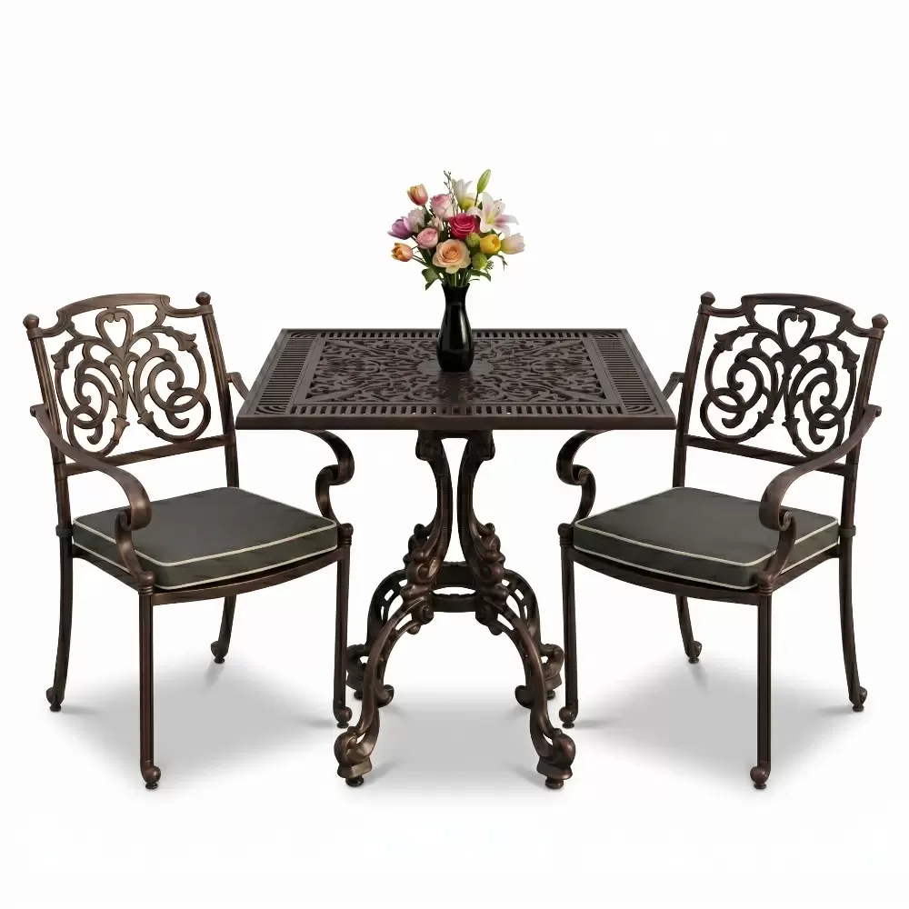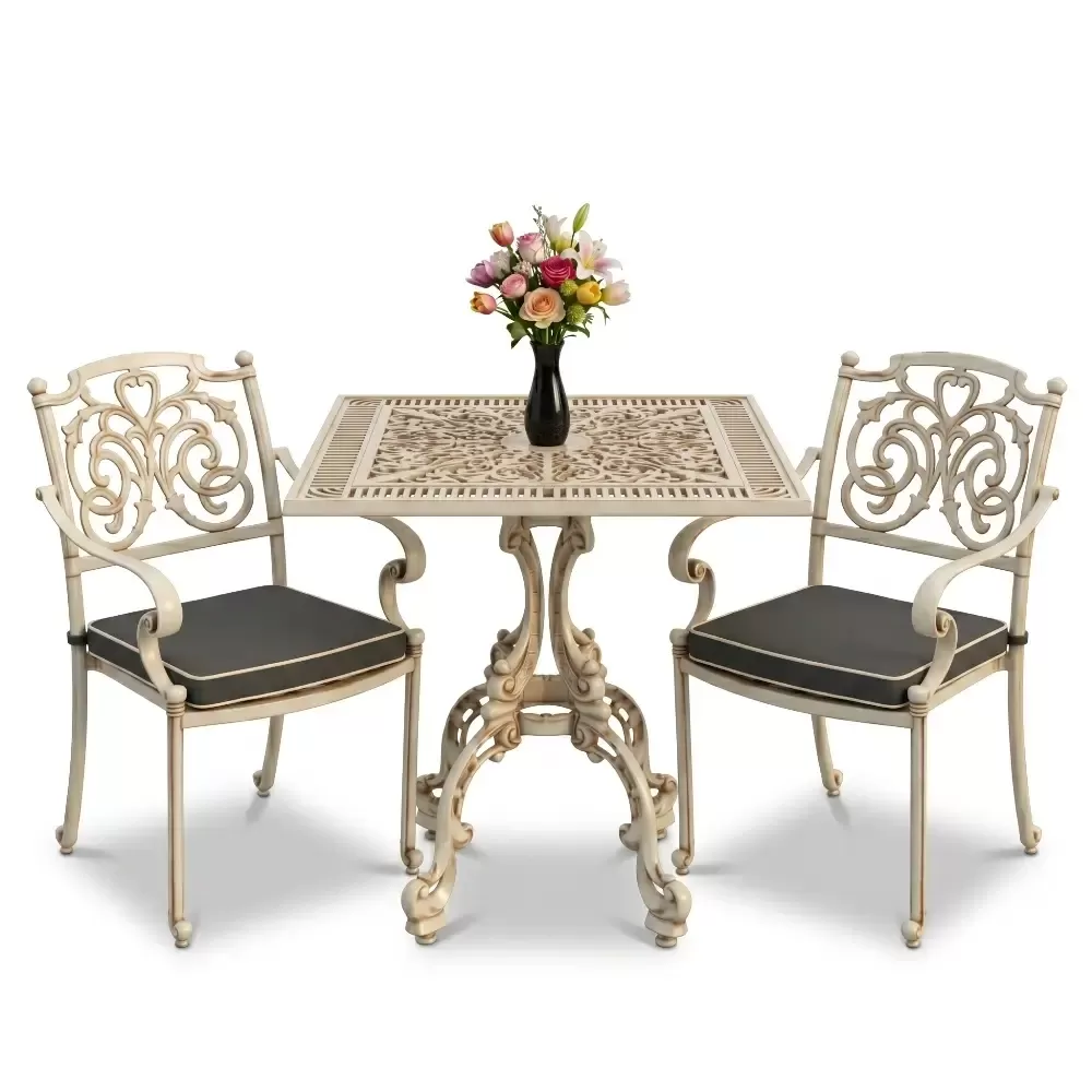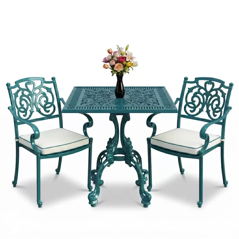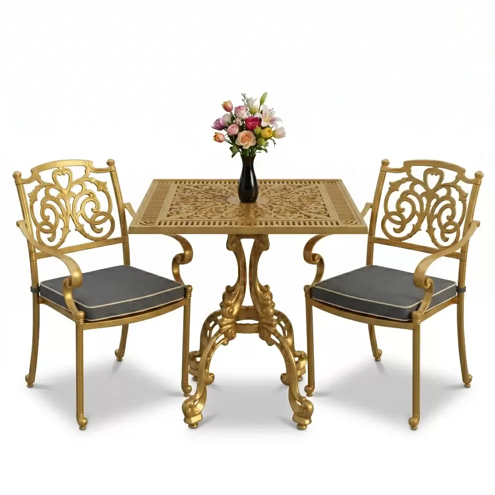 Yüksek kaliteli alüminyum döküm malzemeden üretilen bu takım, doğa şartlarına karşı tam direnç gösterecek şekilde tasarlanmıştır. Demir mobilyaların aksine paslanma ve korozyon riski barındırmaz. Elektrostatik fırın boya teknolojisi ile desteklenen yüzey dokusu; UV ışınlarına, aşırı sıcaklara ve nemli ortamlara karşı üstün koruma sağlayarak ürünün ilk günkü zarafetini uzun yıllar boyunca korumasına yardımcı olur.
