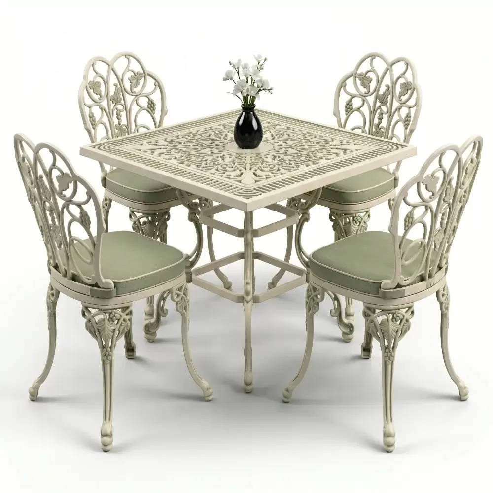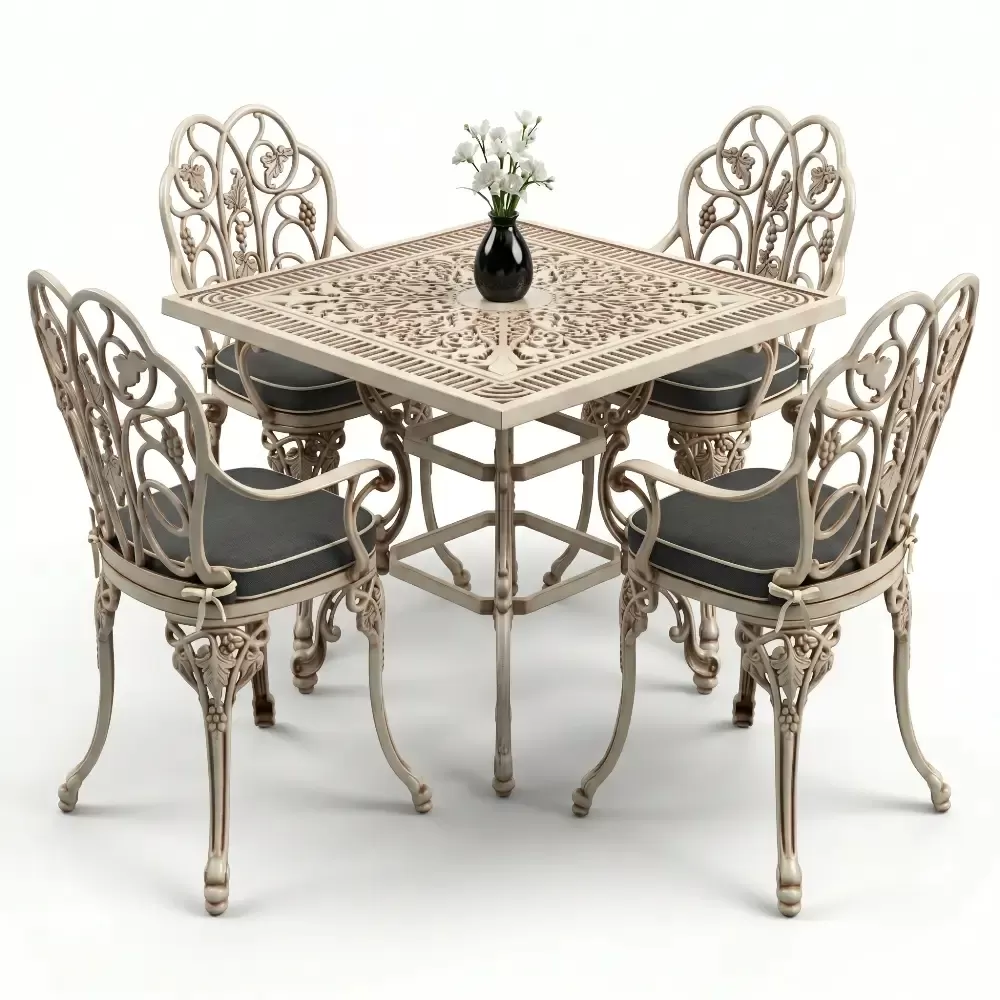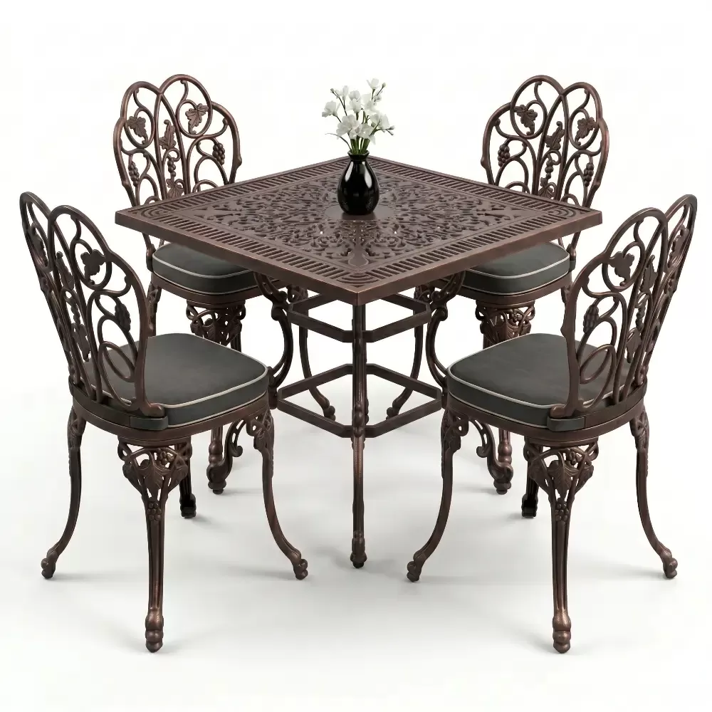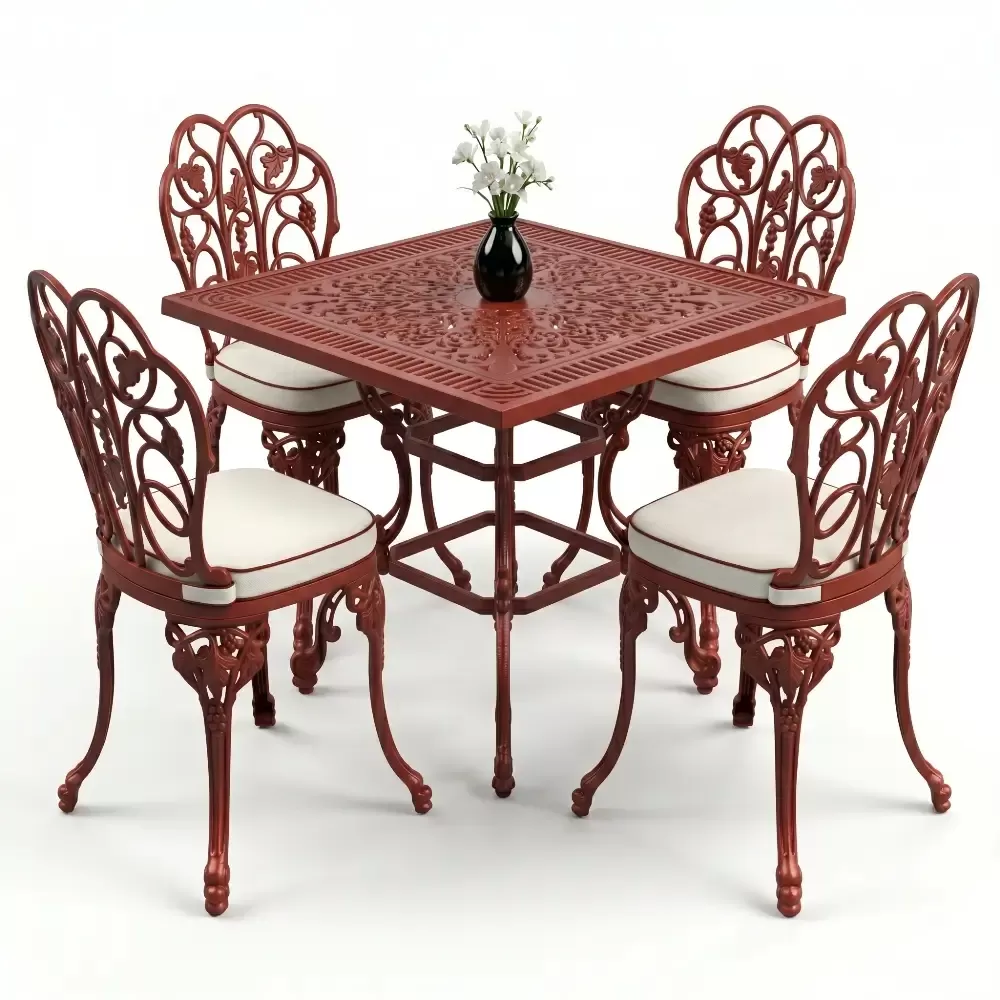 Açık havada geçirilen vakitleri daha prestijli ve konforlu bir seviyeye taşıyan 58 MHS alüminyum döküm masa takımı, ferforje sanatının asil hatlarını kare formun dengeleyici gücüyle buluşturuyor. Akbrella uzmanlığıyla üretilen bu dört kişilik özel koleksiyon, geniş 100 cm yüzey alanı sayesinde hem ferah bir yemek ortamı sunar hem de mekanınıza mimari bir değer katar. Alüminyumun hafifliği ile döküm teknolojisinin sarsılmaz sağlamlığı, bu ürünü nesiller boyu kullanılacak bir dış mekan mirası haline getiriyor.