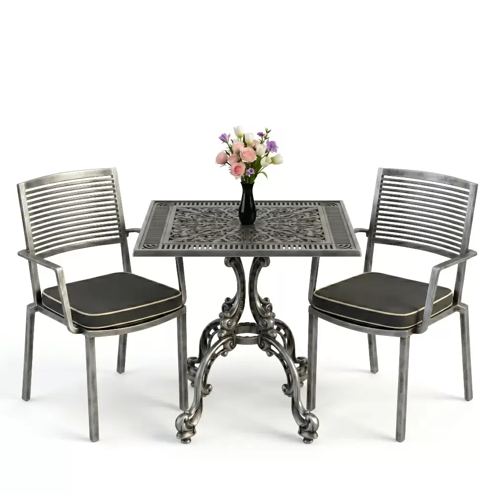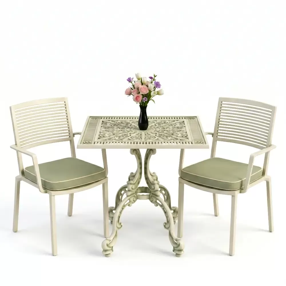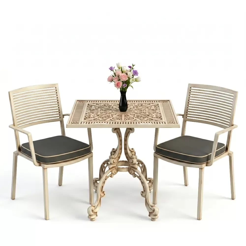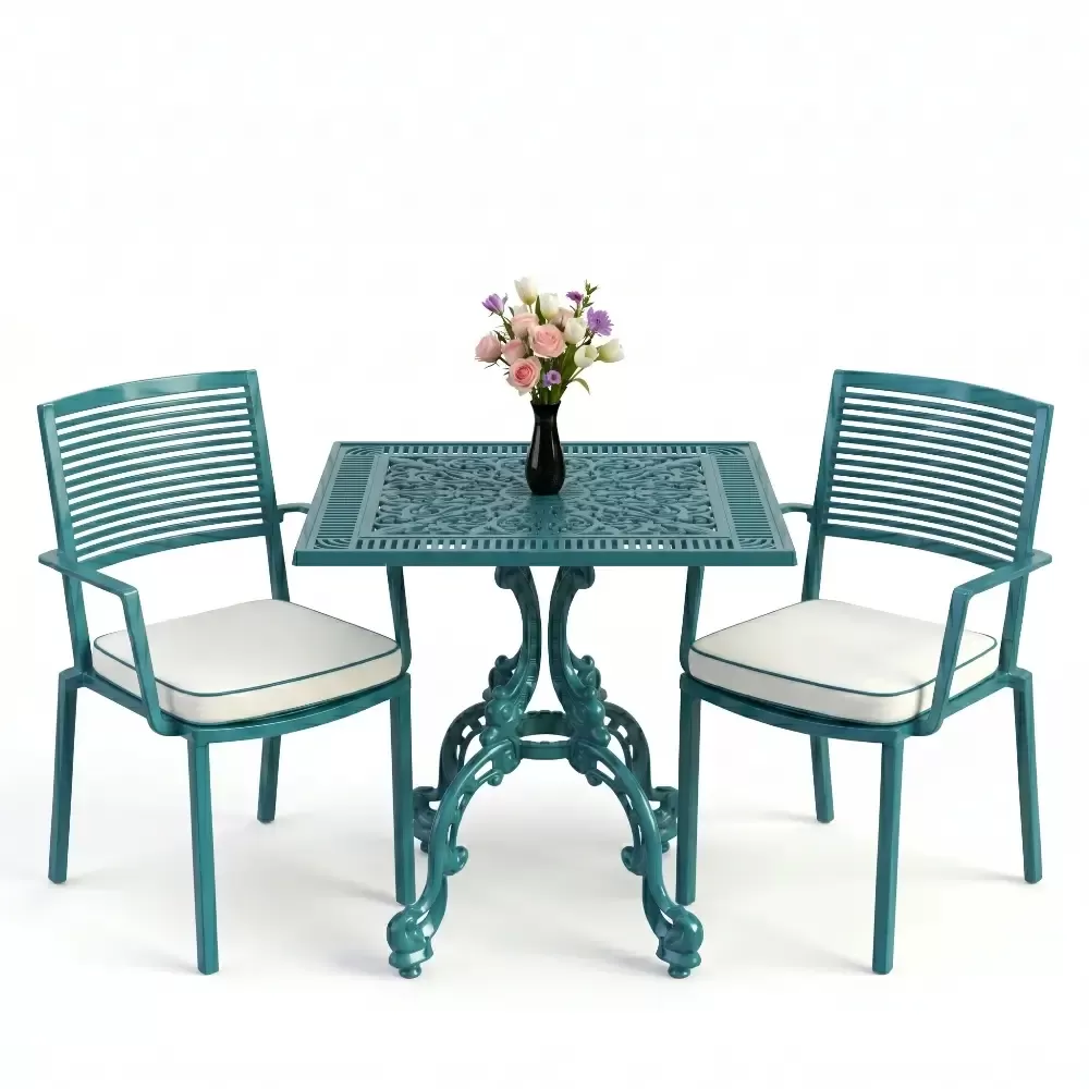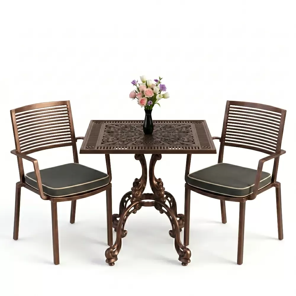 Yüksek kaliteli alüminyum döküm malzemeden üretilen bu takım, doğa şartlarına karşı tam direnç gösterecek şekilde tasarlanmıştır. Demir mobilyaların aksine paslanma ve korozyon riski barındırmaz. Elektrostatik fırın boya teknolojisi ile desteklenen yüzey dokusu; UV ışınlarına, aşırı sıcaklara ve nemli ortamlara karşı üstün koruma sağlayarak ürünün ilk günkü zarafetini uzun yıllar boyunca korumasına yardımcı olur.
