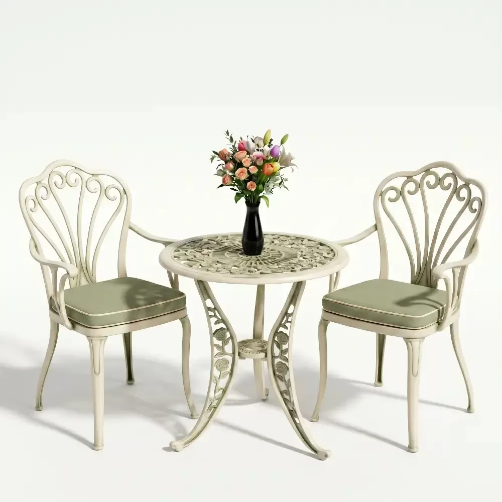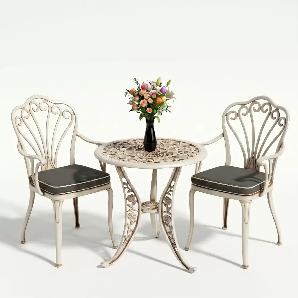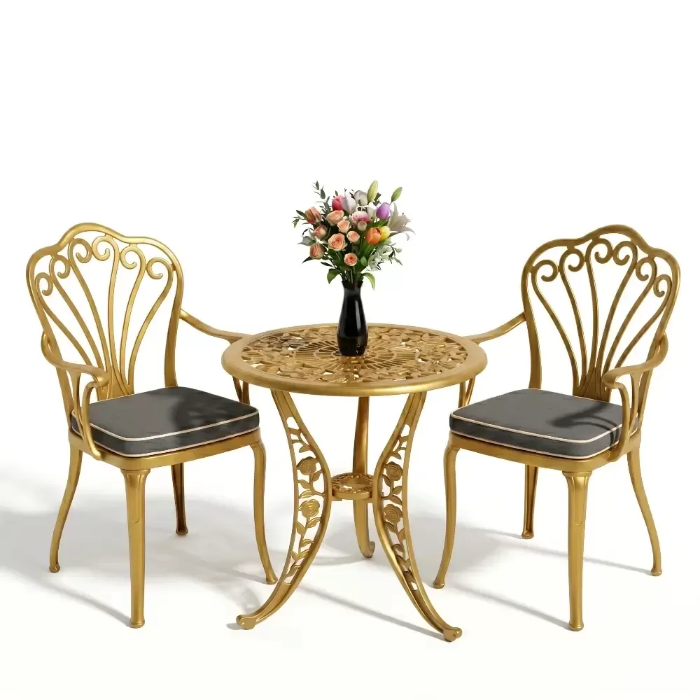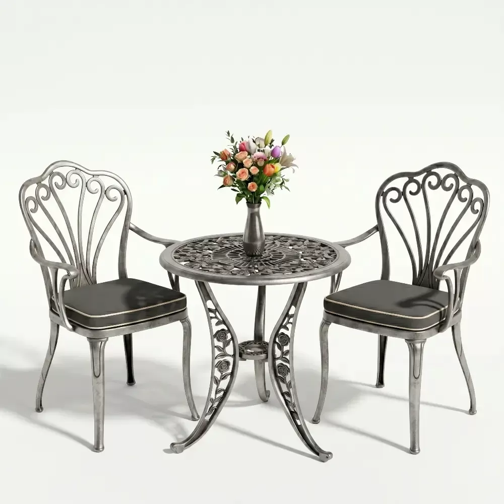 Yüksek kaliteli alüminyum döküm malzemeden üretilen bu takım, doğa şartlarına karşı tam direnç gösterecek şekilde tasarlanmıştır. Demir mobilyaların aksine paslanma ve korozyon riski barındırmaz. Elektrostatik fırın boya teknolojisi ile desteklenen yüzey dokusu; UV ışınlarına, aşırı sıcaklara ve nemli ortamlara karşı üstün koruma sağlayarak ürünün ilk günkü zarafetini uzun yıllar boyunca korumasına yardımcı olur.