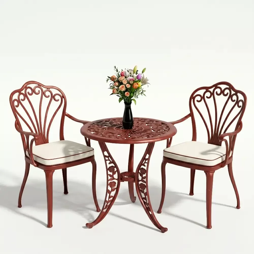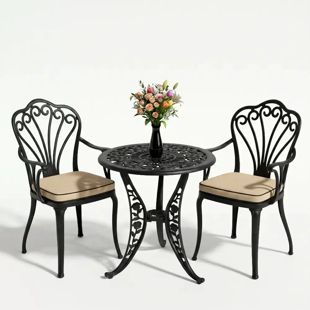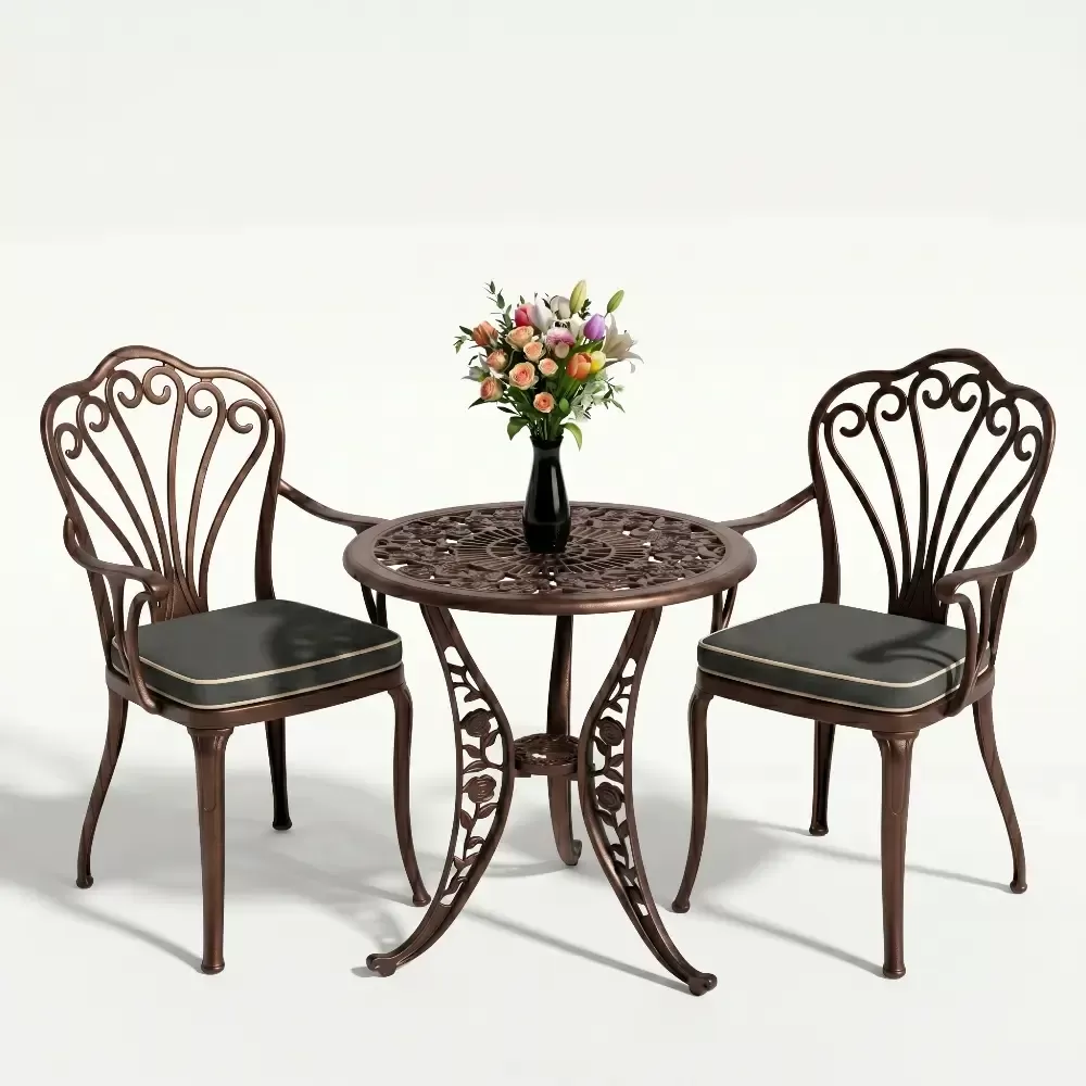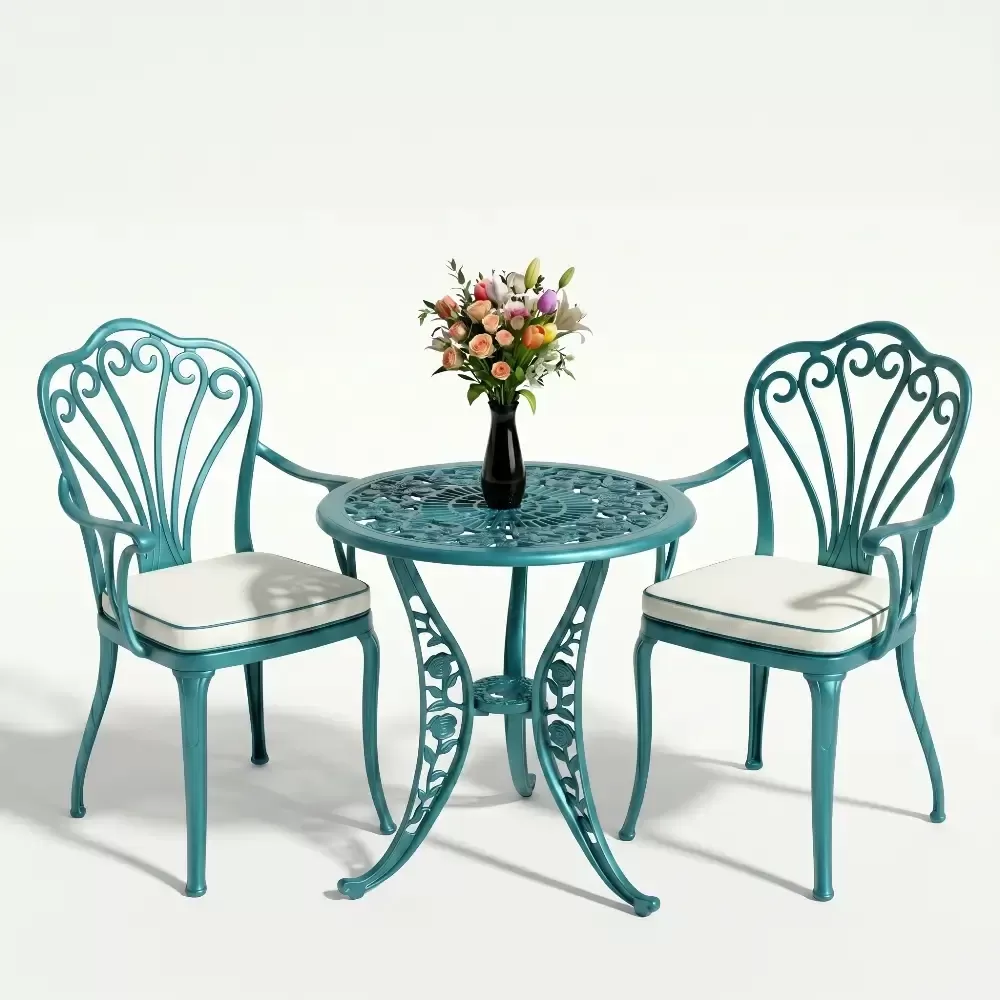Yüksek kaliteli alüminyum döküm malzemeden üretilen bu takım, doğa şartlarına karşı tam direnç gösterecek şekilde tasarlanmıştır. Demir mobilyaların aksine paslanma ve korozyon riski barındırmaz. Elektrostatik fırın boya teknolojisi ile desteklenen yüzey dokusu; UV ışınlarına, aşırı sıcaklara ve nemli ortamlara karşı üstün koruma sağlayarak ürünün ilk günkü zarafetini uzun yıllar boyunca korumasına yardımcı olur.