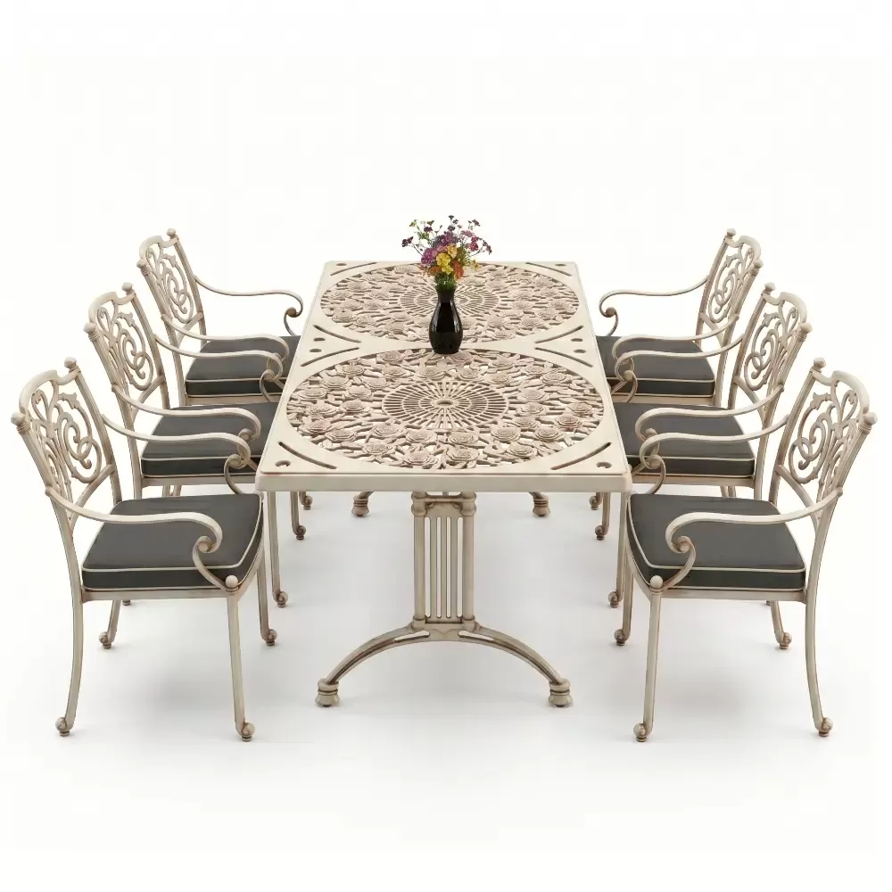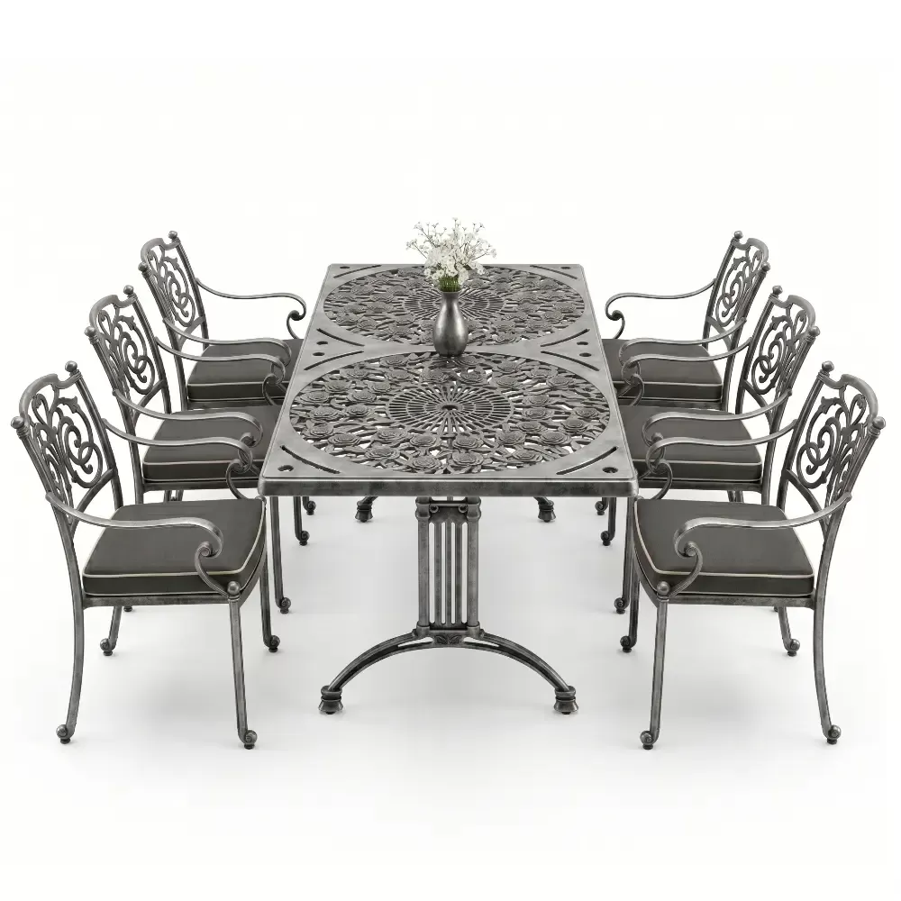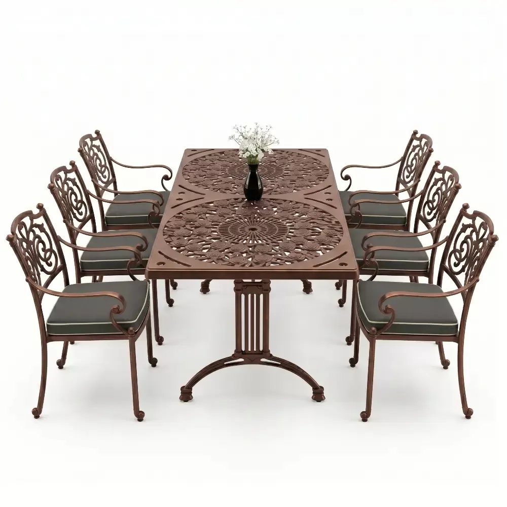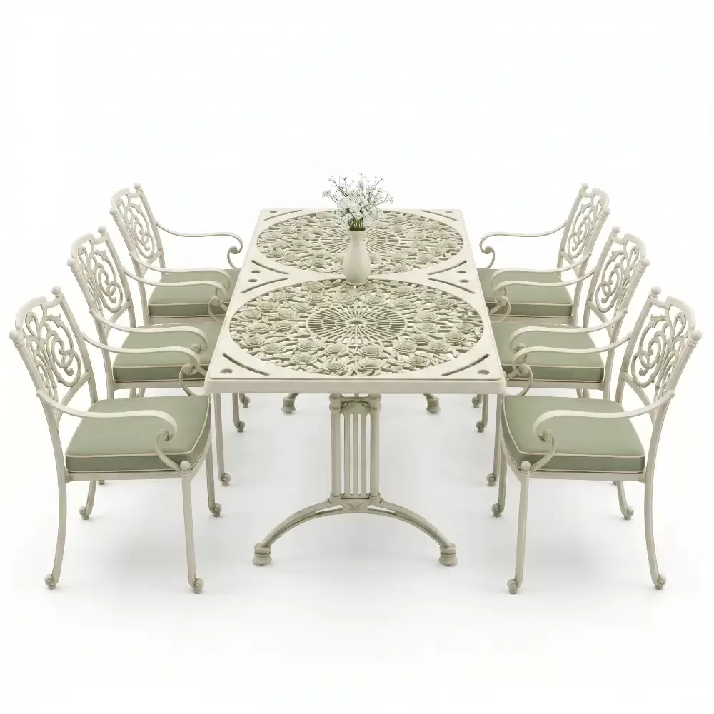 Acik hava yasam alanlarinizi birer sanat eserine donusturmek uzere tasarlanan 97 MHS dikdortgen yemek grubu, klasik ferforje hatlarini modern aluminyum dokum teknolojisiyle bulusturuyor. Alti kisilik genis oturma kapasitesi ve ergonomik yapisiyla Akbrella kalitesini her detayda hissettiren bu set, bahce, balkon ve teraslarinizda sadece bir mobilya degil, ayni zamanda prestijli bir stil beyani sunuyor. Paslanmaya karsi dogal direnci ve yuksek mukavemeti sayesinde nesiller boyu size eslik etmek uzere uretilmistir.