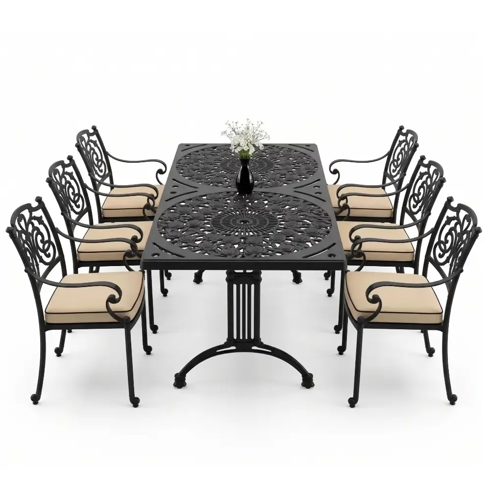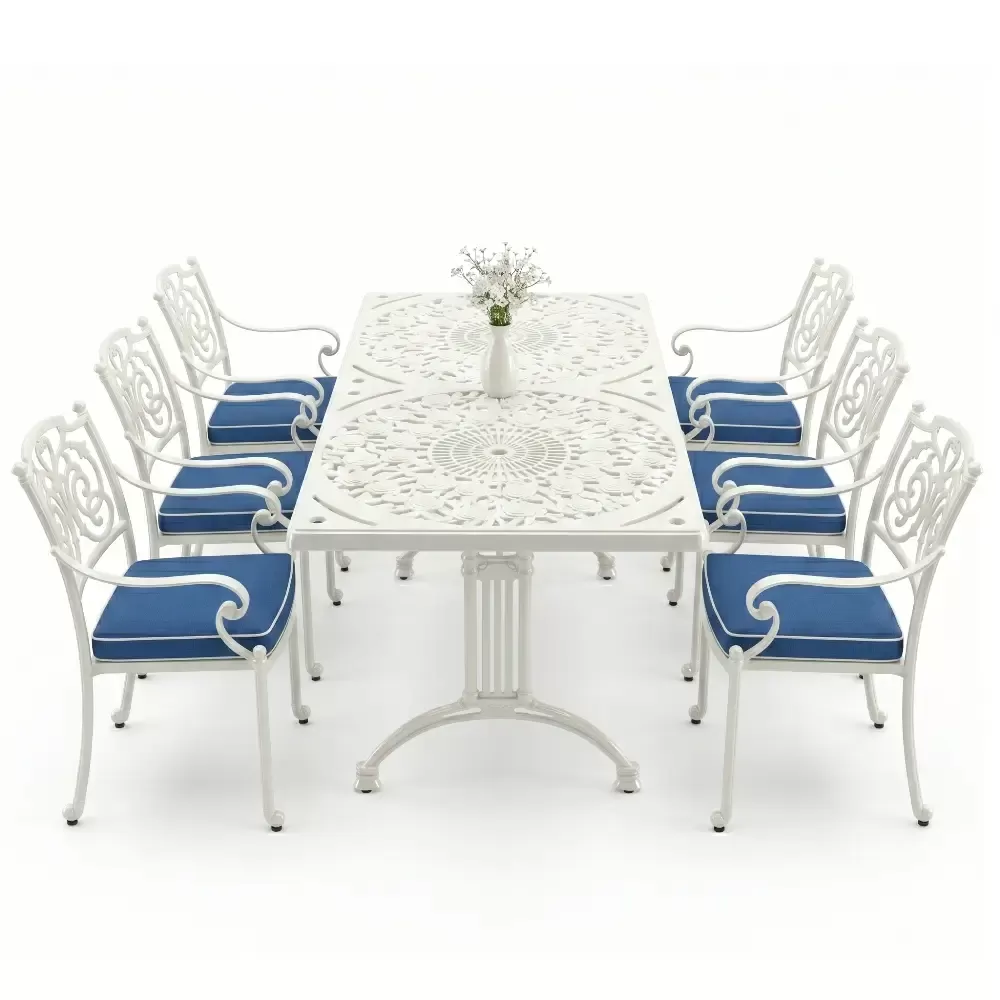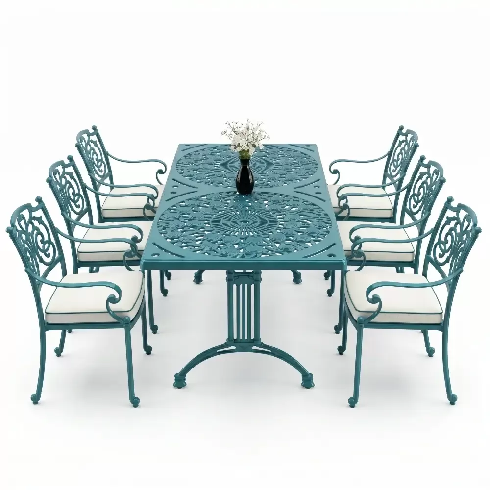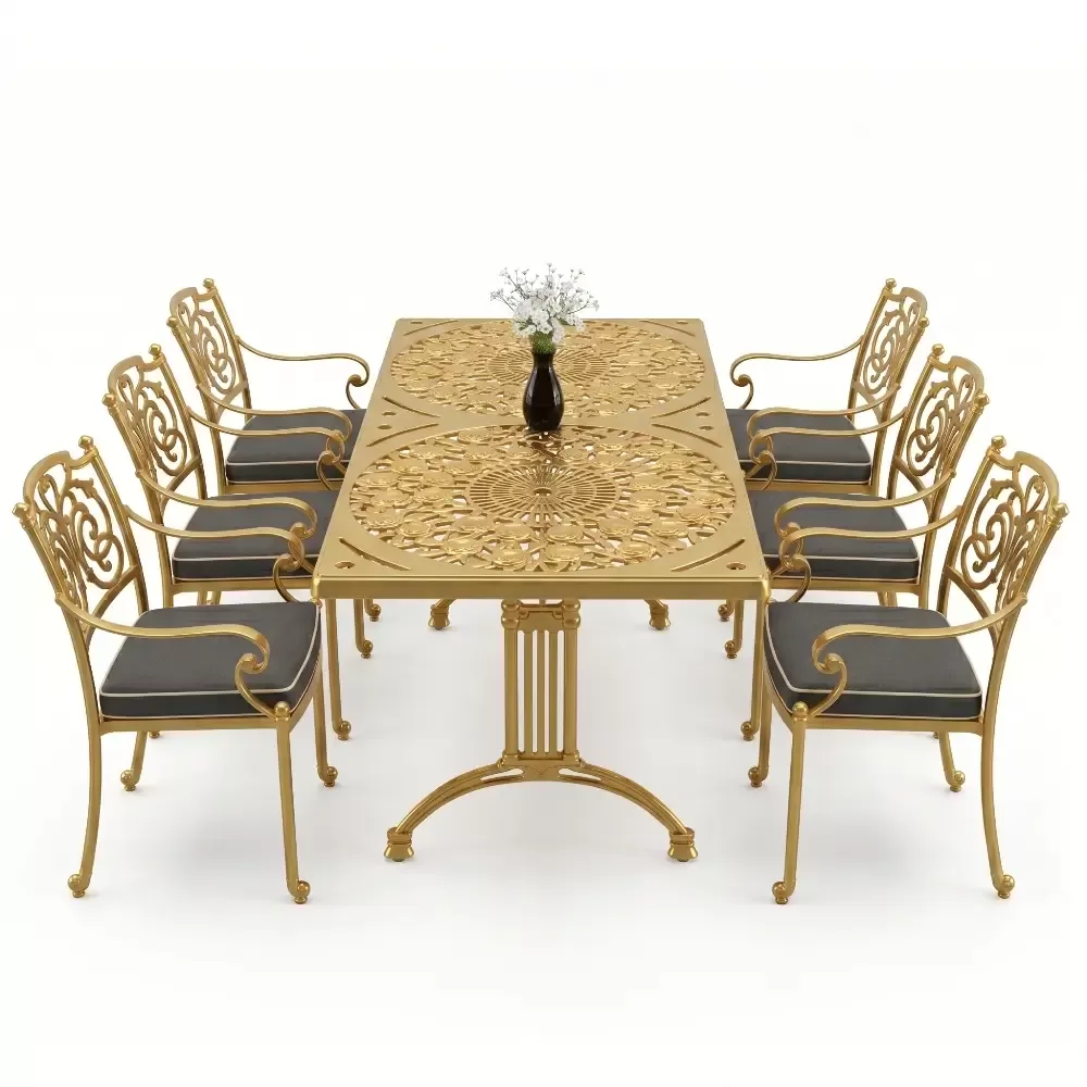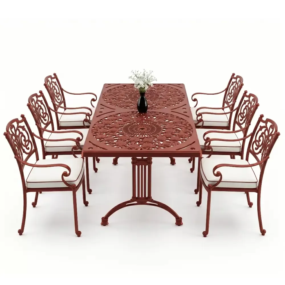 Acik hava yasam alanlarinizi birer sanat eserine donusturmek uzere tasarlanan 97 MHS dikdortgen yemek grubu, klasik ferforje hatlarini modern aluminyum dokum teknolojisiyle bulusturuyor. Alti kisilik genis oturma kapasitesi ve ergonomik yapisiyla Akbrella kalitesini her detayda hissettiren bu set, bahce, balkon ve teraslarinizda sadece bir mobilya degil, ayni zamanda prestijli bir stil beyani sunuyor. Paslanmaya karsi dogal direnci ve yuksek mukavemeti sayesinde nesiller boyu size eslik etmek uzere uretilmistir.